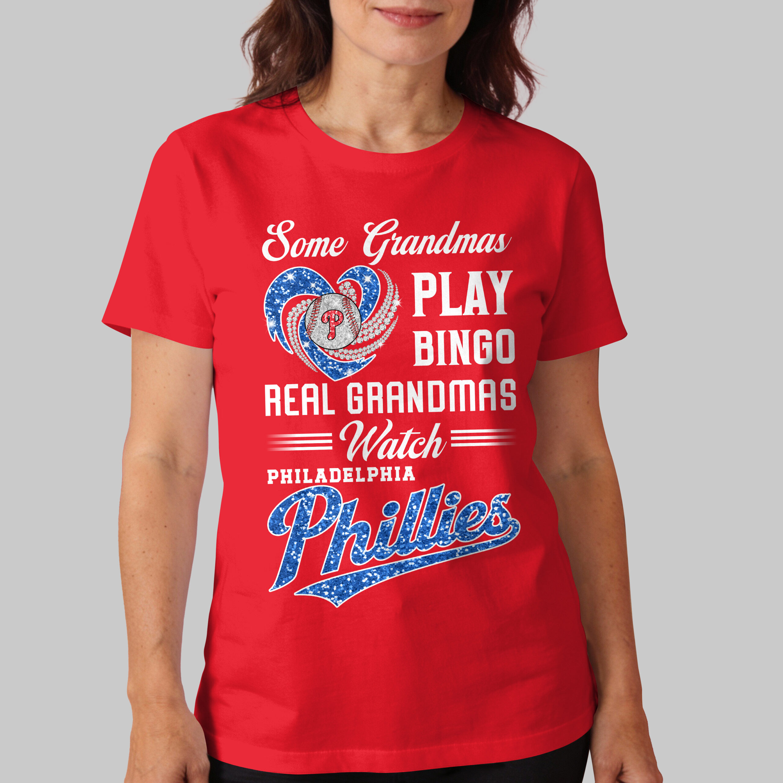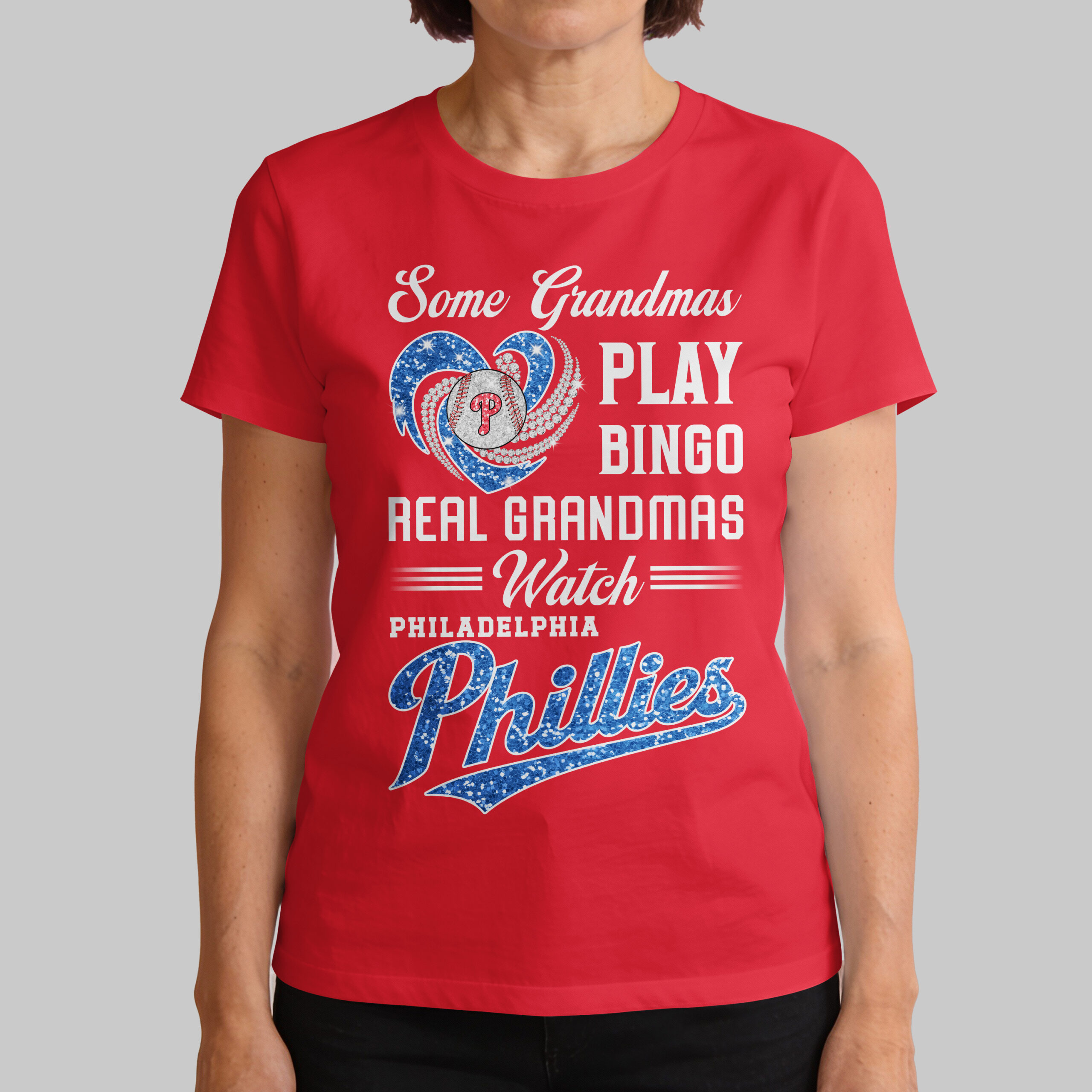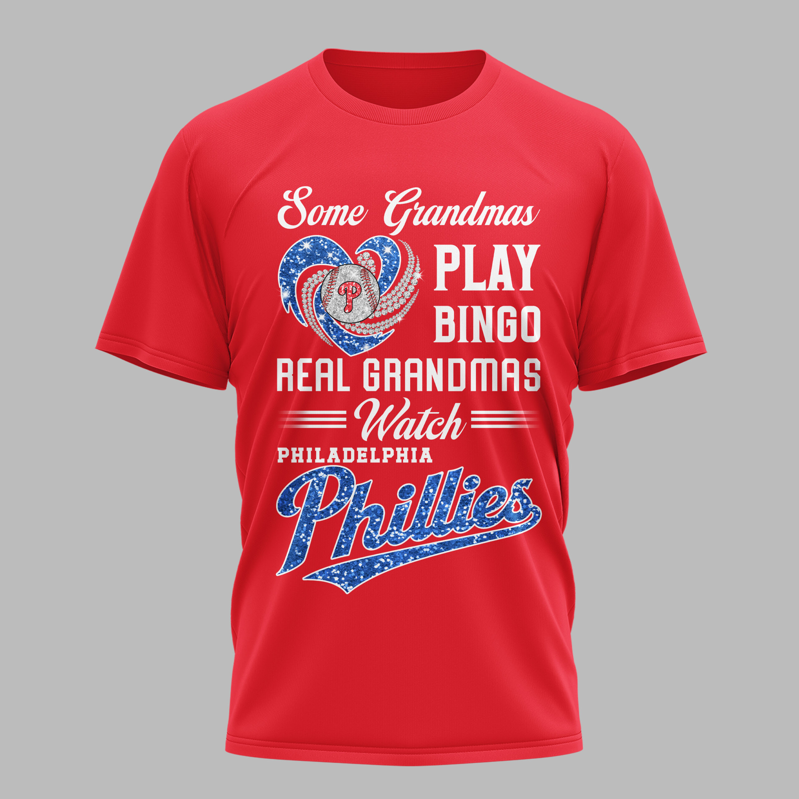 Show off your true passion with this vibrant Real Grandmas Watch Philadelphia Phillies tee! Perfect for the spirited grandmother who knows where the real action is, this shirt celebrates your dedication to the Phillies, proving that game day is always a top priority. It’s more than just a shirt; it’s a statement of unwavering team pride and a loving nod to your favorite baseball team. The design boldly features the fun contrast: Some Grandmas PLAY BINGO, REAL GRANDMAS === Watch === PHILADELPHIA Phillies. A sparkling red glitter heart encircles a classic baseball, proudly displaying the iconic P logo, all adorned with elegant, swirling diamond-like accents. The glittery red Phillies script adds an extra touch of team spirit, making this design truly stand out. Whether you’re cheering from the stands at Citizens Bank Park, hosting a lively watch party, or simply running errands around town, this shirt is your go-to for showcasing your Phillies loyalty. It’s the perfect gift for any baseball-loving grandma or a treat for yourself to wear on game days and beyond, letting everyone know your heart belongs to Philadelphia baseball!