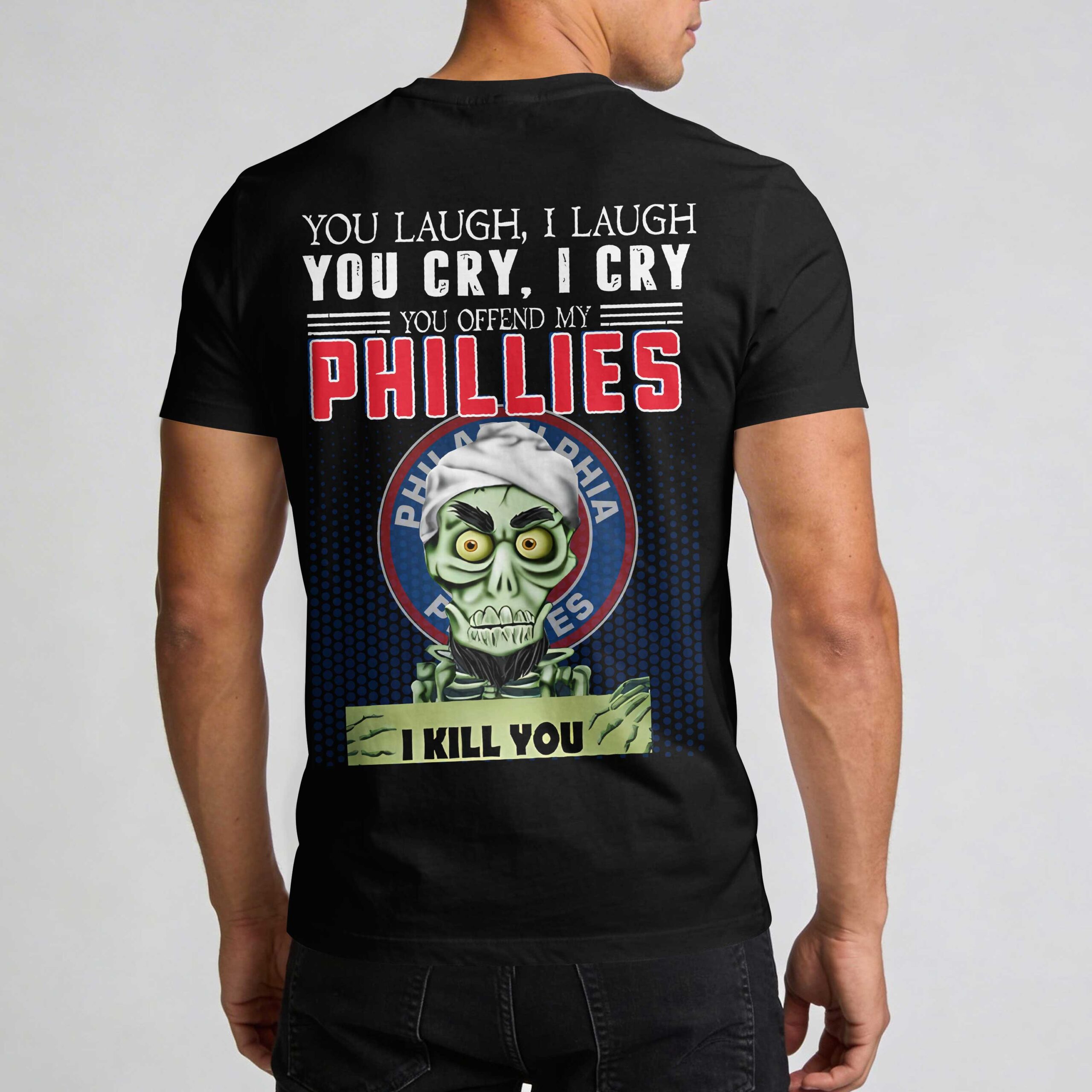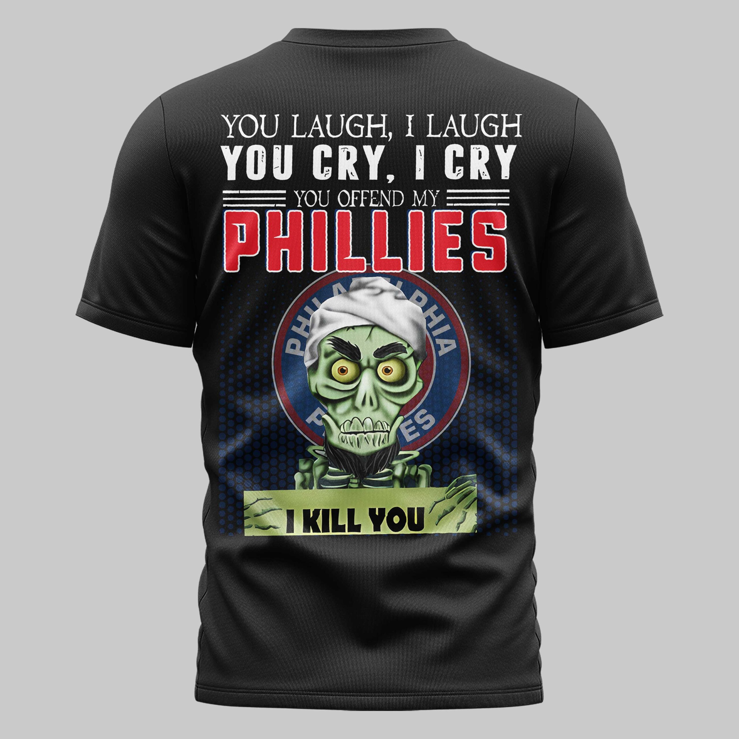 Show off your undying loyalty to the City of Brotherly Love with this bold Philadelphia Phillies t-shirt. Perfect for the most dedicated fans, this piece combines fierce team spirit with a touch of defiant humor, making it an essential addition to your collection. Whether you are celebrating the nation’s heritage during a big anniversary or cheering for a pennant run, this shirt represents the gritty passion that defines Philadelphia baseball culture. The front features the classic red ‘P’ logo on the chest, a timeless symbol of team pride. On the back, the design takes it to the next level with a bold message: You Offend My Phillies, I Kill You. Accompanied by a spirited character graphic set against a circular team backdrop, it makes it clear that you stand by your team through thick and thin. Rock this shirt at the ballpark, local viewing parties, or during Independence Day festivities. It is built for those who live and breathe every inning, providing a standout look for game day or casual everyday fan wear.