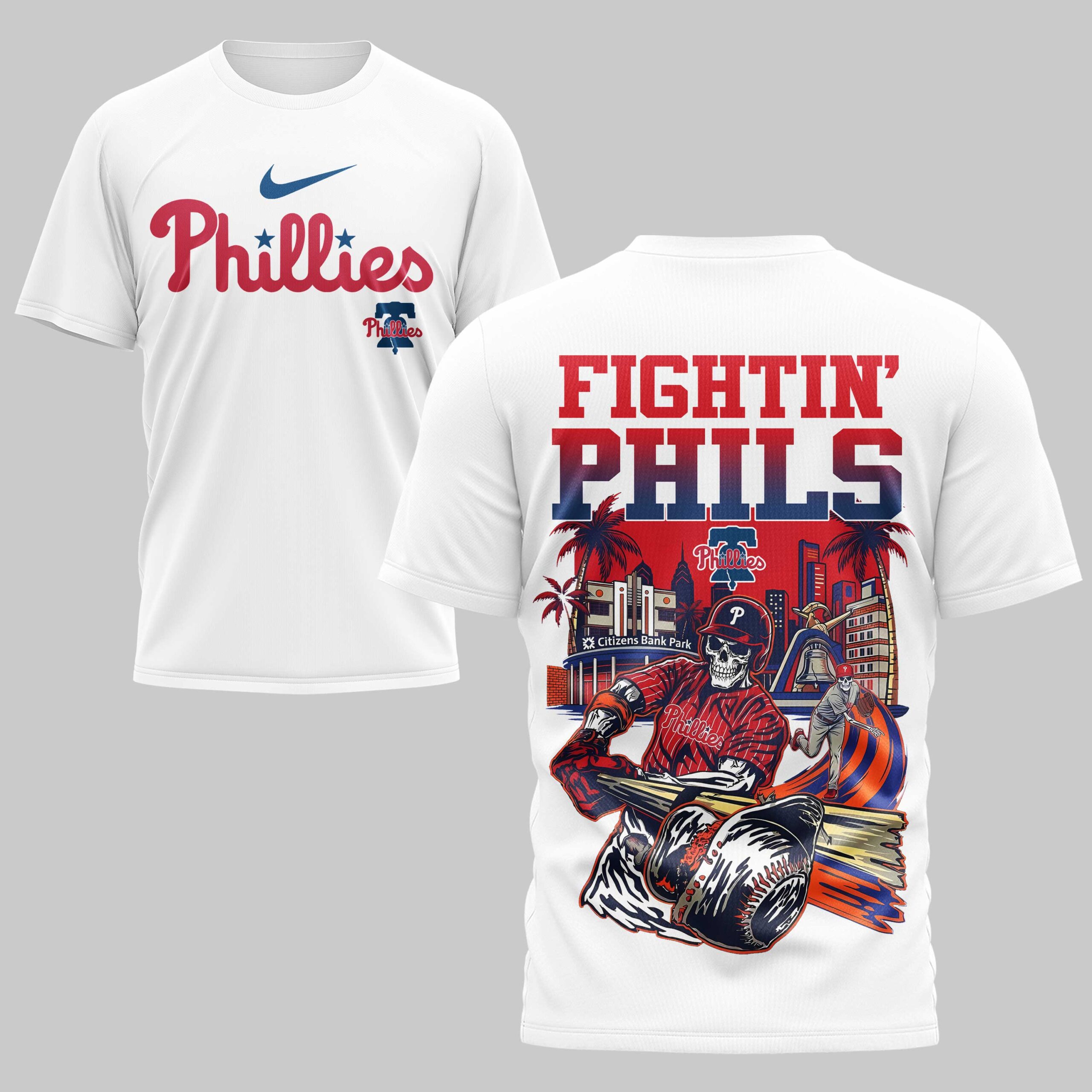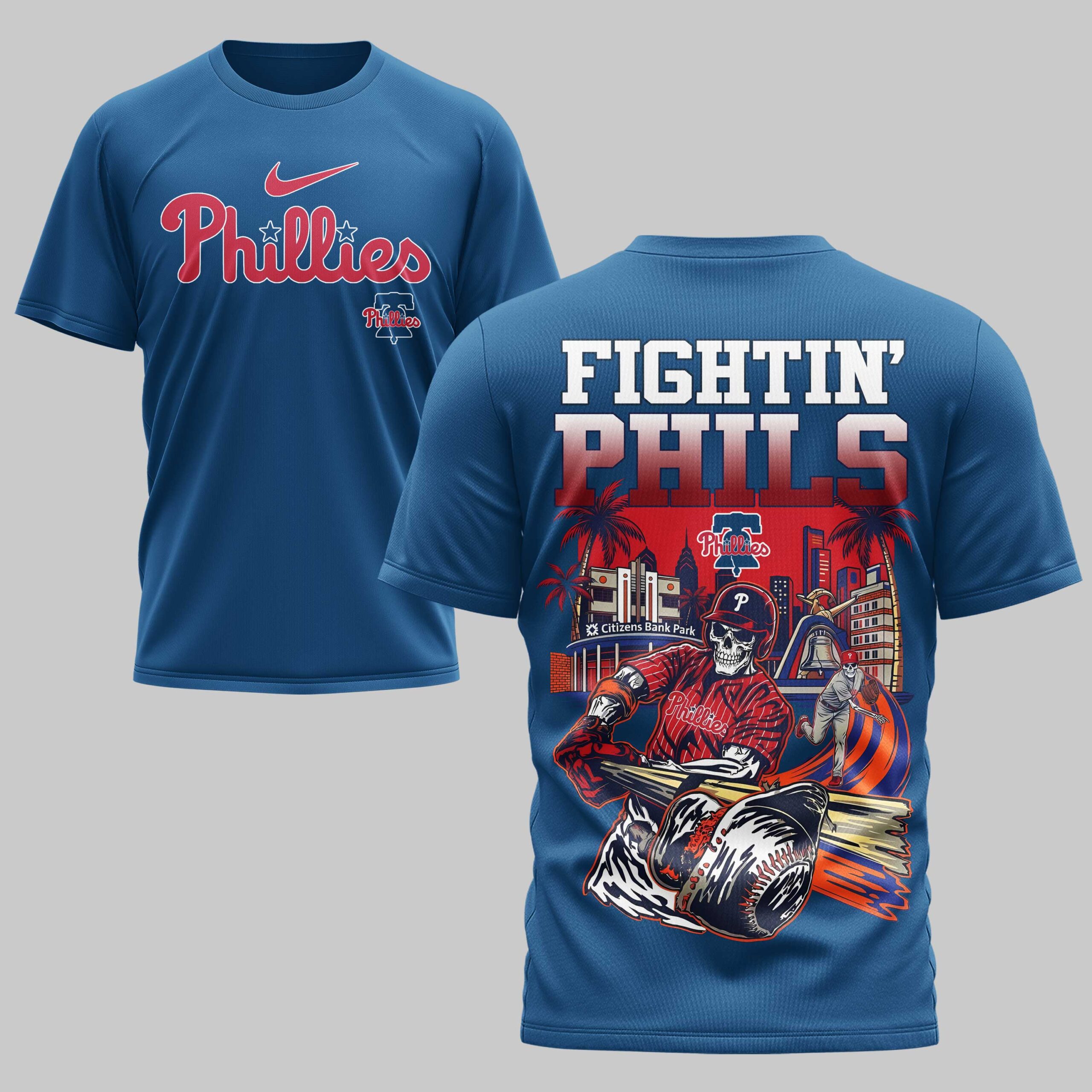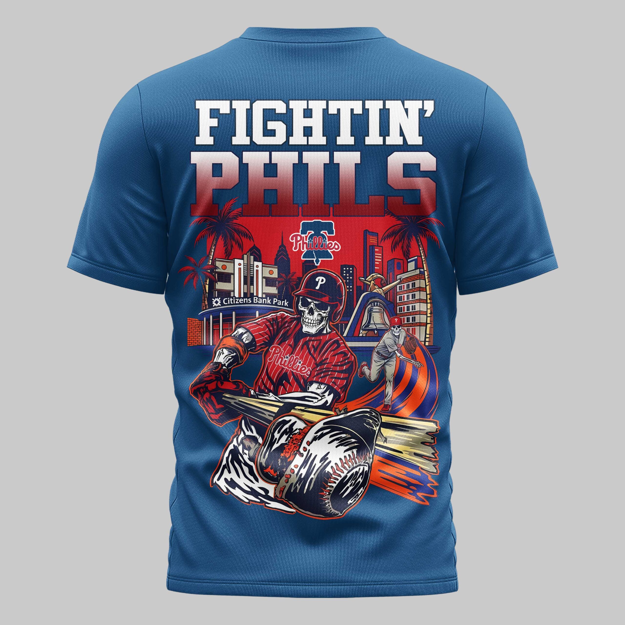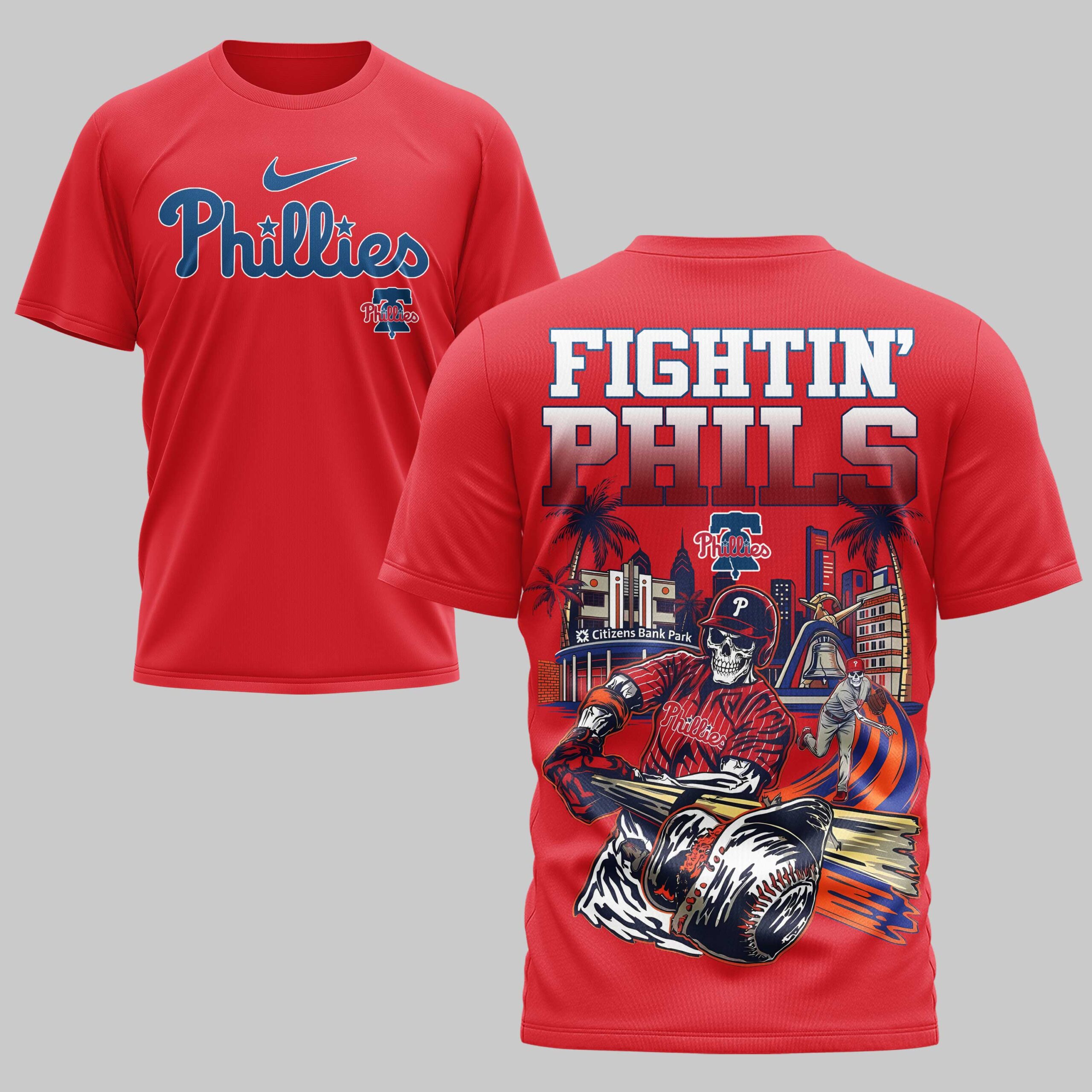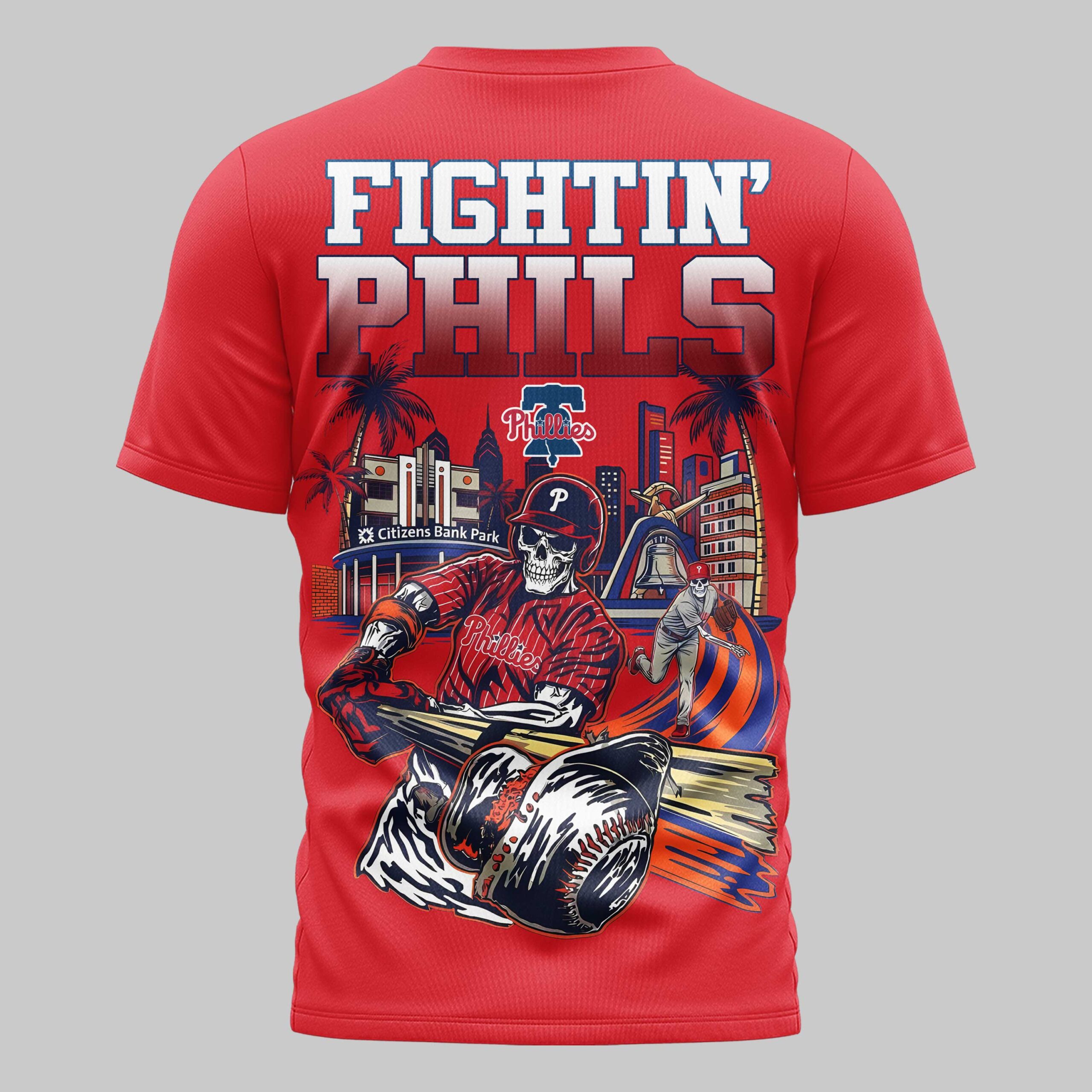 Show off your Philly pride with this high-energy Phillies fan shirt, perfectly blending team spirit with a bold American aesthetic. This design celebrates the relentless drive of the Fightin’ Phils while honoring the patriotic heritage of the City of Brotherly Love. It’s an essential piece for any die-hard fan looking to represent their team with unmatched intensity. The front showcases the iconic Phillies script and Liberty Bell insignia. The back features a massive, action-packed graphic under the FIGHTIN’ PHILS banner. A gritty skeleton slugger is captured mid-swing against a detailed backdrop of Citizens Bank Park and the Philadelphia skyline. The vibrant red, white, and blue color palette brings the entire celebratory scene to life. This shirt is built for gameday at the ballpark, Independence Day celebrations, or everyday wear around town. It’s the perfect way to display your loyalty during patriotic holidays and throughout the season. Wear it proud and let everyone know you stand with Philadelphia.