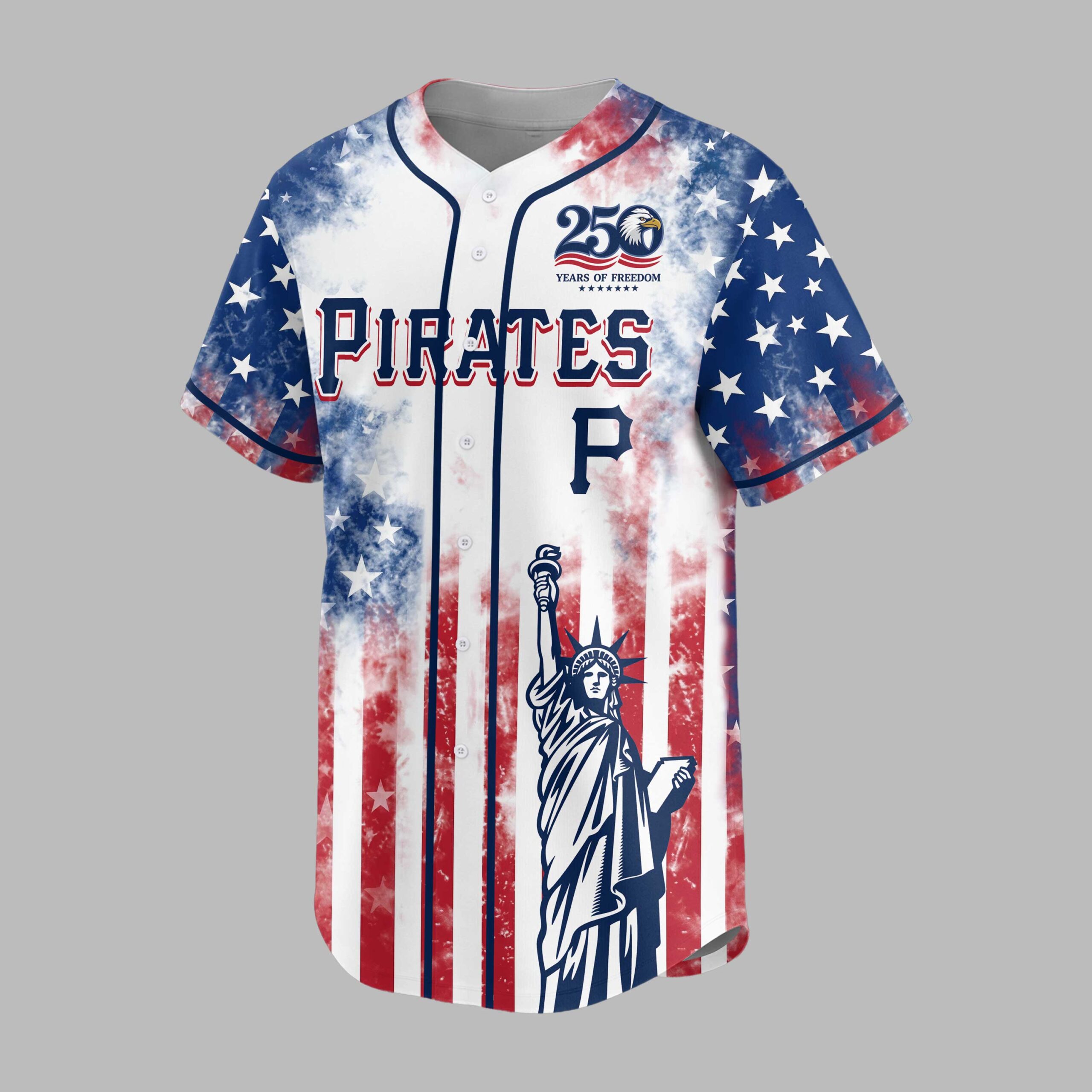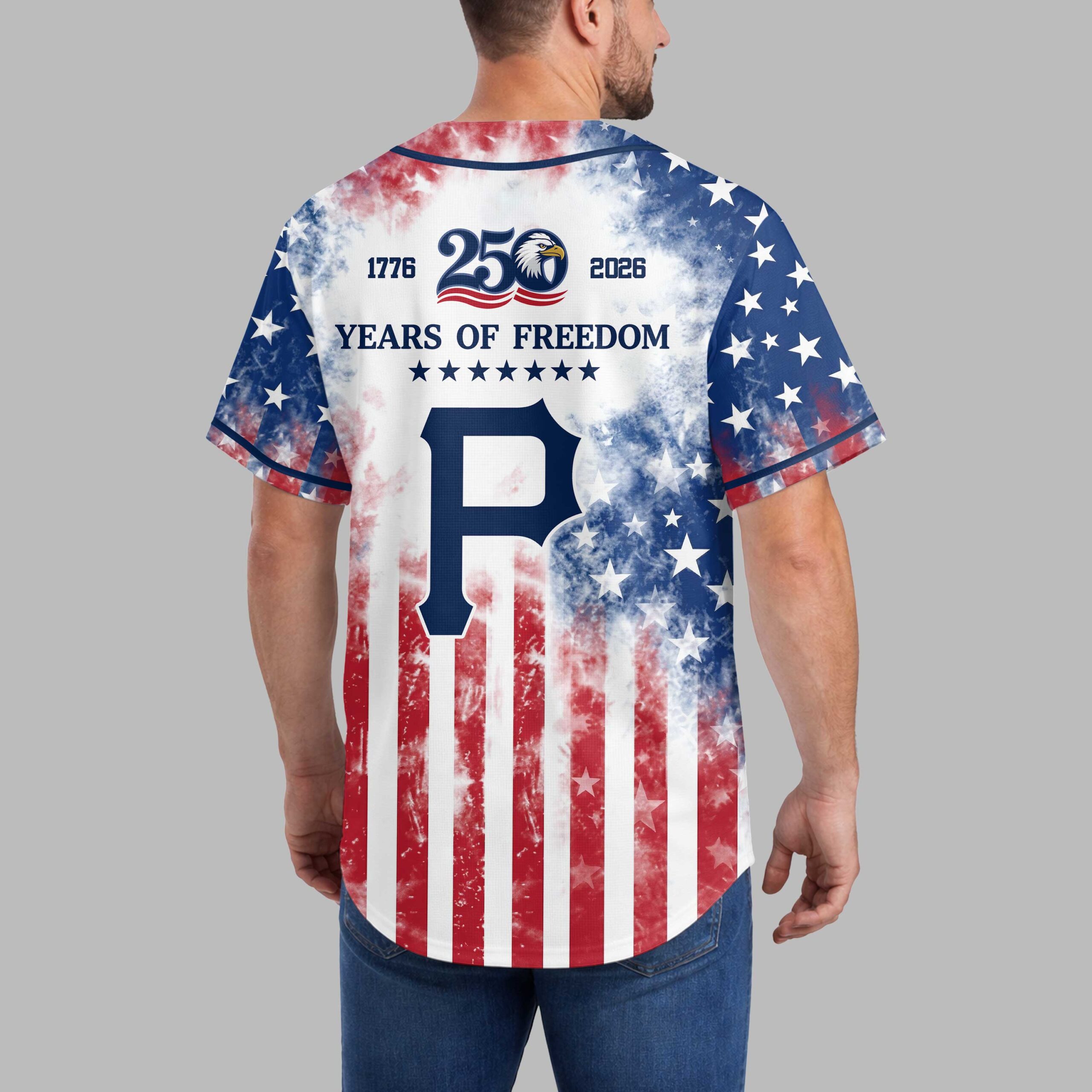 Celebrate American heritage and team spirit with this striking baseball jersey! Perfect for fans who embody national pride, this shirt commemorates 250 Years of Freedom from 1776 to 2026, blending a love for country with an undeniable passion for the Pirates. The jersey features a dynamic distressed American flag design with bold red and white stripes and a field of white stars on a blue background. The front proudly displays PIRATES and a large P, alongside a majestic Statue of Liberty and the special 250 Years of Freedom emblem with an eagle. The back echoes this powerful message with the same anniversary emblem and a prominent P logo. This unique jersey is ideal for game days, Fourth of July celebrations, Memorial Day, or any occasion where you want to show off your patriotism and team loyalty. Wear it to the ballpark, family barbecues, or community events to stand out and honor both your favorite team and the enduring spirit of American liberty.