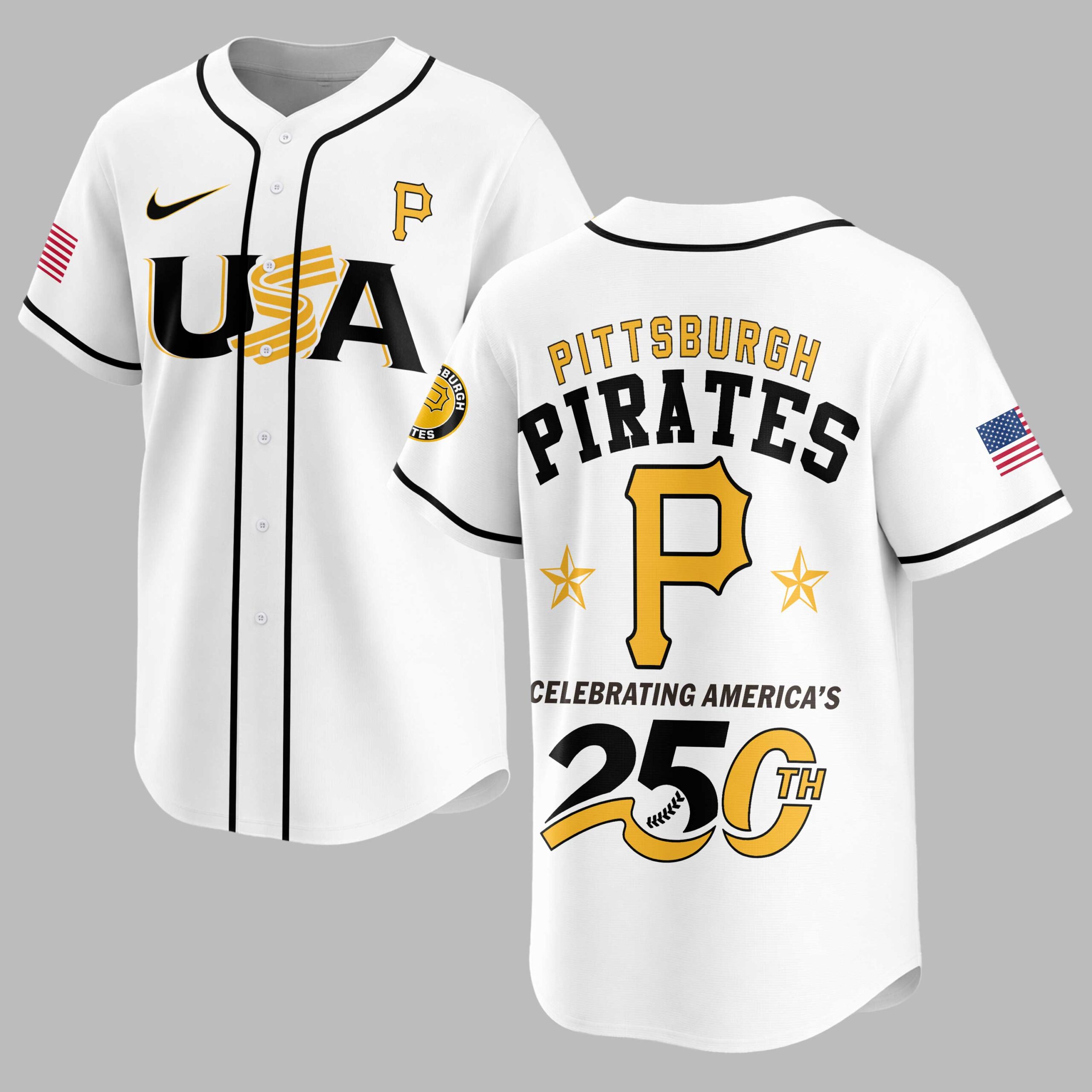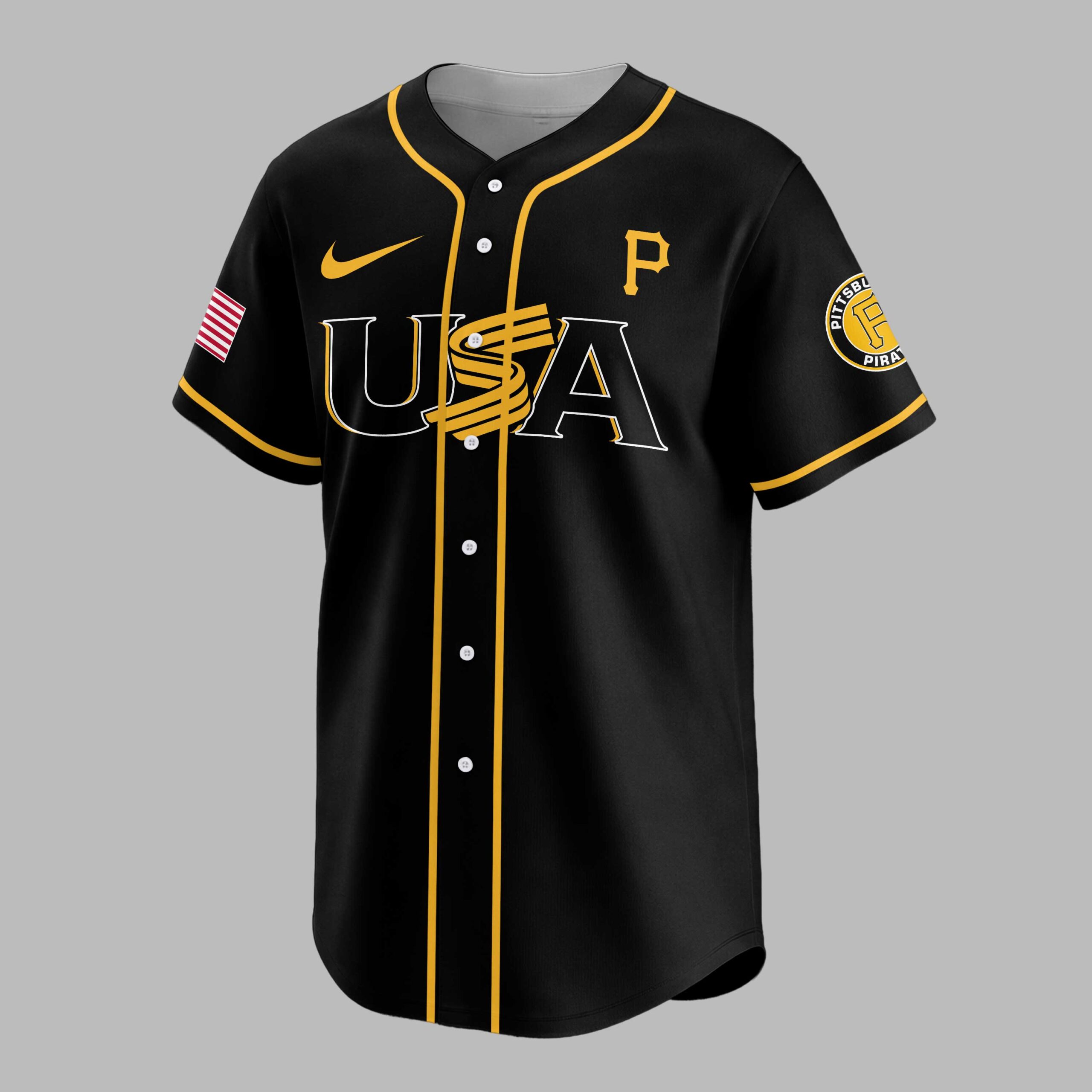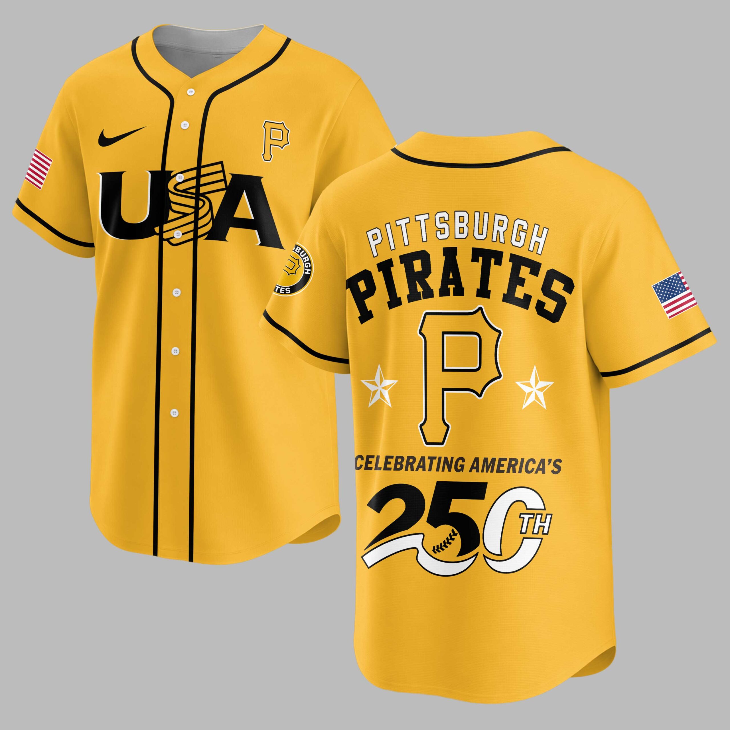 Unite your passion for baseball and country with this dynamic Pittsburgh Pirates 250th Anniversary USA Baseball Jersey! This vibrant gold jersey celebrates both your favorite team and a monumental moment in American history, perfect for fans who stand with both the Pirates and the USA. It’s more than just fan gear; it’s a proud statement of heritage and team spirit. The front proudly displays USA in bold black lettering, cleverly integrated with a baseball bat design, alongside a classic Pittsburgh Pirates P logo and an American flag patch on the sleeve. Turn around to reveal PITTSBURGH PIRATES prominently arched across the back, with a large P logo and two stars, all underscored by CELEBRATING AMERICA’S 250TH in a striking design featuring baseball stitching around the number 250. Perfect for cheering on the Pirates at the ballpark, celebrating patriotic holidays like the Fourth of July, or simply showing your national and team pride every day. Wear it to a backyard BBQ, a community event, or anywhere you want to display your allegiance to both your team and your nation in unmistakable style.
