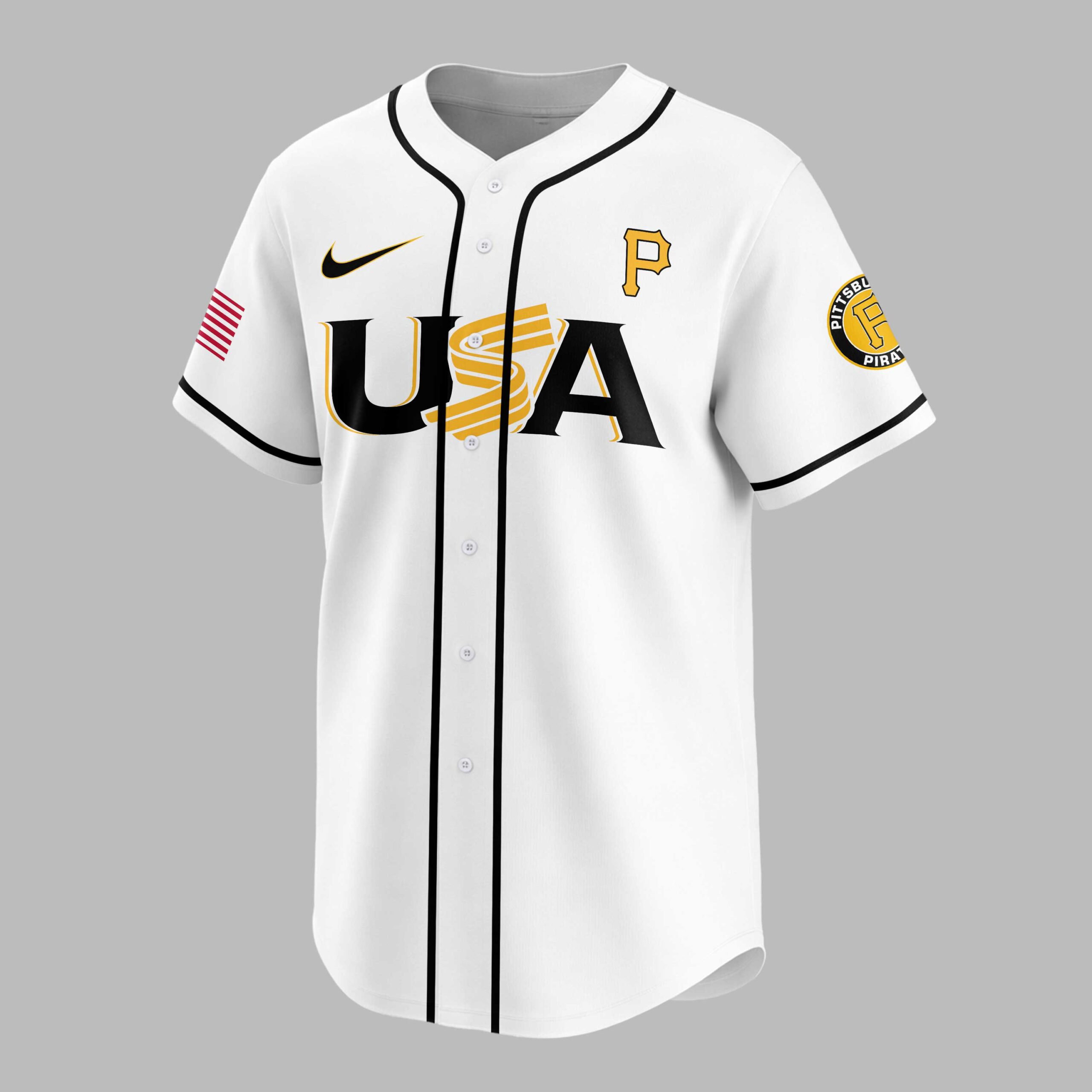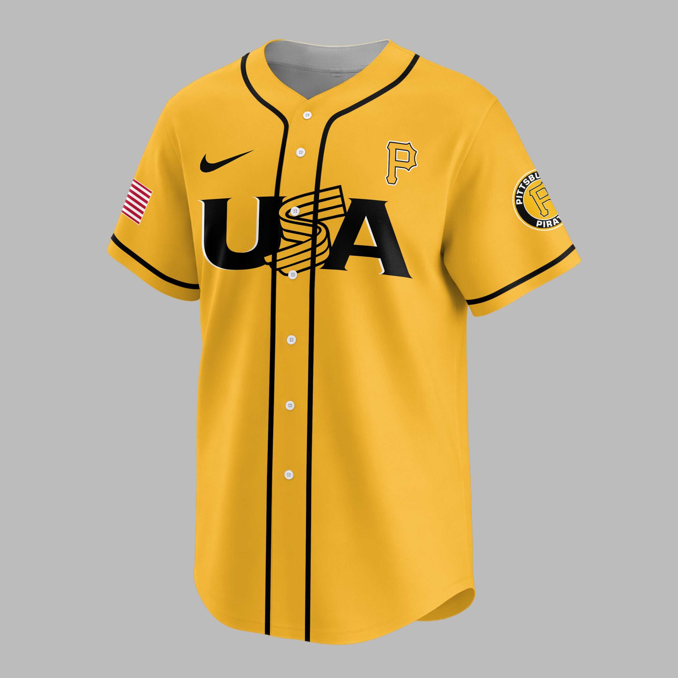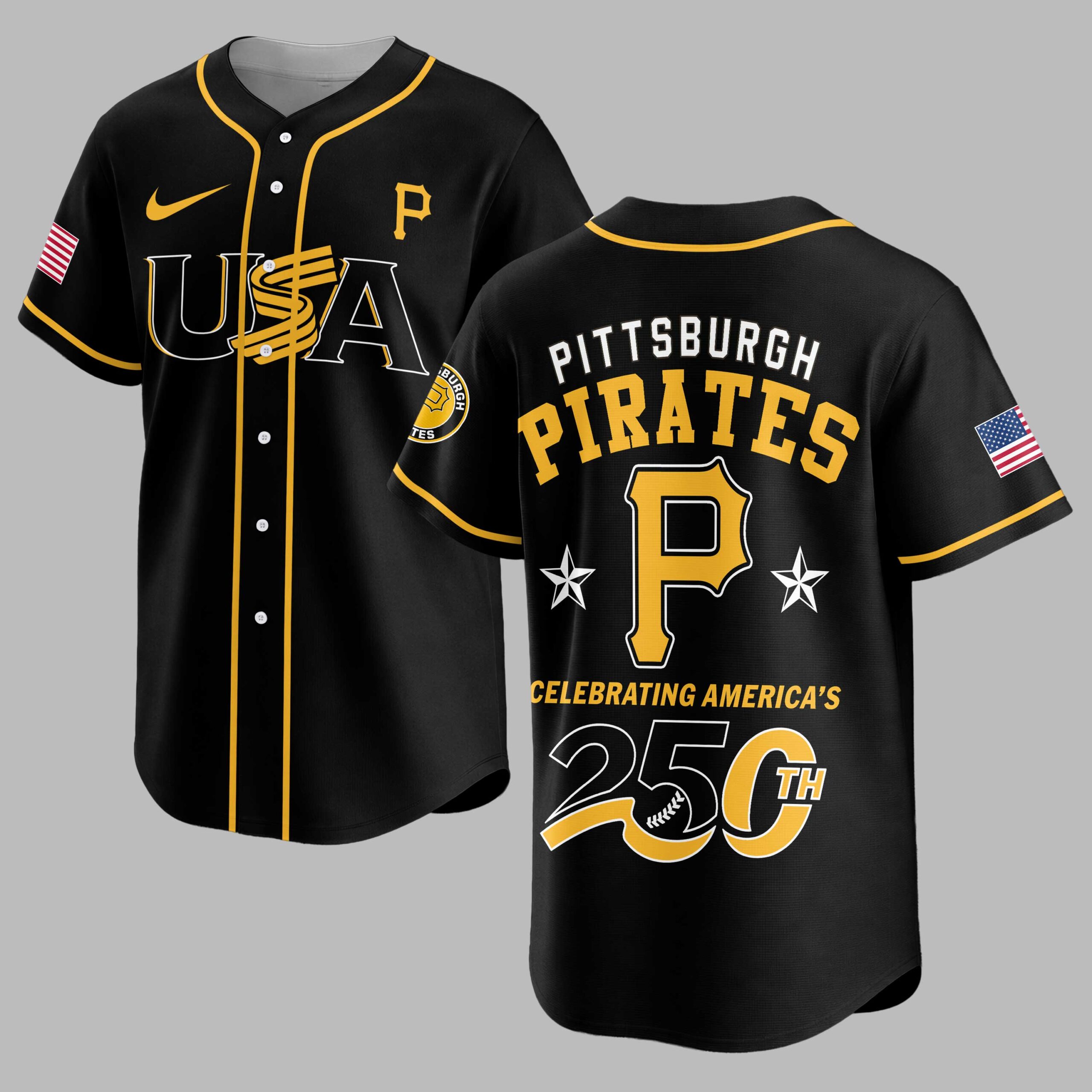 Unite your passion for baseball and country with this dynamic Pittsburgh Pirates 250th Anniversary USA Baseball Jersey! This vibrant gold jersey celebrates both your favorite team and a monumental moment in American history, perfect for fans who stand with both the Pirates and the USA. It’s more than just fan gear; it’s a proud statement of heritage and team spirit. The front proudly displays USA in bold black lettering, cleverly integrated with a baseball bat design, alongside a classic Pittsburgh Pirates P logo and an American flag patch on the sleeve. Turn around to reveal PITTSBURGH PIRATES prominently arched across the back, with a large P logo and two stars, all underscored by CELEBRATING AMERICA’S 250TH in a striking design featuring baseball stitching around the number 250. Perfect for cheering on the Pirates at the ballpark, celebrating patriotic holidays like the Fourth of July, or simply showing your national and team pride every day. Wear it to a backyard BBQ, a community event, or anywhere you want to display your allegiance to both your team and your nation in unmistakable style.