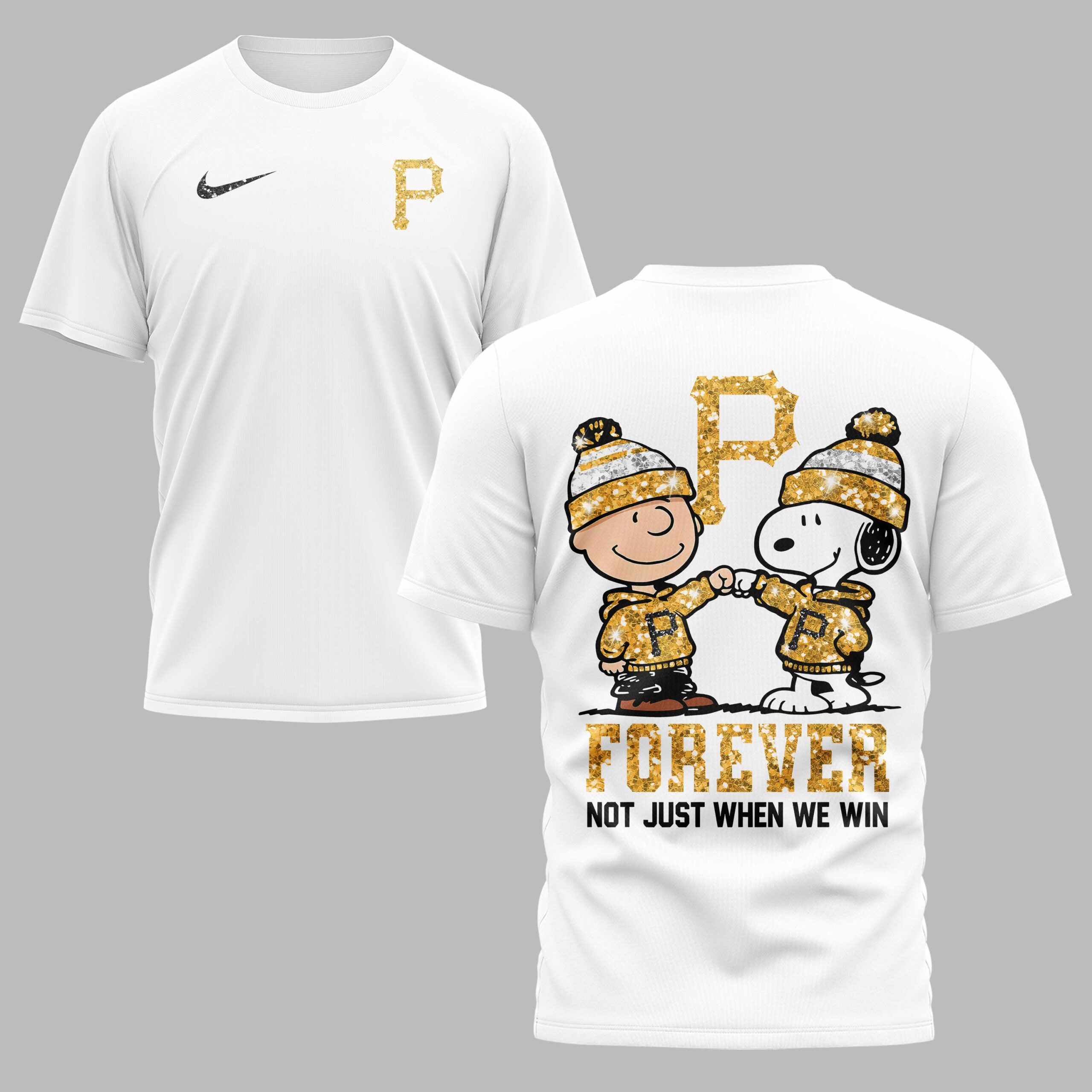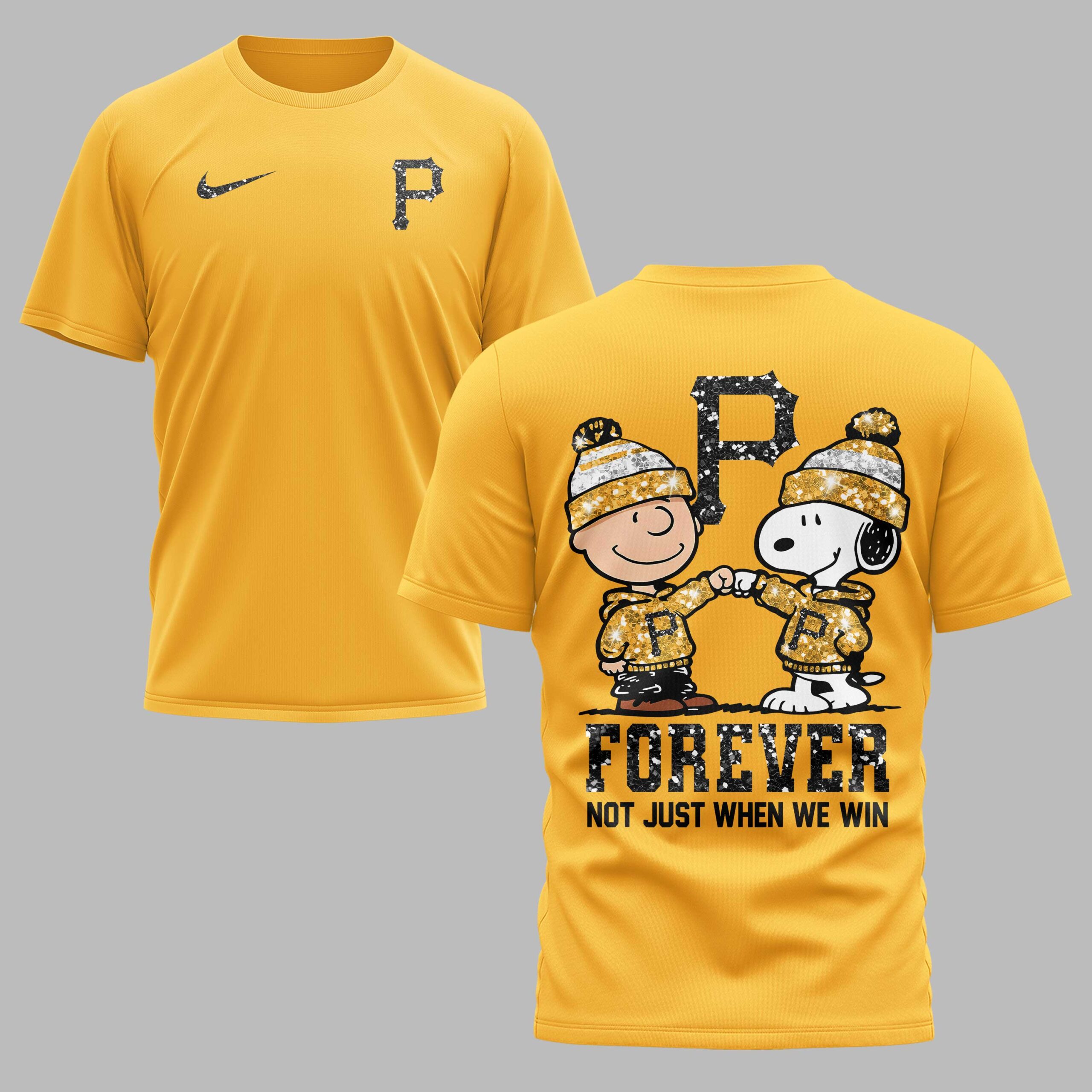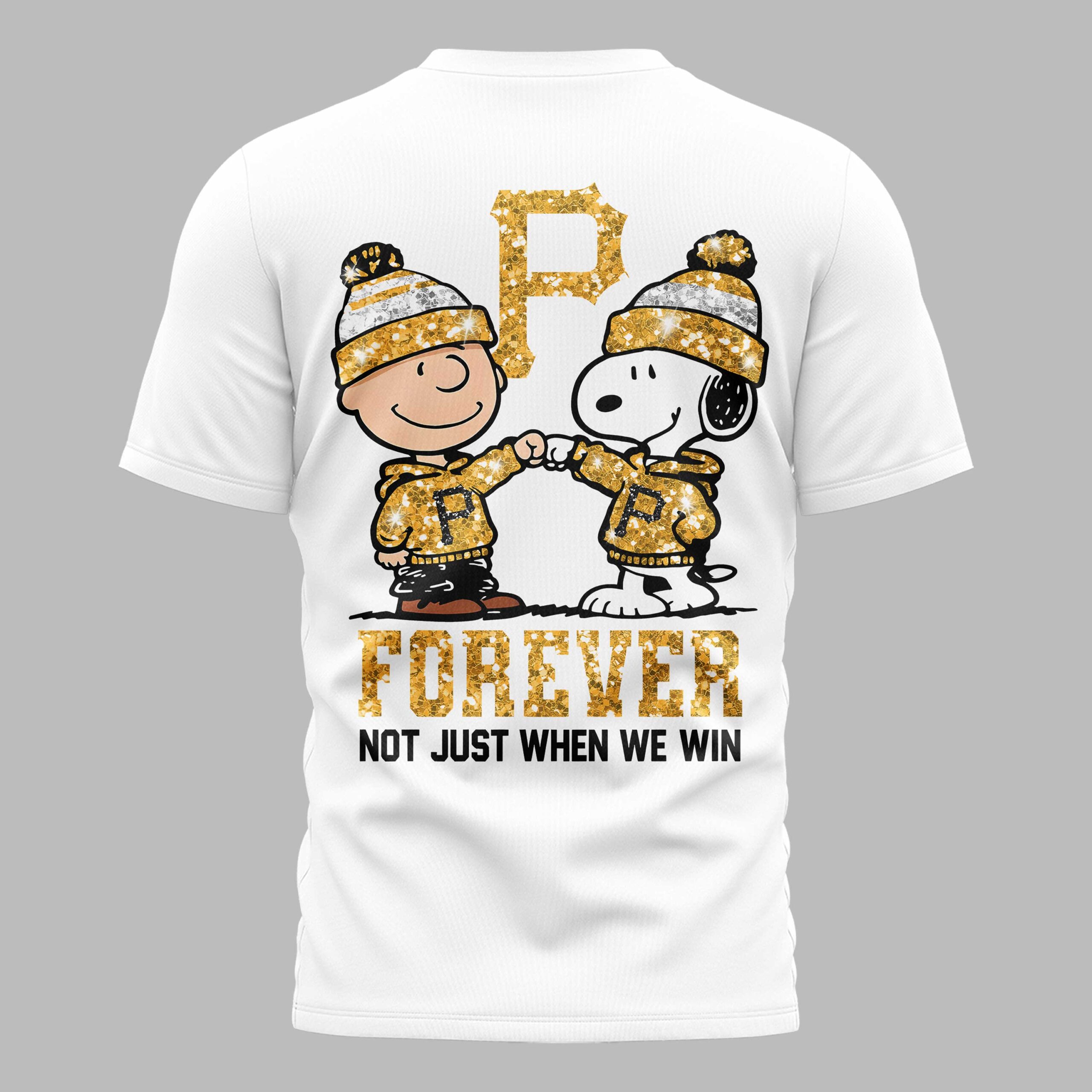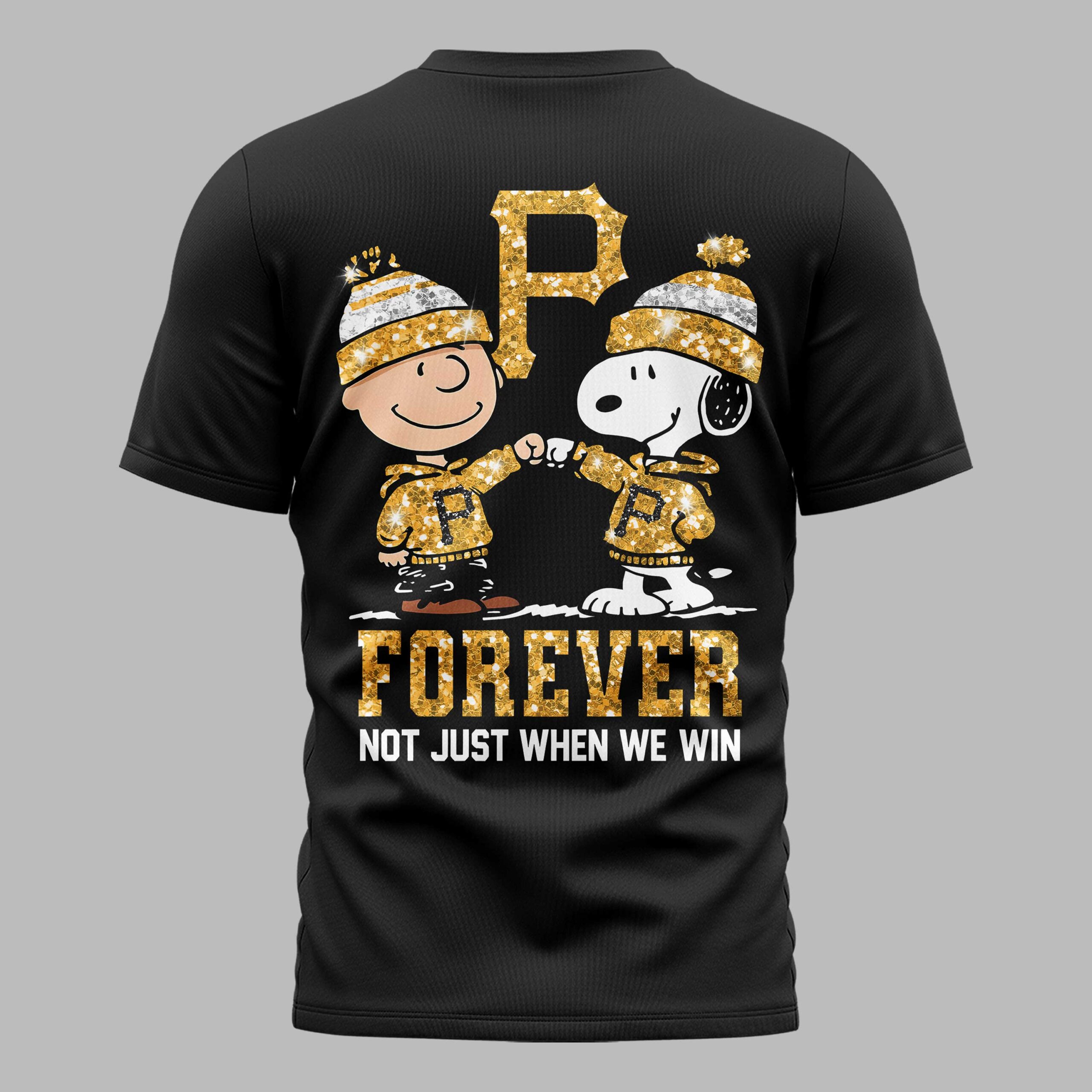 Show off your undying loyalty to the Steel City with this Pittsburgh Pirates fan t-shirt. This design perfectly captures the spirit of being a true fan, celebrating a lifelong commitment to the legendary black and gold. It’s a standout choice for those who proudly stand by their team through every single inning of the season, no matter the score. The front of the shirt features a sharp, gold-glitter style P logo paired with a classic athletic swoosh. On the back, you’ll find a heartwarming graphic of Charlie Brown and Snoopy sharing a fist bump, both fully decked out in Pirates gear. The bold, glittering FOREVER text and the meaningful phrase NOT JUST WHEN WE WIN highlight the deep-rooted dedication shared by the Pittsburgh faithful. Whether you’re heading to the ballpark to catch a home game or joining friends for Independence Day celebrations, this shirt is the perfect fit. It is ideal for game days, summer outings, or simply showing your Pittsburgh pride every day.