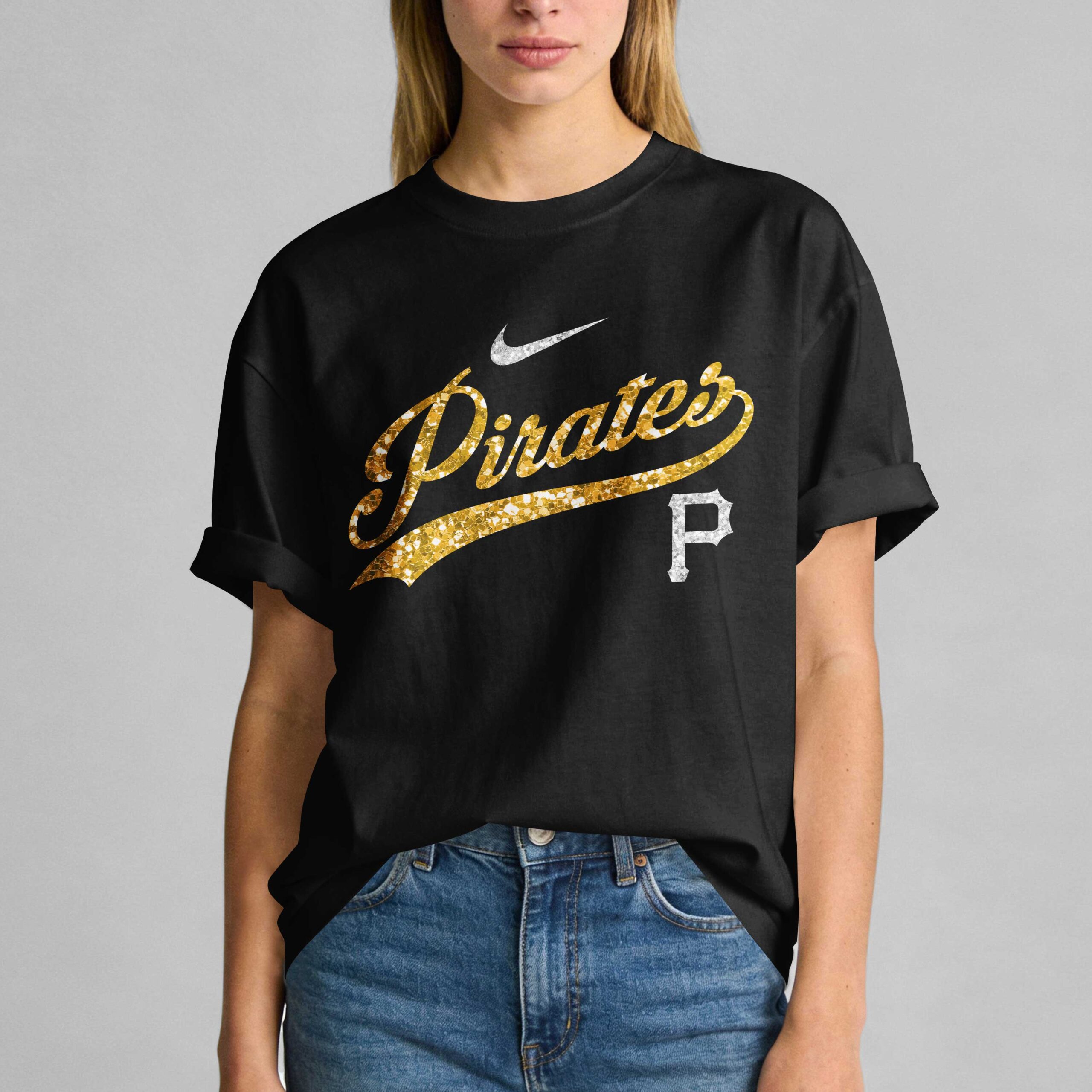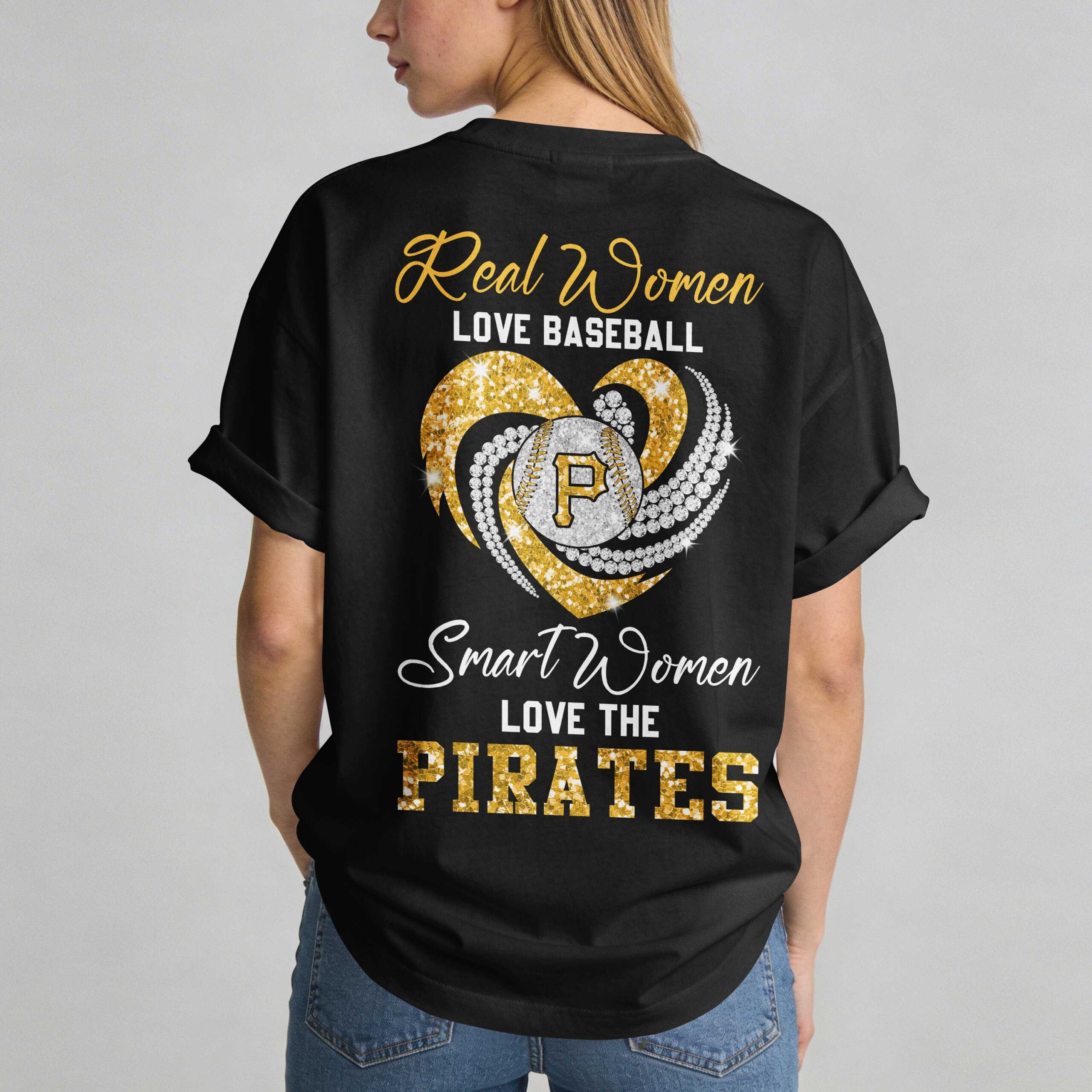 Show your unwavering love for America’s favorite pastime and your Pittsburgh Pirates with this dazzling fan tee! Designed for real women who live and breathe baseball, it’s the perfect way to display your team spirit with sparkle and confidence. The front proudly features the iconic Pirates script in shimmering gold glitter, with a white P logo. The back design showcases a stunning heart, split with gold glitter and dazzling rhinestone accents, centered by the unmistakable Pirates P logo. Boldly declaring Real Women LOVE BASEBALL and Smart Women LOVE THE PIRATES in matching glitter. This spirited tee is ideal for cheering on the Pirates at the ballpark, hosting game day parties, or showcasing your fandom daily. Perfect for casual outings or enjoying a sunny afternoon, wear your Pirates pride loudly and proudly.