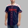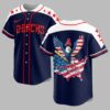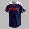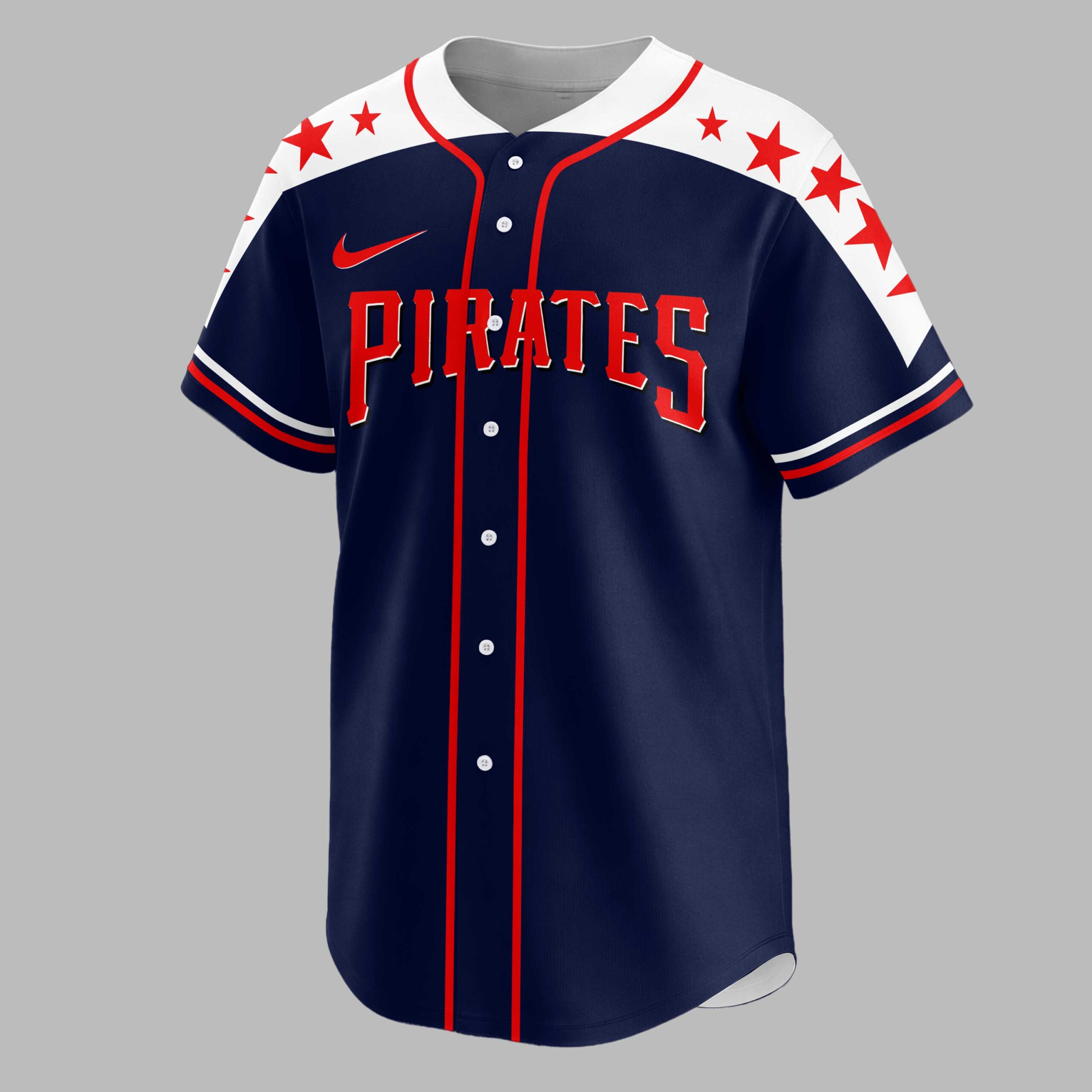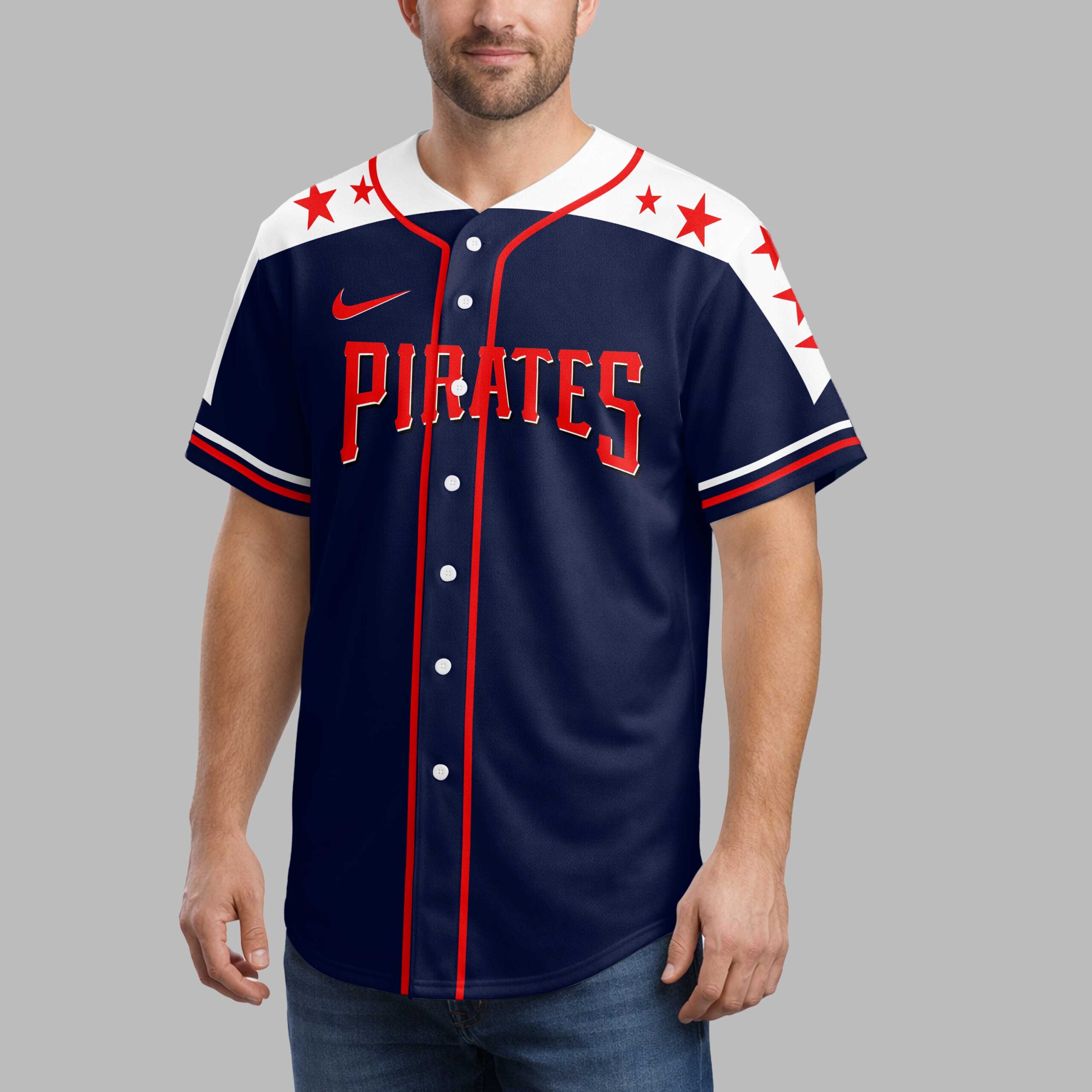 Show your unwavering team spirit and American pride with this bold Pirates baseball jersey! Perfect for fans who live and breathe baseball, this shirt lets you represent your favorite team while celebrating the red, white, and blue. It’s more than just a jersey; it’s a statement of loyalty and a shout-out to Pirates Country wherever you go. The front proudly displays PIRATES in striking red lettering across a navy blue backdrop, complemented by crisp white accents and patriotic red stars on the shoulders. The back is a true masterpiece, featuring a majestic bald eagle with American flag-patterned wings, clutching a baseball bat and ball, all set against a map of the USA draped in the stars and stripes. PIRATES COUNTRY is boldly emblazoned below, reinforcing your dual pride. This patriotic jersey is an absolute must-have for game days, tailgates, and watch parties. Wear it to the ballpark to cheer on your Pirates, or sport it during Fourth of July celebrations, Memorial Day gatherings, or any occasion where you want to combine your love for baseball and country. It’s designed for passionate fans ready to make a statement.