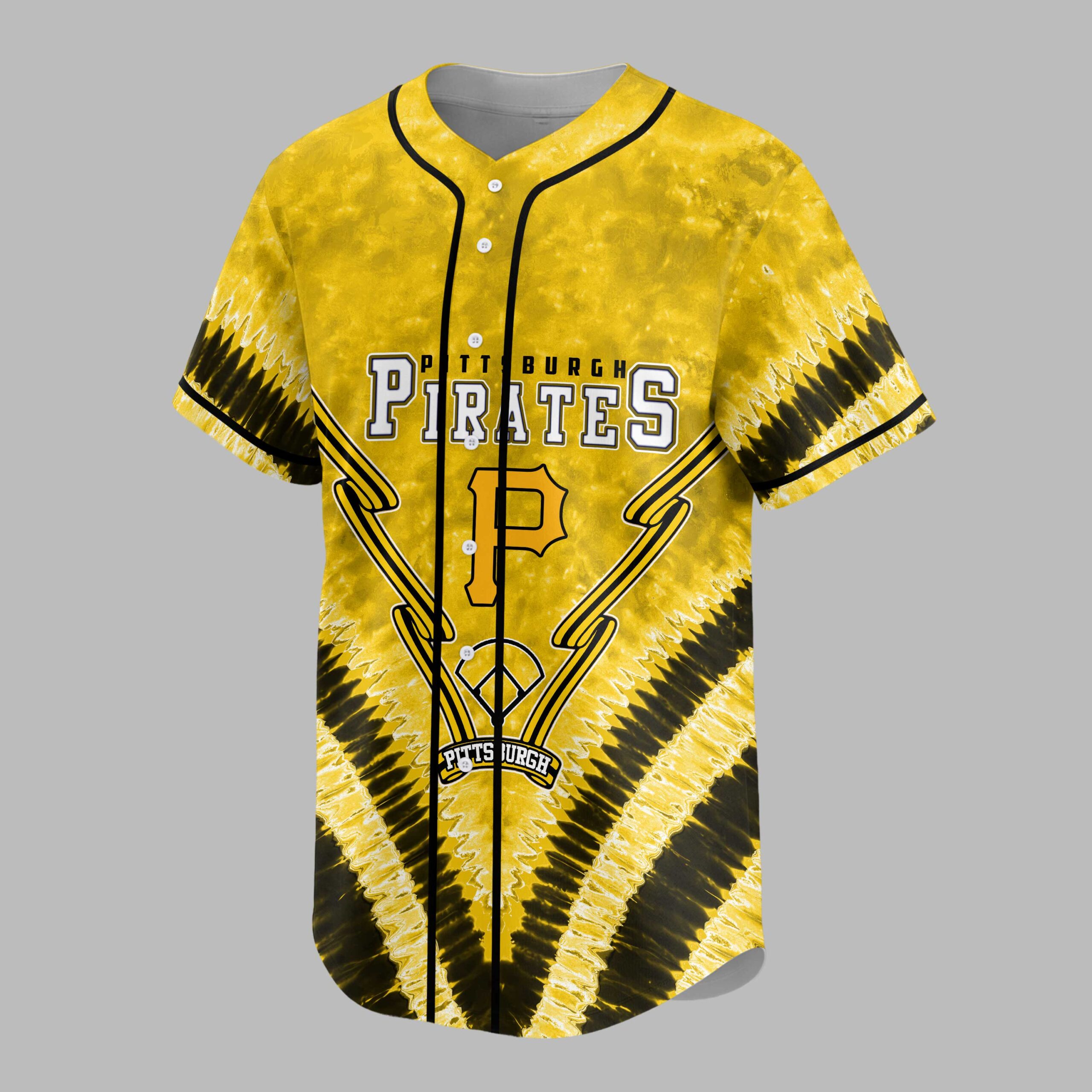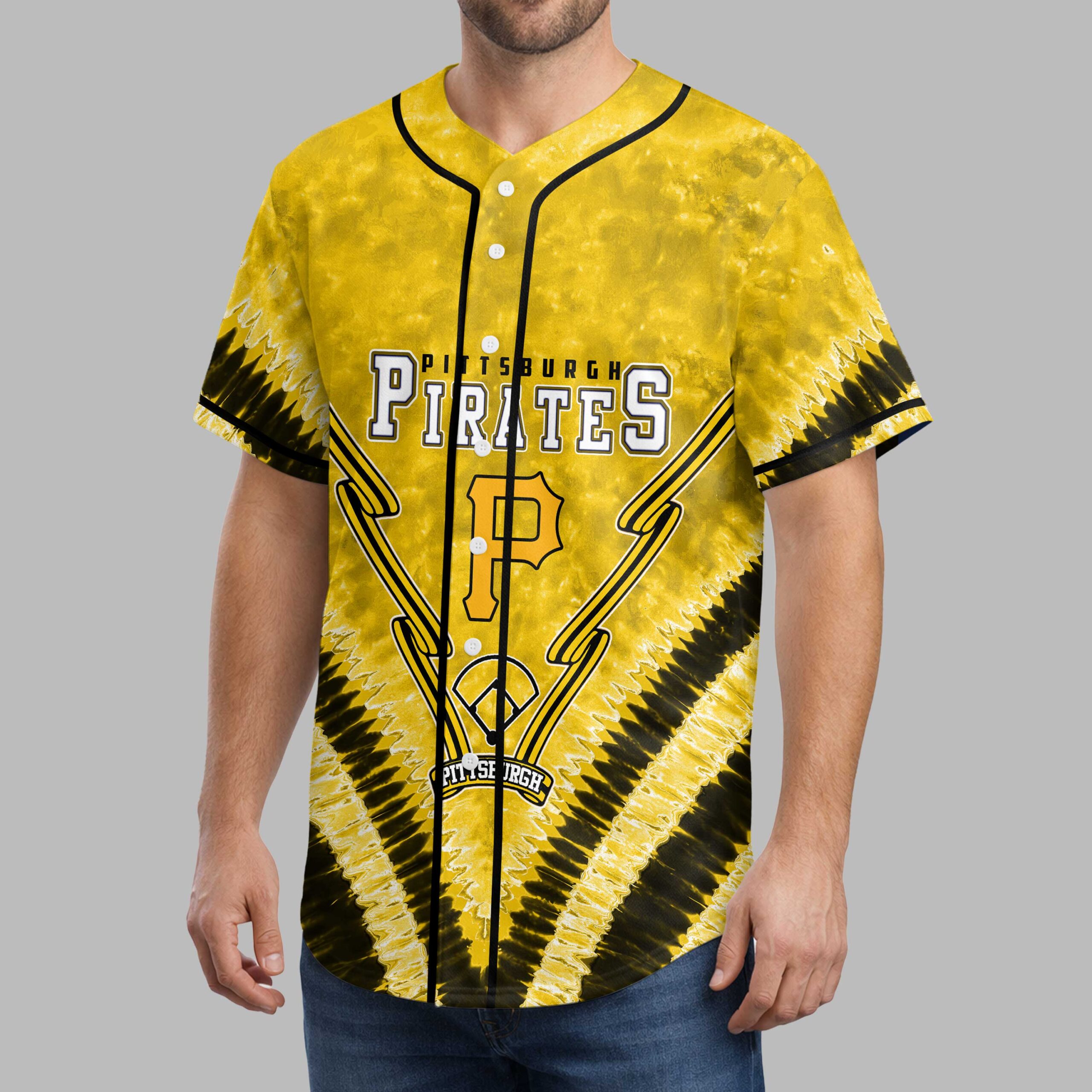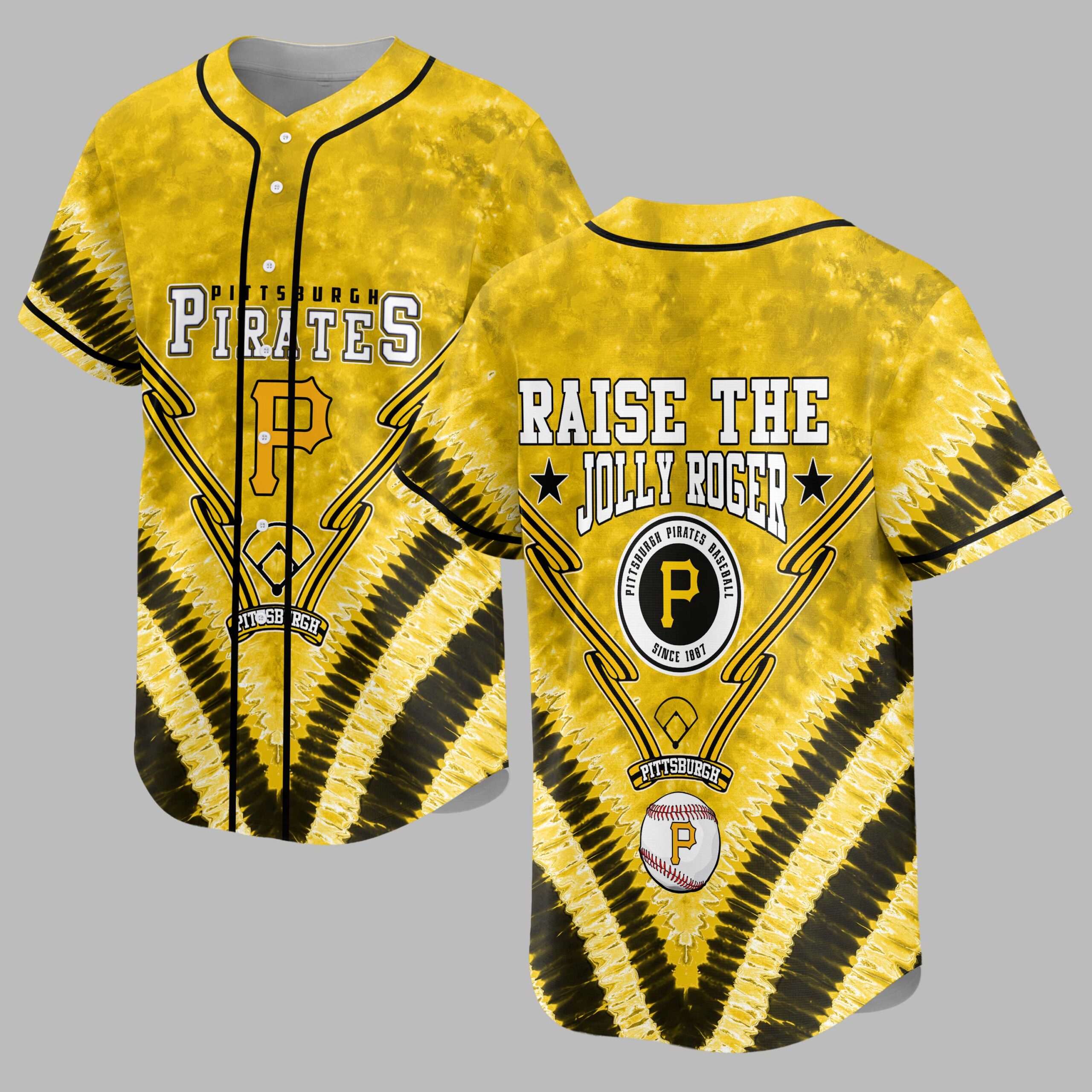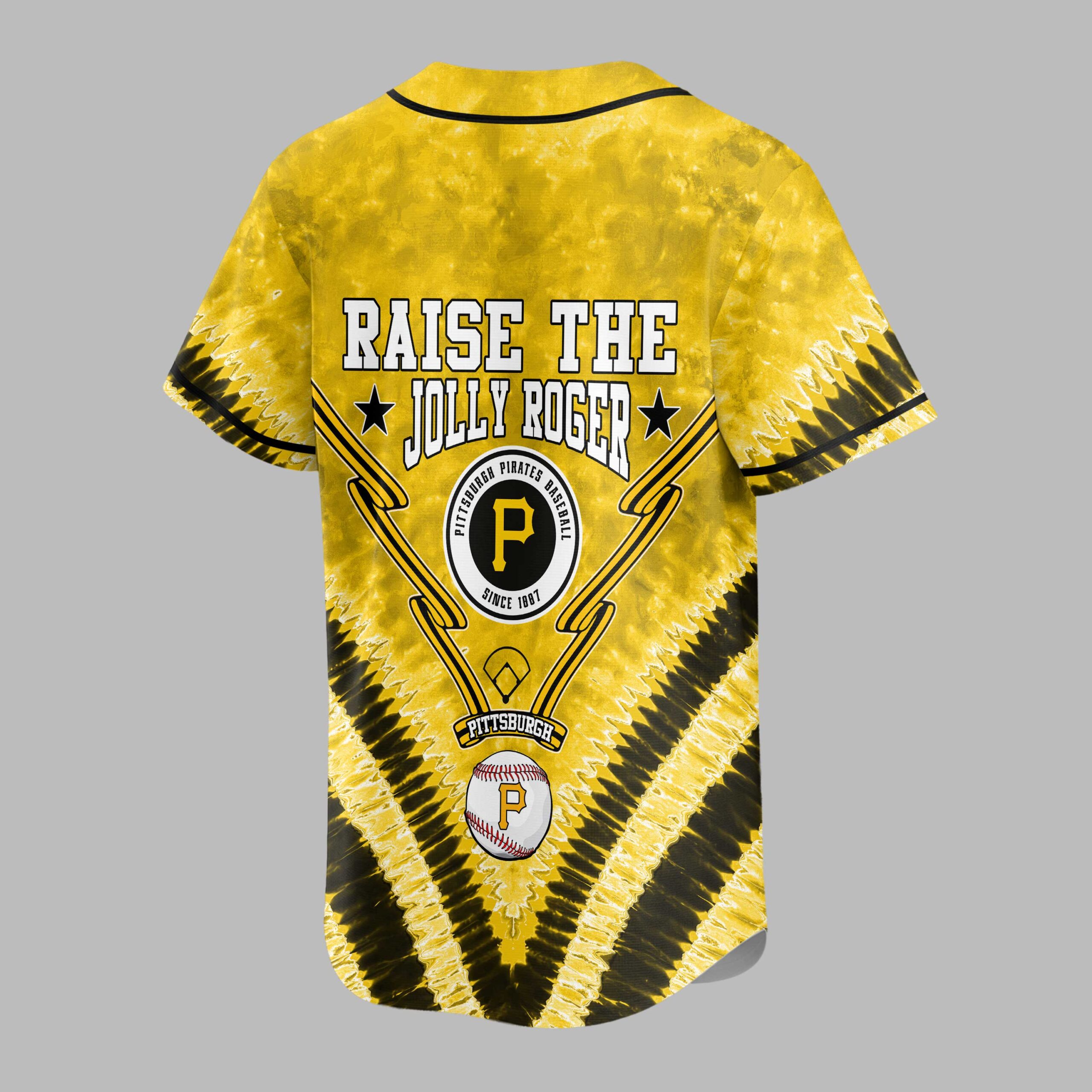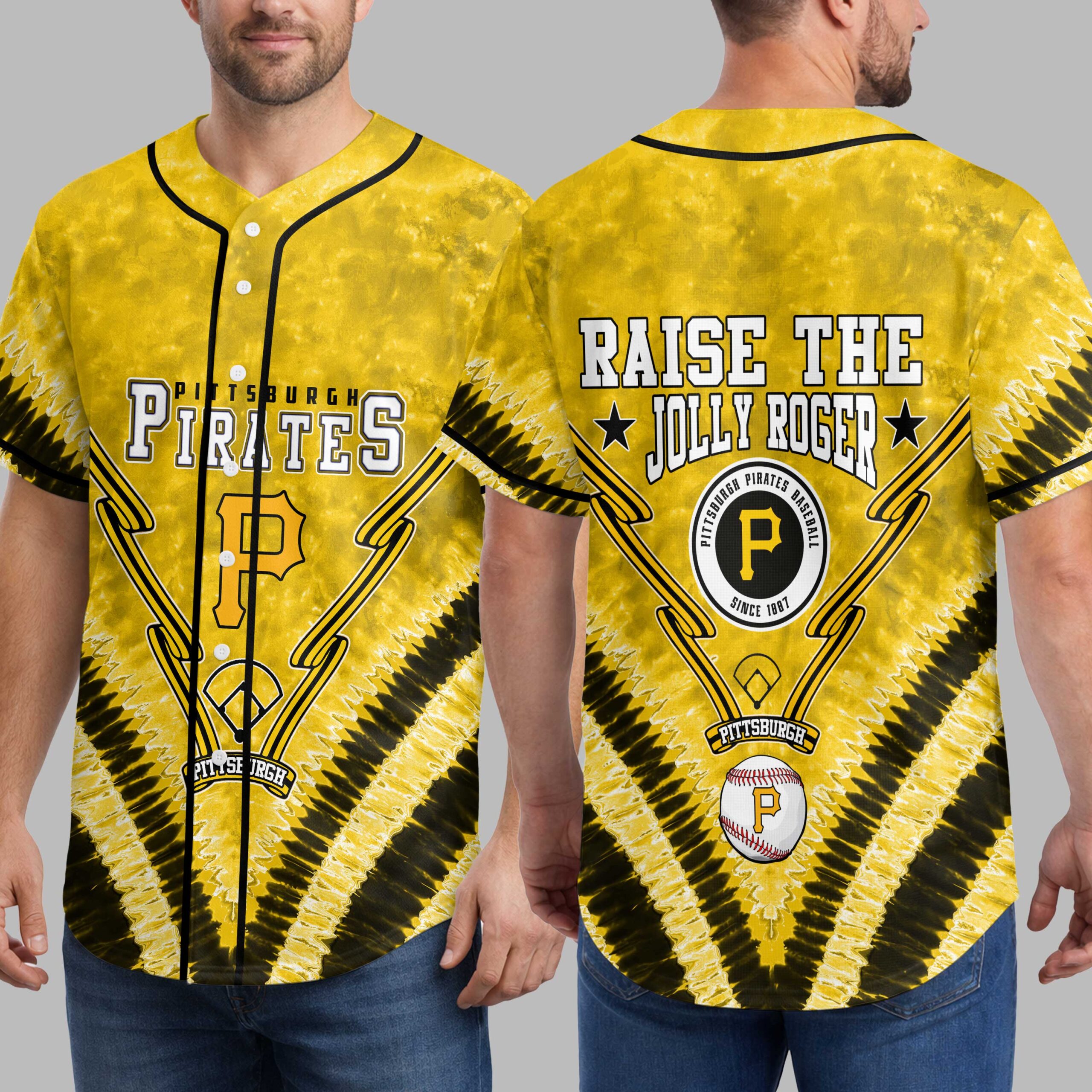 Show your true colors with this dynamic Pittsburgh Pirates baseball jersey! Crafted for the most dedicated fans, this unique tie-dye design lets you flaunt your unwavering team pride with a spirited, head-turning look that’s perfect for game day or any casual outing. The front features PITTSBURGH PIRATES across the chest with the iconic P logo, along with a baseball graphic highlighting PITTSBURGH. The back boldly declares RAISE THE JOLLY ROGER and includes a classic circular emblem stating PITTSBURGH PIRATES BASEBALL SINCE 1887 and another P, all against an eye-catching yellow and black tie-dye background. Perfect for cheering at PNC Park, hosting a watch party, or simply displaying your fandom, this jersey is designed for comfort and style. It’s the ideal way to celebrate your love for the Pirates and make every moment a home run.