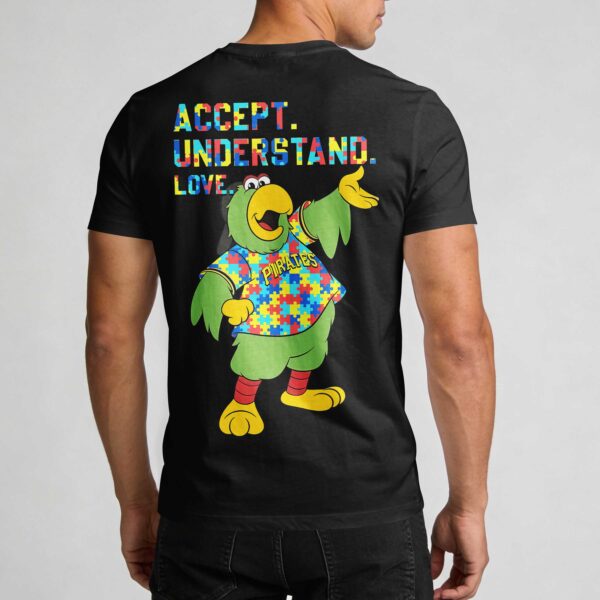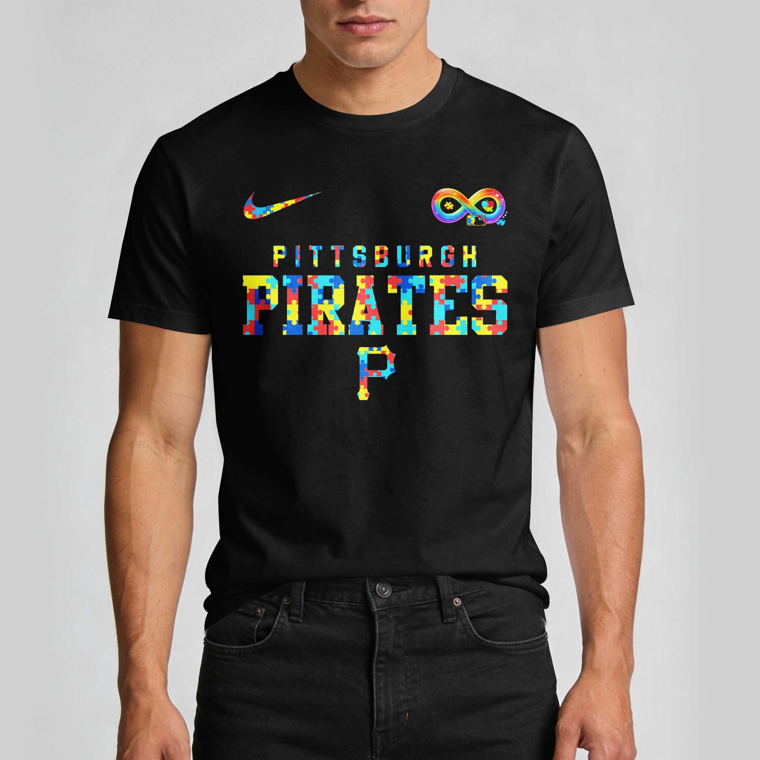 Show your unwavering support for the Pittsburgh Pirates and a vital cause with this vibrant fan tee! It proudly blends team loyalty with a powerful message of autism acceptance, understanding, and love, a meaningful way to cheer on your Bucs. The front features PITTSBURGH PIRATES and a bold P in a multi-colored puzzle piece pattern, symbolizing autism awareness. A rainbow infinity symbol with a baseball graphic and MLB logo, plus a matching puzzle-piece Nike swoosh, completes the front. The back showcases the iconic Pirate Parrot mascot in a puzzle-piece jersey, alongside the impactful message: ACCEPT. UNDERSTAND. LOVE. Perfect for game days, community events, or everyday wear, this shirt is a grand slam for fans embracing both baseball passion and diversity. Wear it with pride and let your support shine!