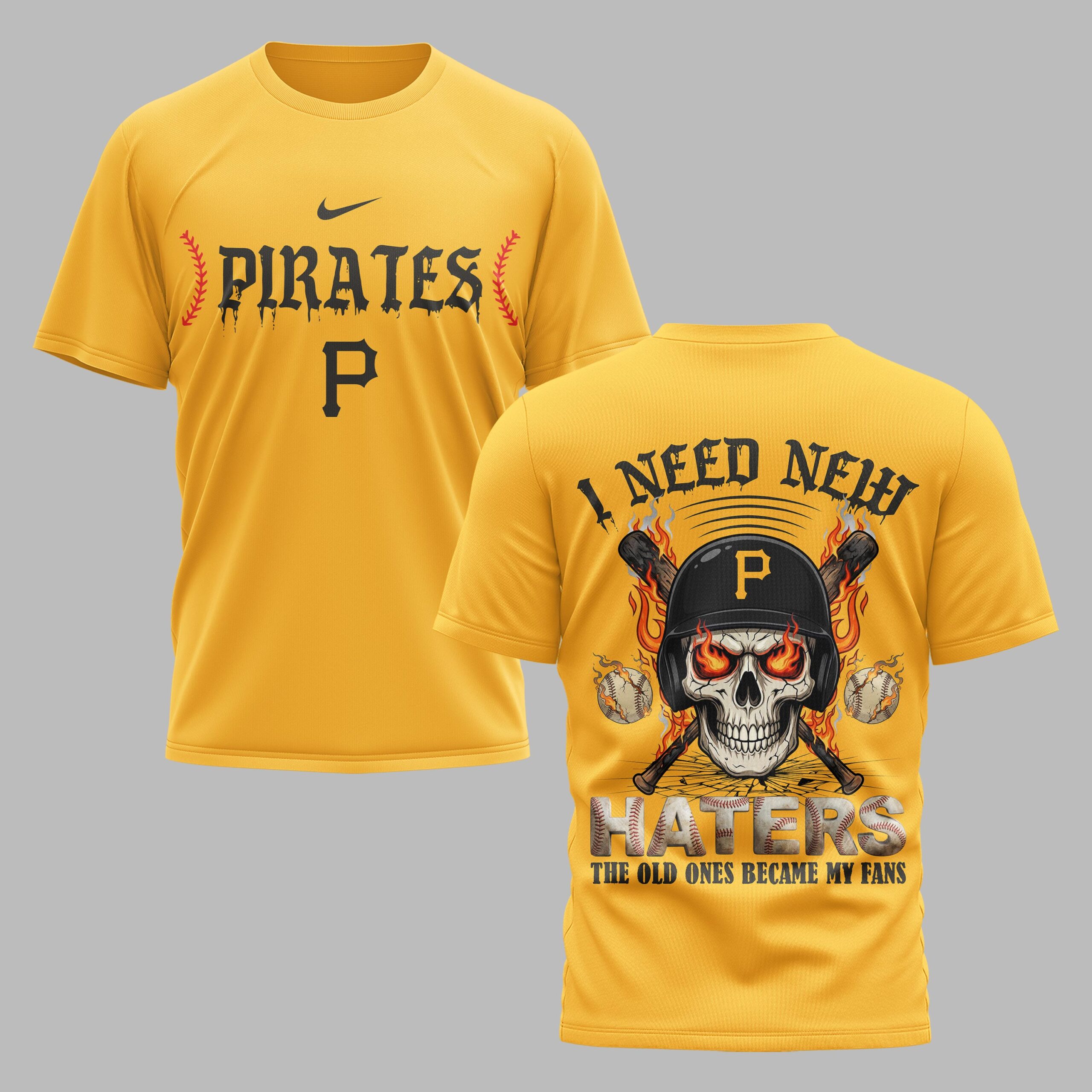 Show off your unyielding loyalty to the Steel City with this bold Pittsburgh Pirates fan tee. Designed for the die-hard enthusiast, this shirt perfectly blends grit and team pride, making it a standout addition to your baseball collection. It’s a powerful way to represent the Black and Gold during intense game days or major patriotic celebrations. The front features a striking PIRATES wordmark in a white dripping font, flanked by red baseball stitching and anchored by the iconic P logo. The back makes an even louder statement with a fierce skull graphic wearing a Pirates helmet, complete with flaming eyes and crossed bats. Surrounded by fiery baseballs, the defiant text I Need New Haters, The Old Ones Became My Fans ensures your confidence is as clear as your team spirit. Whether you’re heading to PNC Park, celebrating Independence Day at a BBQ, or repping your team around town, this shirt is built for impact. It’s the ultimate gear for any fan who plays as hard as they cheer.