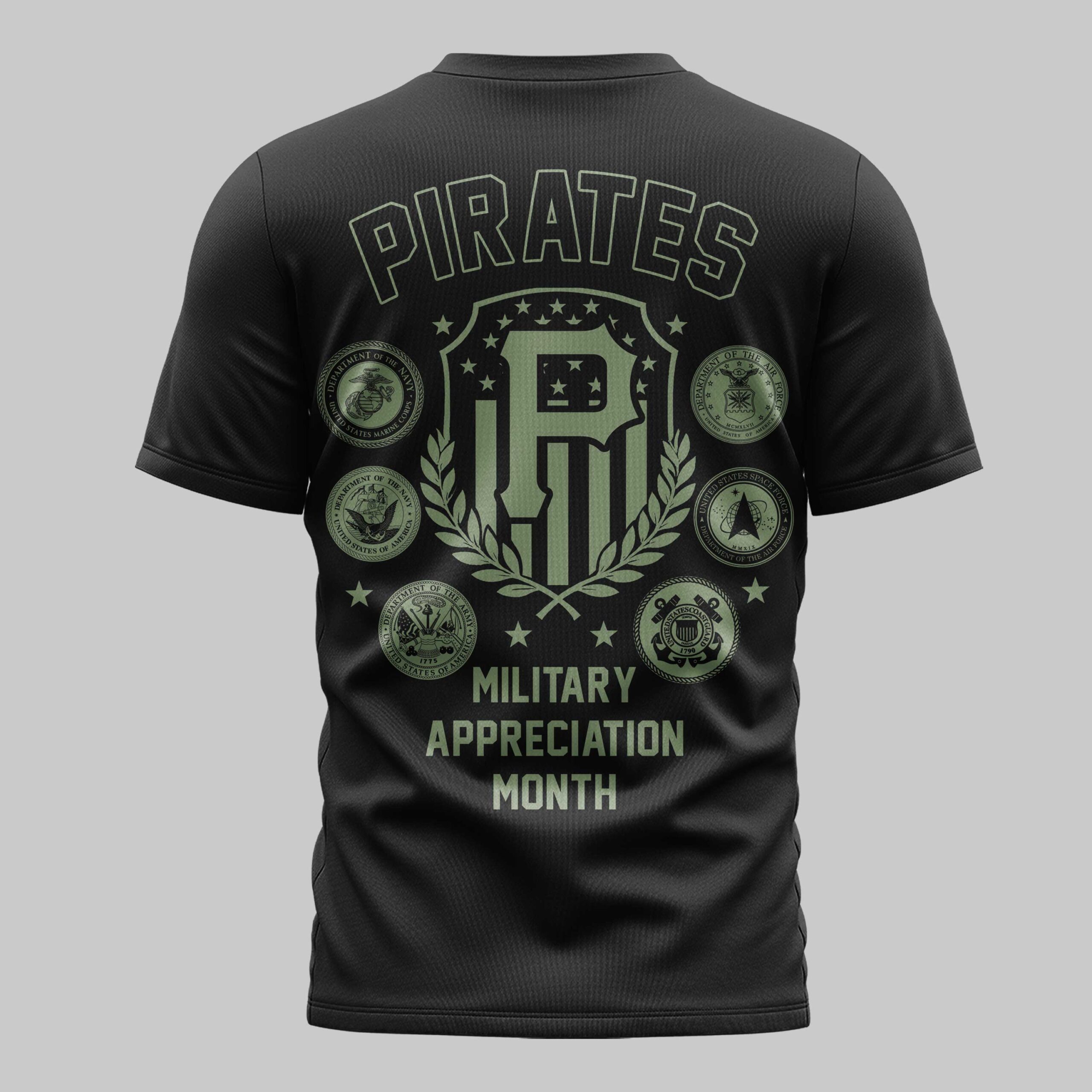 Show your unwavering support for both your favorite team and the nation with this Pittsburgh Pirates T-shirt. Designed for fans who carry their team pride and patriotic spirit everywhere, this shirt is a bold tribute to the heritage of Pittsburgh baseball and the brave individuals who serve. It’s the perfect way to represent the Steel City while honoring the stars and stripes. The front of this sleek black tee features Pittsburgh in a classic olive green script alongside the iconic P logo. The back showcases a powerful graphic with PIRATES arched over a military-inspired shield. Surrounded by the seals of the U.S. armed forces branches, the design proudly commemorates Military Appreciation Month with striking olive tones and patriotic details. Whether you’re heading to PNC Park, attending a summer celebration, or enjoying a casual outing, this shirt is your go-to gear. It’s ideal for game days, Independence Day, or everyday wear, letting you display your Pirates loyalty and national pride with every wear.