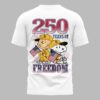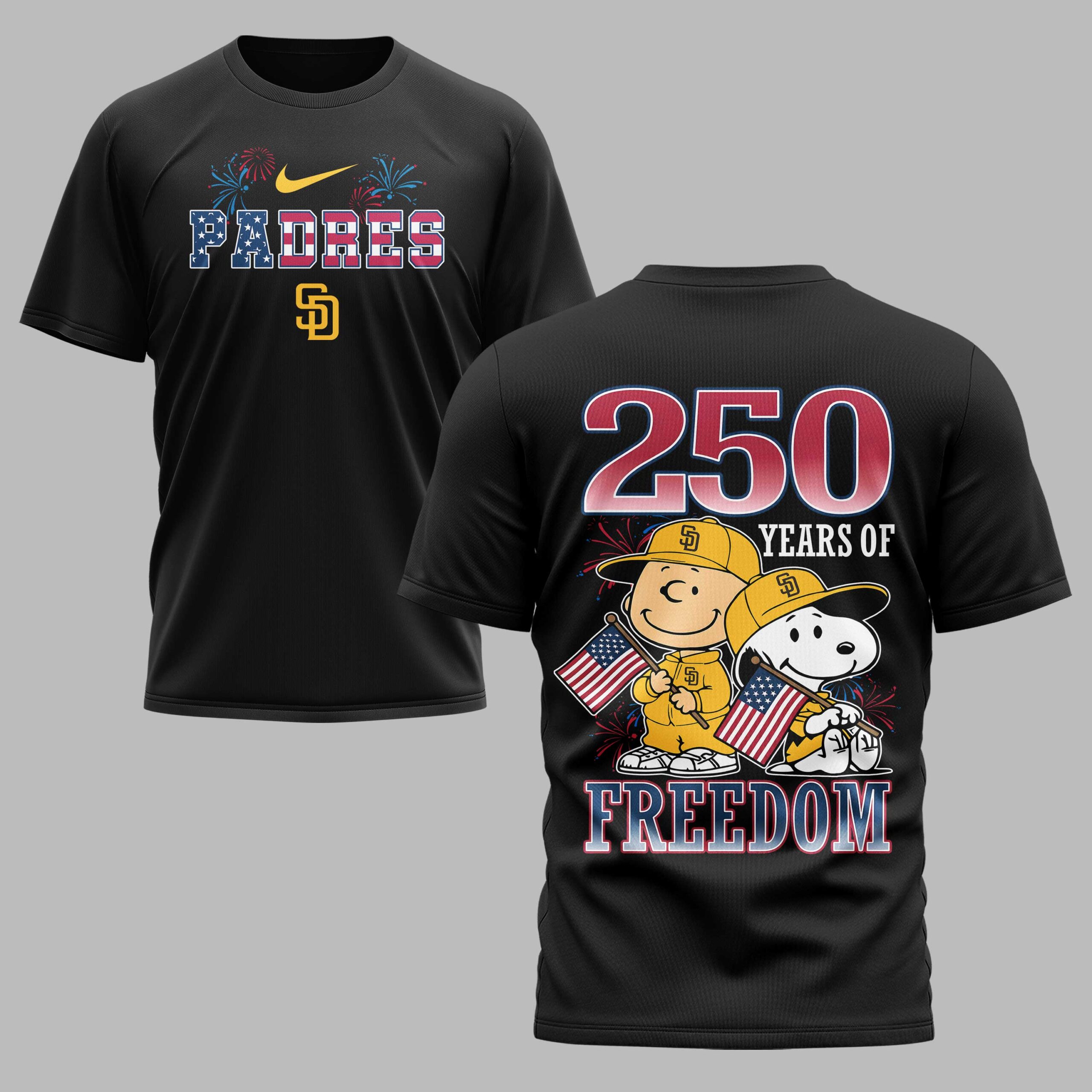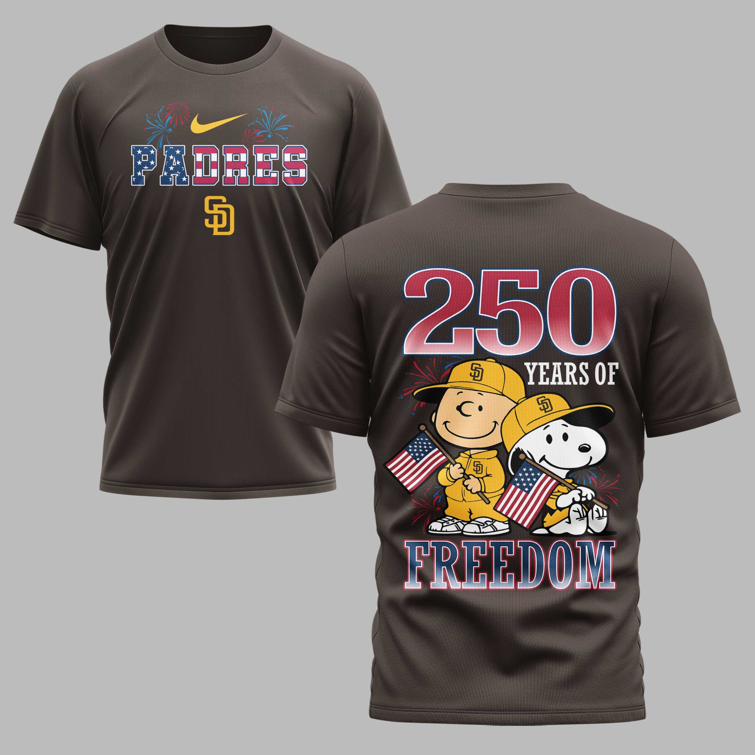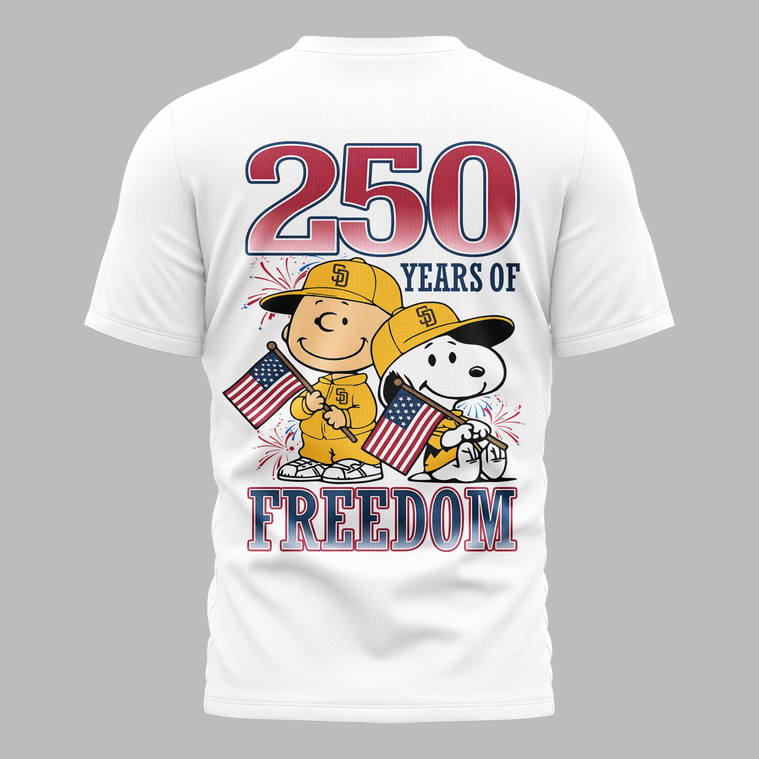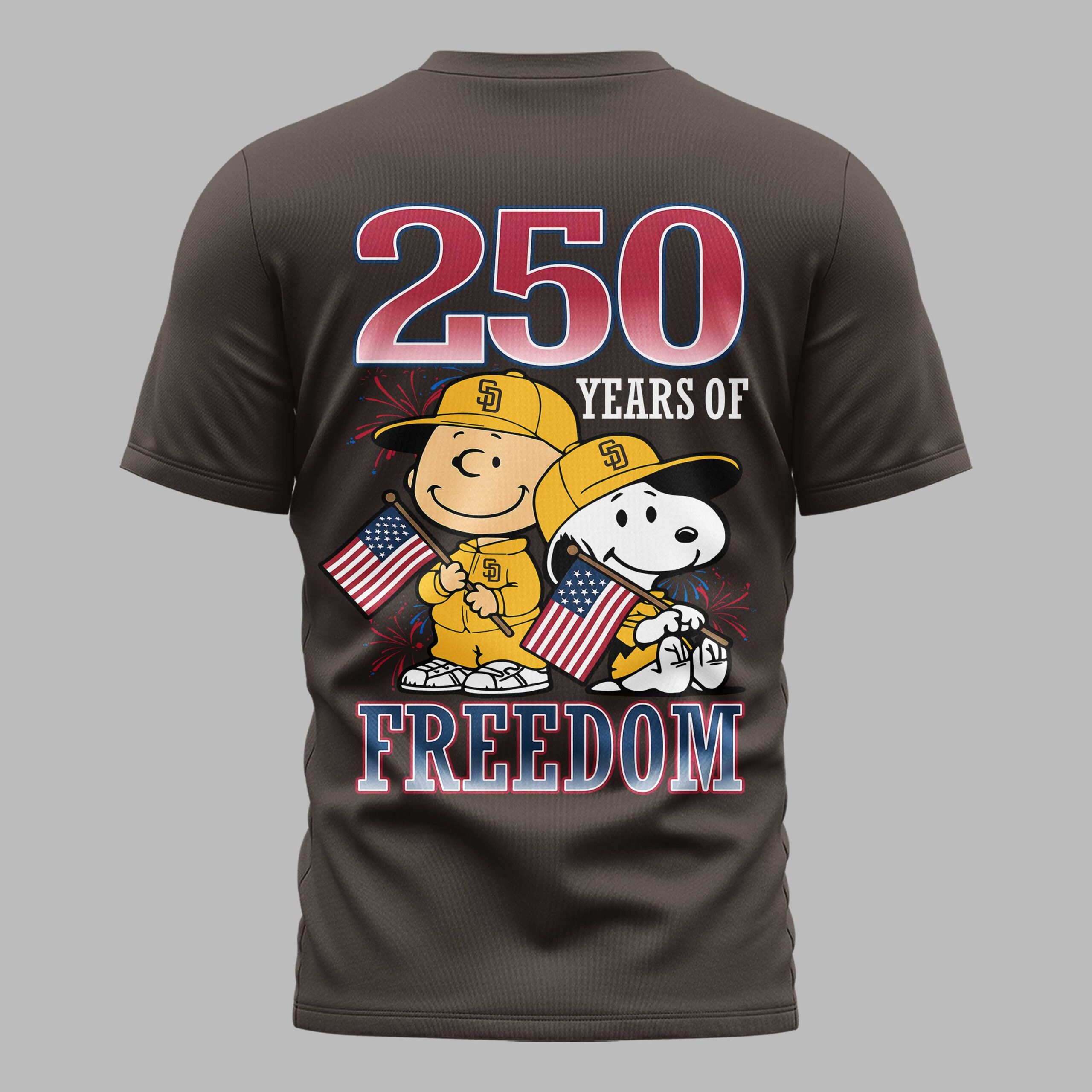 Celebrate your love for the San Diego Padres and American liberty with this special edition patriotic tee! This vibrant shirt perfectly blends team spirit with a profound tribute to 250 Years of Freedom, making it ideal for fans who cherish both baseball and their country. The front proudly displays PADRES in a dynamic red, white, and blue design, accented by festive fireworks and the iconic SD logo. Turn heads with the back featuring a bold 250 YEARS OF FREEDOM declaration, charmingly illustrated by Charlie Brown and Snoopy in Padres caps, joyfully waving American flags amidst more celebratory fireworks. Perfect for Fourth of July festivities, cheering on the Padres at the ballpark, attending patriotic parades, or simply showcasing your pride any day. This shirt is a fantastic way to honor enduring American values and your favorite team in style.