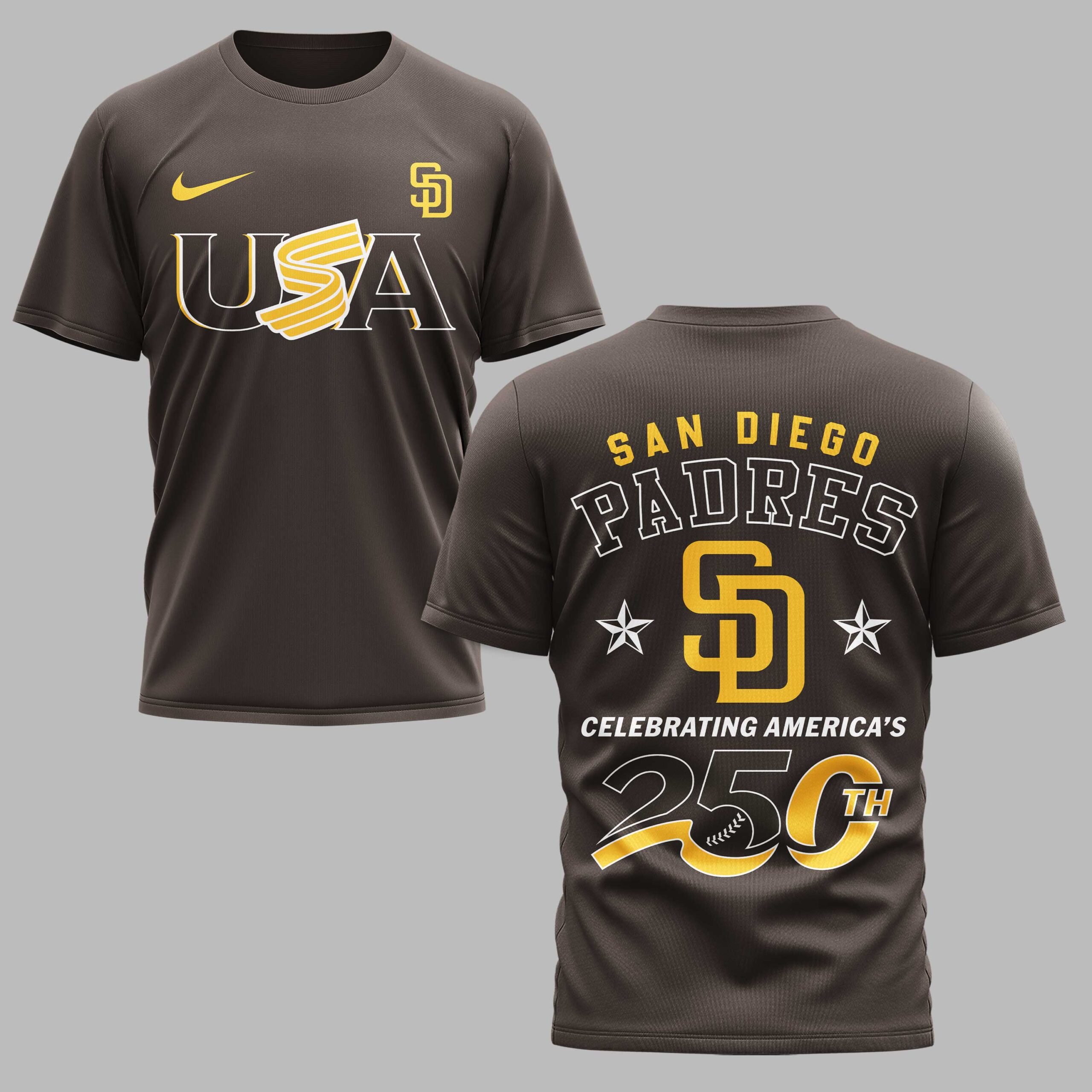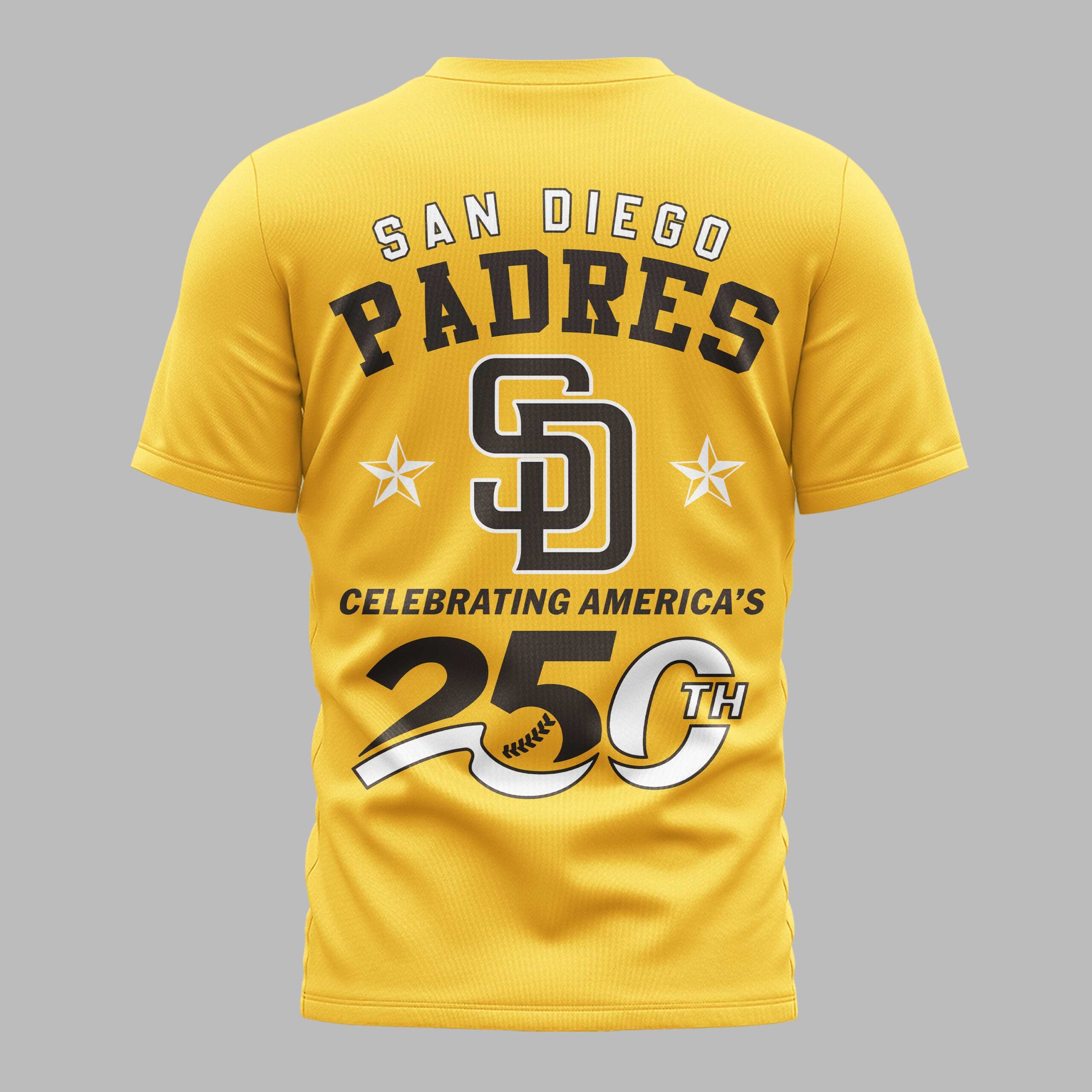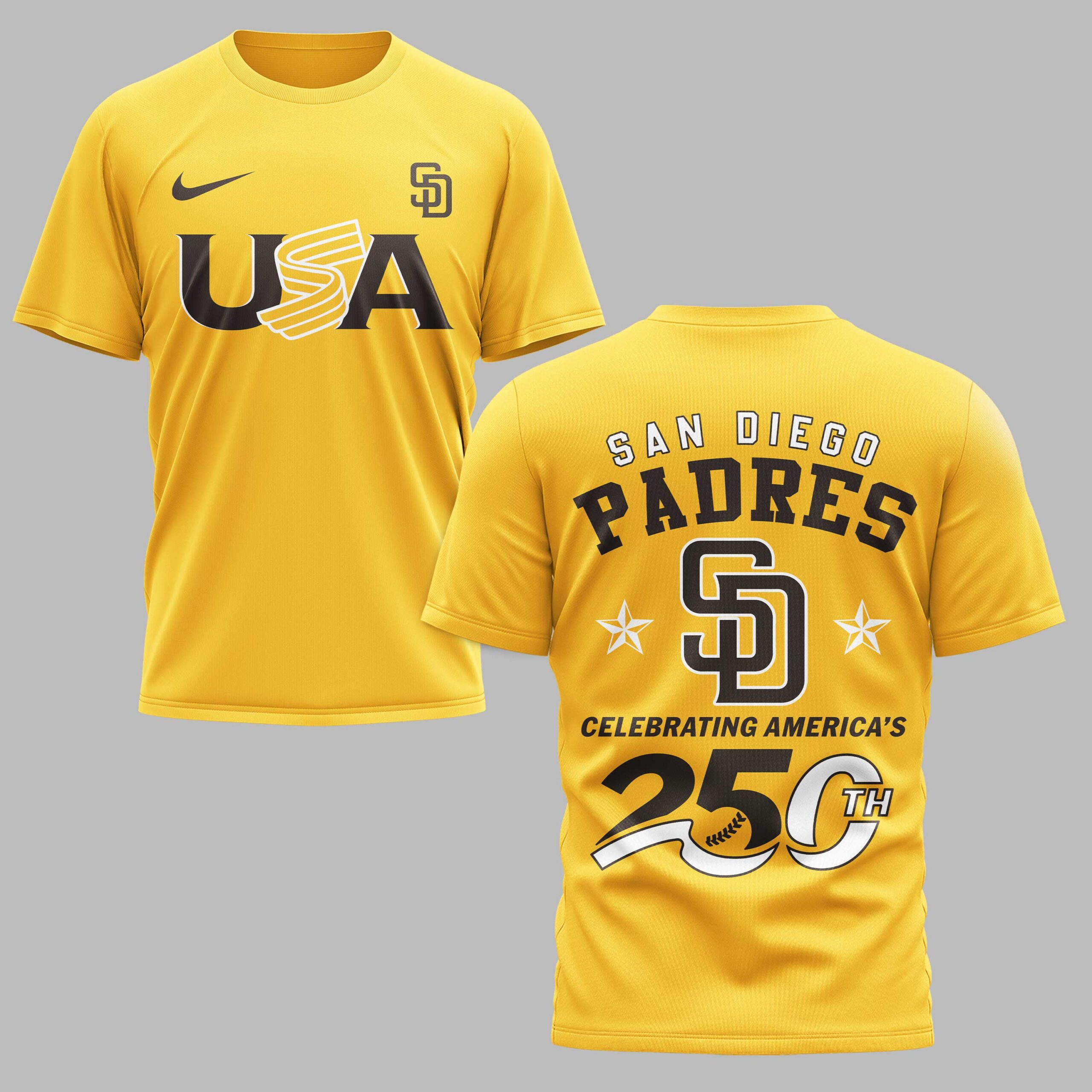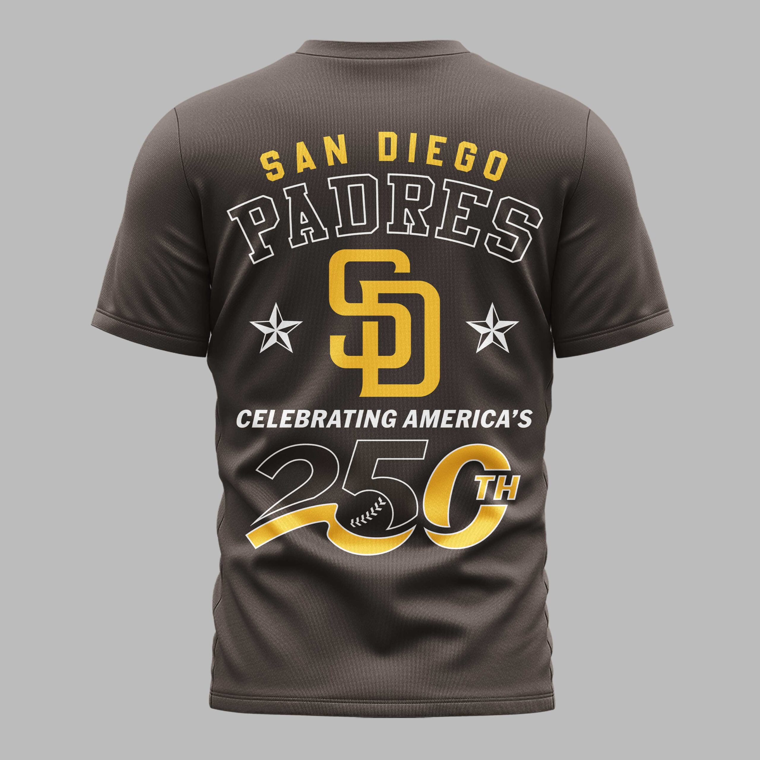 Show off your unwavering team spirit and national pride with this unique San Diego Padres tribute tee. Designed for fans who love their city and country, this shirt celebrates America’s historic 250th anniversary while keeping you ready for every home run. It’s the perfect way to represent the Friars with a patriotic twist that stands out in any crowd. The front features a bold USA graphic across the chest, complemented by the iconic SD logo and a classic swoosh. The back design shines with San Diego Padres arched over a large team logo flanked by golden stars. A striking Celebrating America’s 250th graphic commemorates the milestone with baseball-inspired details and vibrant gold accents that pop against the clean background. Whether you’re heading to Petco Park, hosting a holiday barbecue, or showing off your fan status, this tee is built for the occasion. Wear it proudly during Independence Day celebrations or as your go-to everyday gear.
