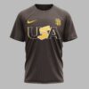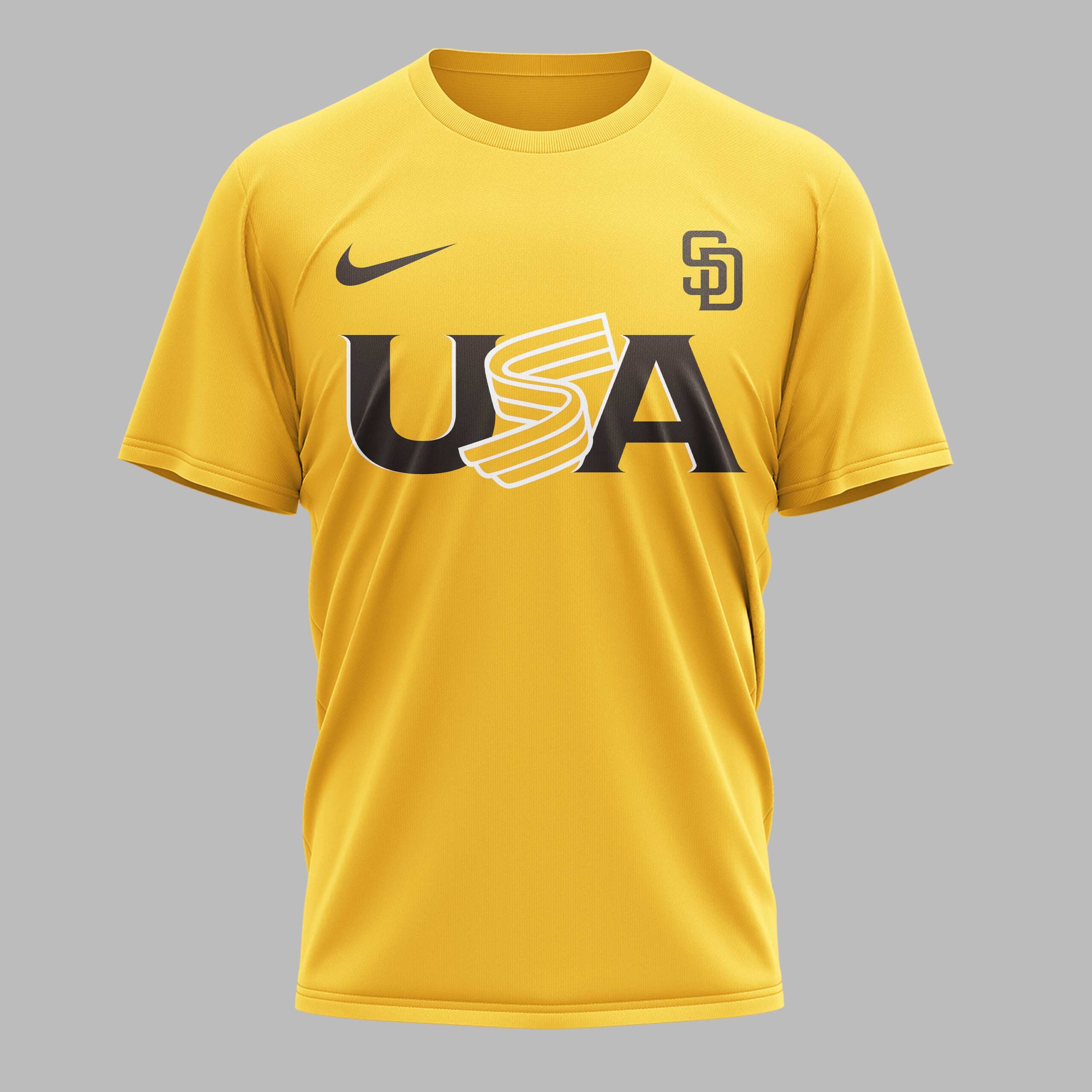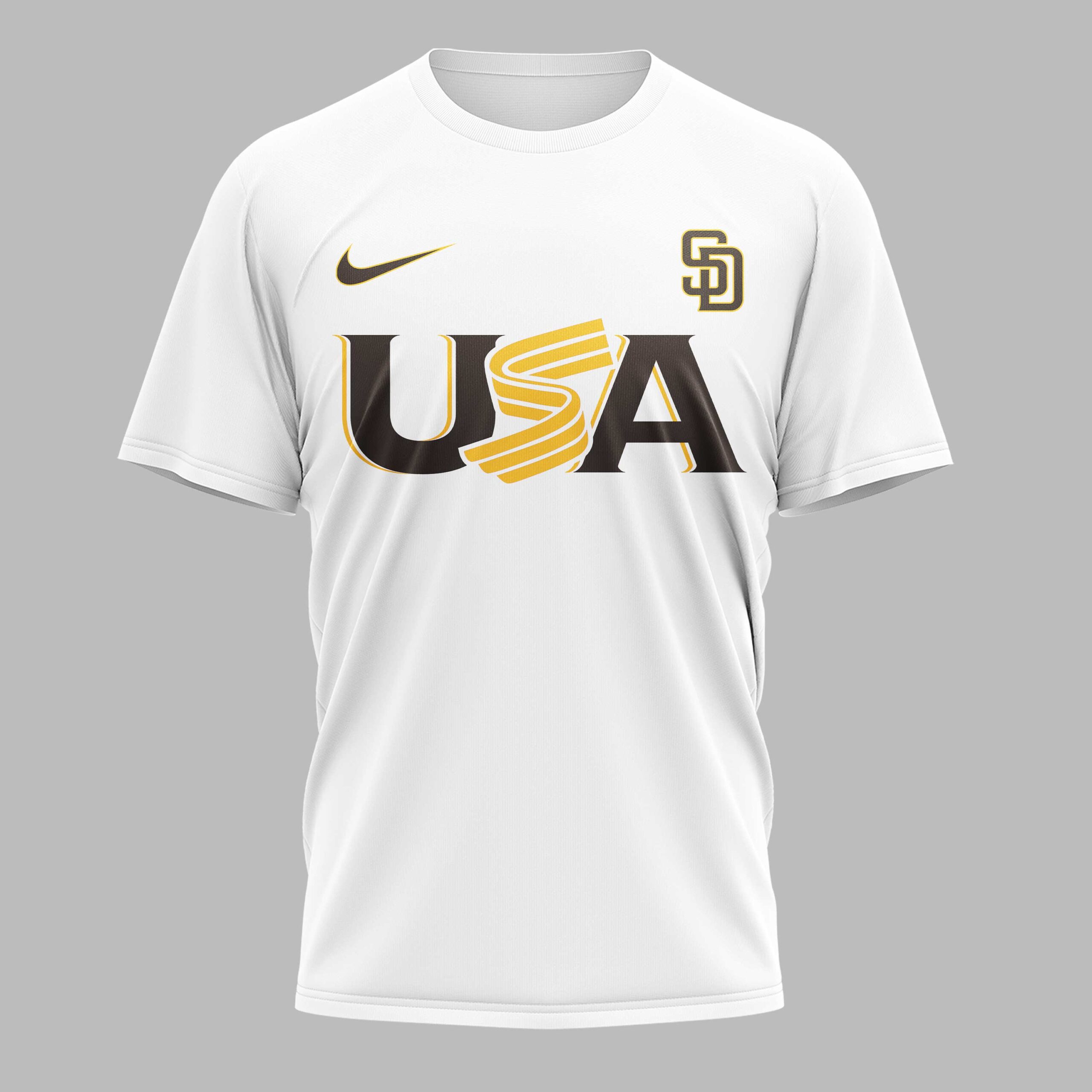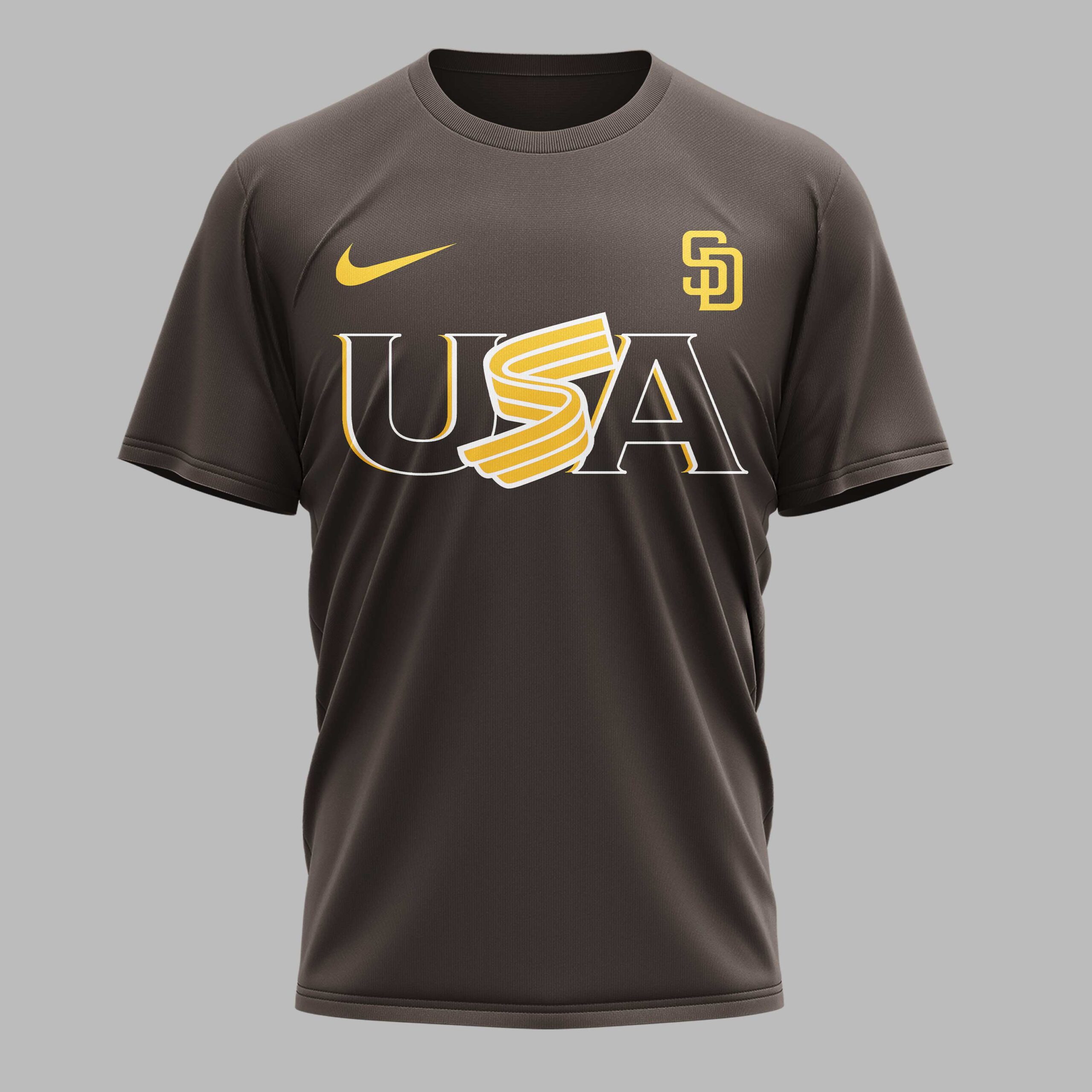 Show off your unwavering team spirit and national pride with this unique San Diego Padres tribute tee. Designed for fans who love their city and country, this shirt celebrates America’s historic 250th anniversary while keeping you ready for every home run. It’s the perfect way to represent the Friars with a patriotic twist that stands out in any crowd. The front features a bold USA graphic across the chest, complemented by the iconic SD logo and a classic swoosh. The back design shines with San Diego Padres arched over a large team logo flanked by golden stars. A striking Celebrating America’s 250th graphic commemorates the milestone with baseball-inspired details and vibrant gold accents that pop against the clean background. Whether you’re heading to Petco Park, hosting a holiday barbecue, or showing off your fan status, this tee is built for the occasion. Wear it proudly during Independence Day celebrations or as your go-to everyday gear.