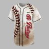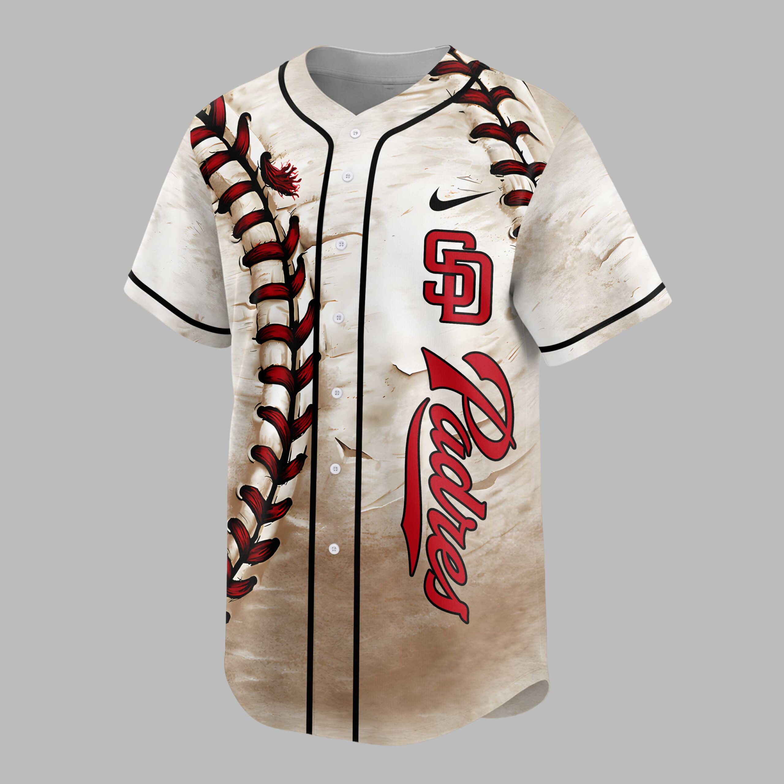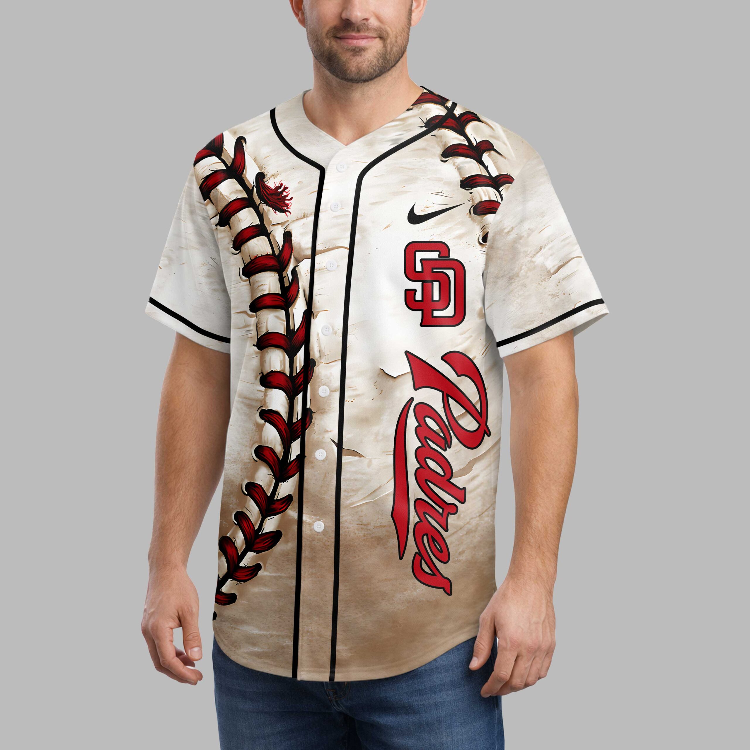 Step up to the plate in ultimate style and proudly show your San Diego Padres spirit with this unique vintage-inspired baseball jersey. Crafted for the true fan, this top embodies the enduring legacy and passionate energy of your favorite team, perfect for any devoted supporter looking to stand out. The front showcases a distinctly distressed, weathered look with a rich cream and brown base, accented by bold red baseball stitching that wraps dramatically down the side. The iconic ‘SD’ logo and ‘Padres’ text are prominently displayed in vibrant red, while the back features customizable ‘Your Name’ script above large ’00’ numbers, each infused with a classic baseball stitching design, creating an authentic game-day aesthetic. Whether you’re cheering from the stands, heading to a casual gathering, or simply want to flaunt your team pride around town, this personalized Padres jersey is your go-to. It’s an ideal way to celebrate every home run and unforgettable moment, making it a perfect addition to any fan’s collection or a thoughtful gift for a fellow enthusiast.