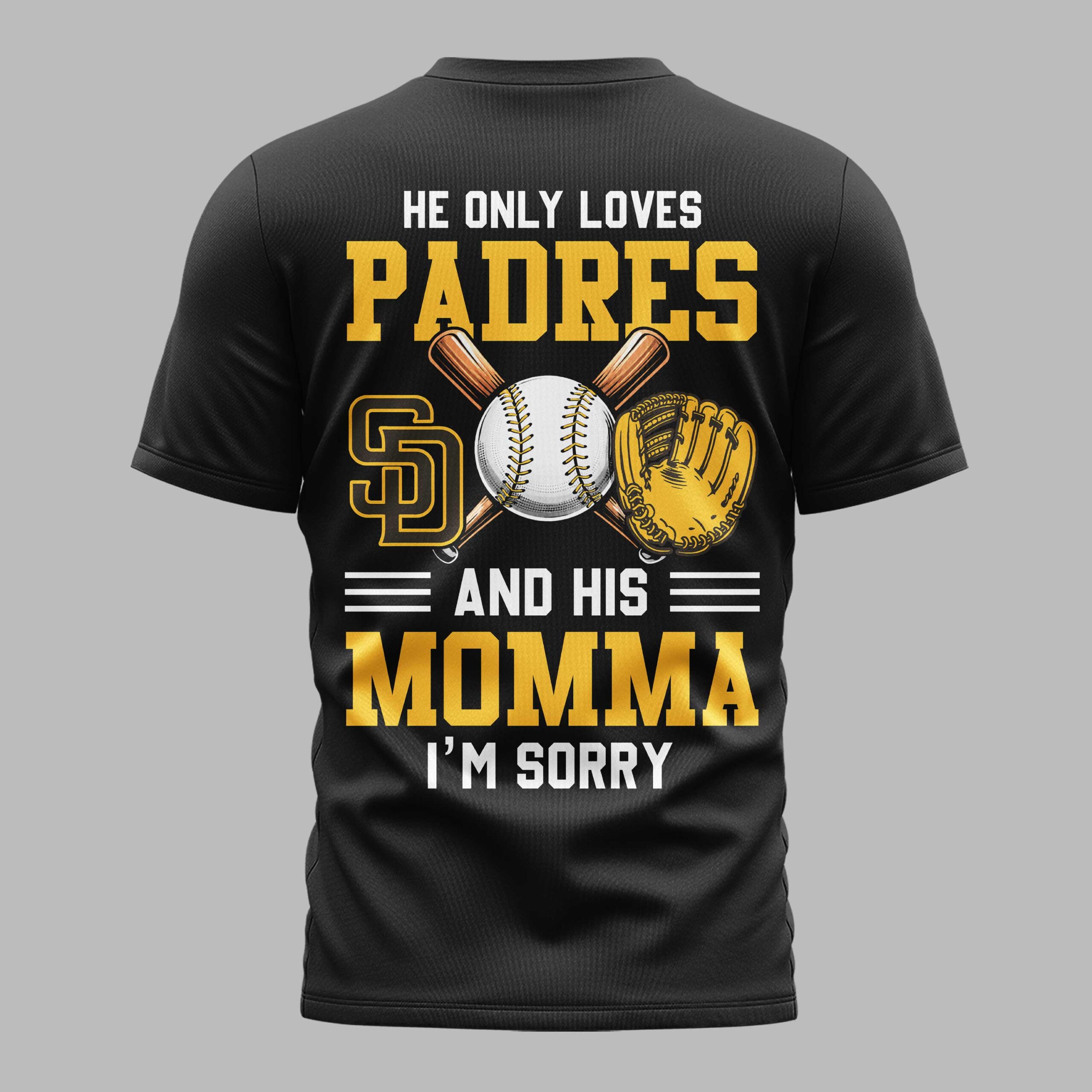 Show off your loyalty to Southern California’s favorite team with this bold San Diego Padres T-shirt. Designed for dedicated fans, this shirt combines a classic sporty look with a touch of modern personality. Whether you’re cheering from the stands at Petco Park or representing your city from afar, this piece is the ultimate way to display your Padres pride and spirit. The front features a clean San Diego Padres graphic centered around the iconic interlocking SD logo set inside a stylized baseball and home plate frame. The back showcases a high-energy design with a playful message: He only loves Padres and his momma, I’m sorry. This back graphic is complete with the team logo, crossed wooden bats, a baseball, and a detailed fielder’s glove. This shirt is perfect for game day, ballpark visits, or Independence Day celebrations. It’s a versatile choice for any fan, making a statement from the stadium to casual everyday wear.