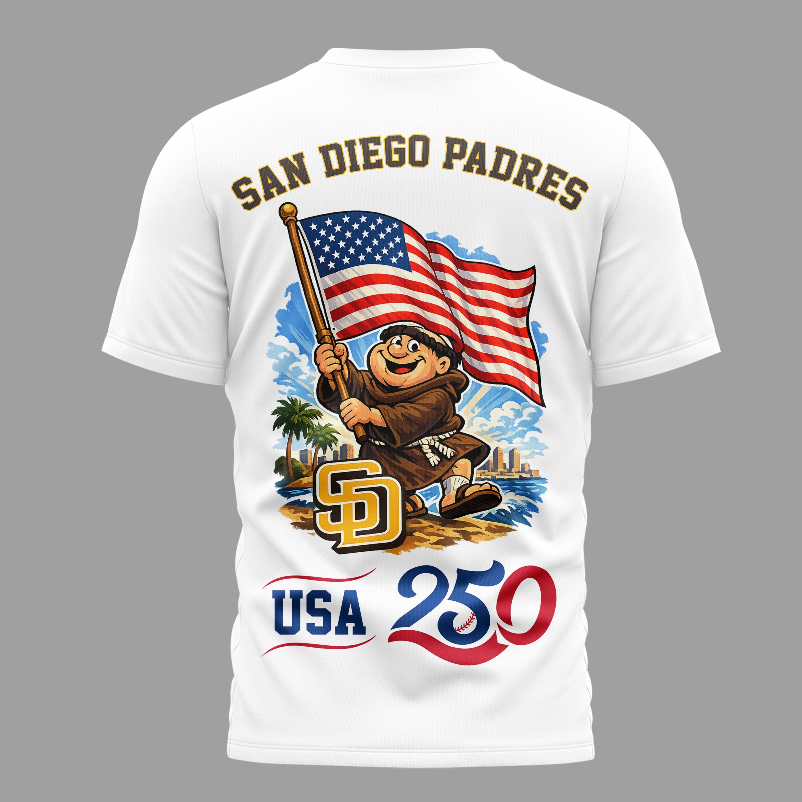 Show off your deep-rooted pride for San Diego baseball and the nation with this commemorative t-shirt. This design honors both the iconic Padres legacy and the historic America 250 celebration, making it a must-have for every dedicated fan in the 619. It’s a perfect blend of Friar Faithful spirit and American patriotism that truly stands out. The front features a bold, gold PADRES wordmark across the chest along with the exclusive America 250 emblem. Flip it over to find a stunning graphic showcasing the beloved Swinging Friar proudly hoisting the Stars and Stripes. Set against a sunny backdrop of palm trees and the city skyline, this shirt captures the essence of America’s Finest City and the spirit of independence. Whether you’re heading to Petco Park, hosting an Independence Day barbecue, or just strolling through town, this tee is built for impact. It’s the ultimate choice for game day and celebrating your team loyalty year-round.