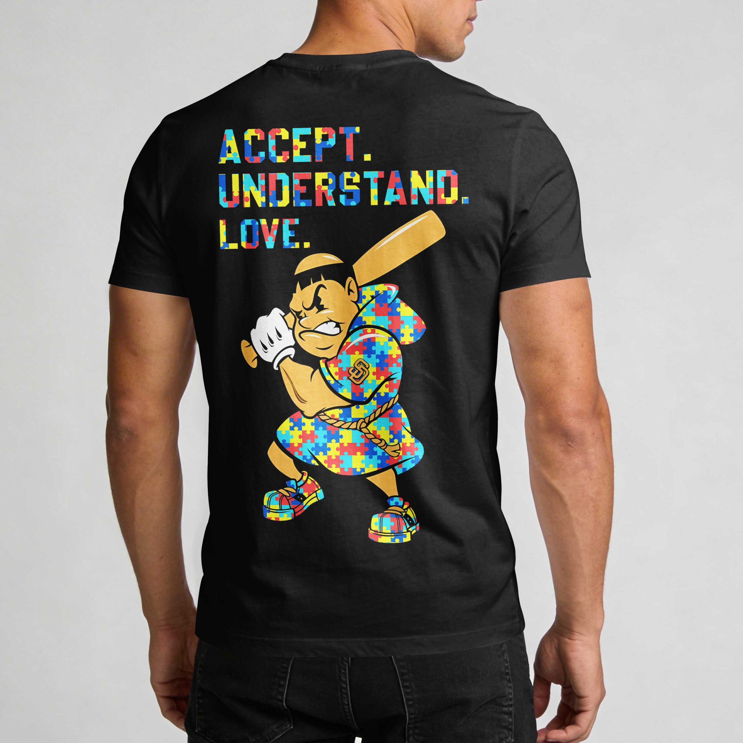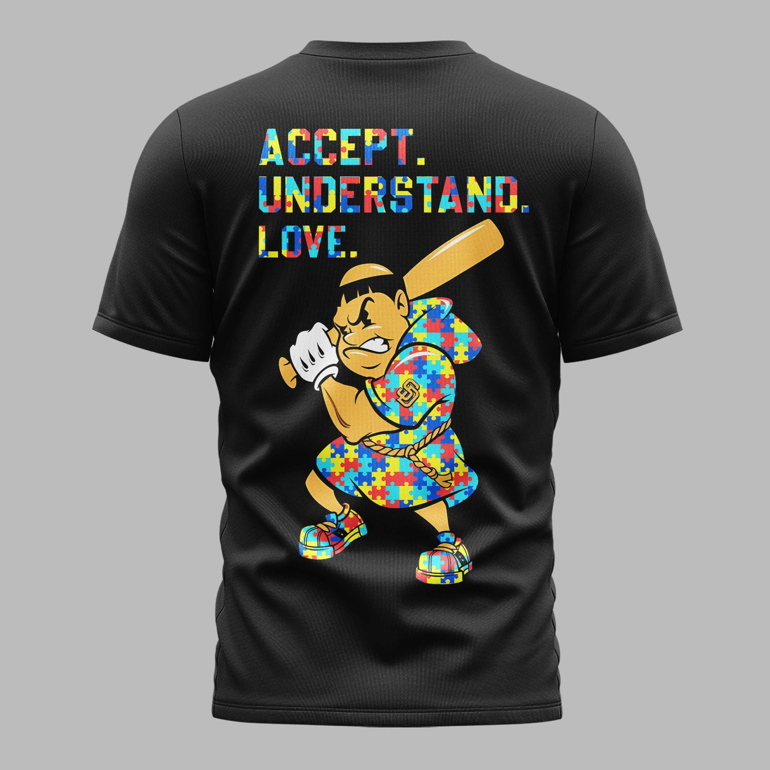 Show your San Diego Padres pride while supporting a powerful message of inclusion. This unique tee is designed for fans who want to represent the Friar Faithful with a meaningful twist, blending team spirit with a vibrant celebration of awareness and unity. The front features the SAN DIEGO PADRES text and the iconic SD logo, both filled with a colorful puzzle piece pattern and accompanied by a matching infinity symbol. On the back, the bold words ACCEPT. UNDERSTAND. LOVE. sit above the legendary Swinging Friar mascot, who is playfully dressed in a puzzle-patterned robe and sneakers. Wear this striking design to Petco Park for game day, local community events, or even Independence Day celebrations to showcase your unique style. It’s a versatile piece of fan gear perfect for everyday wear, ensuring you represent San Diego with pride and a message of acceptance wherever you go.
