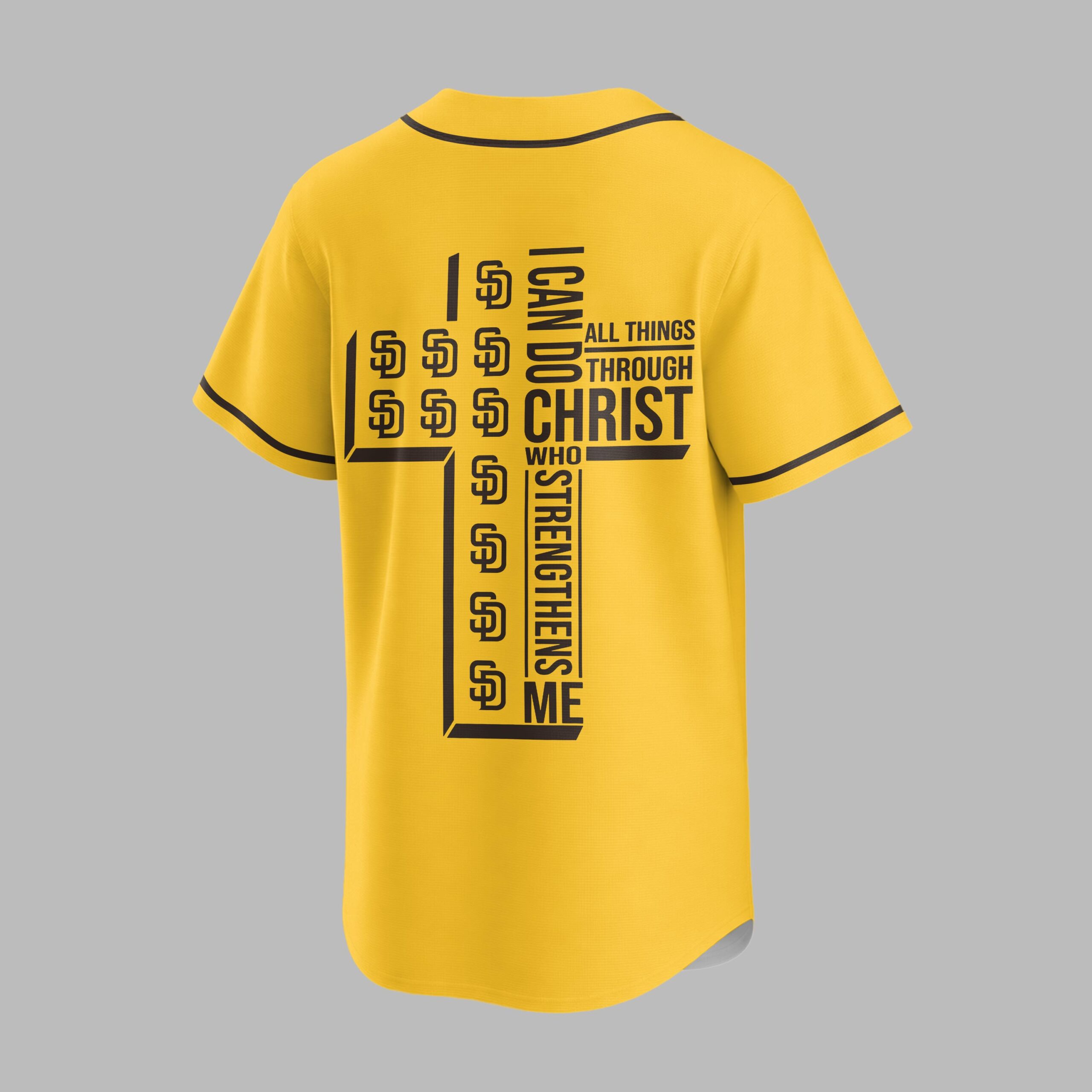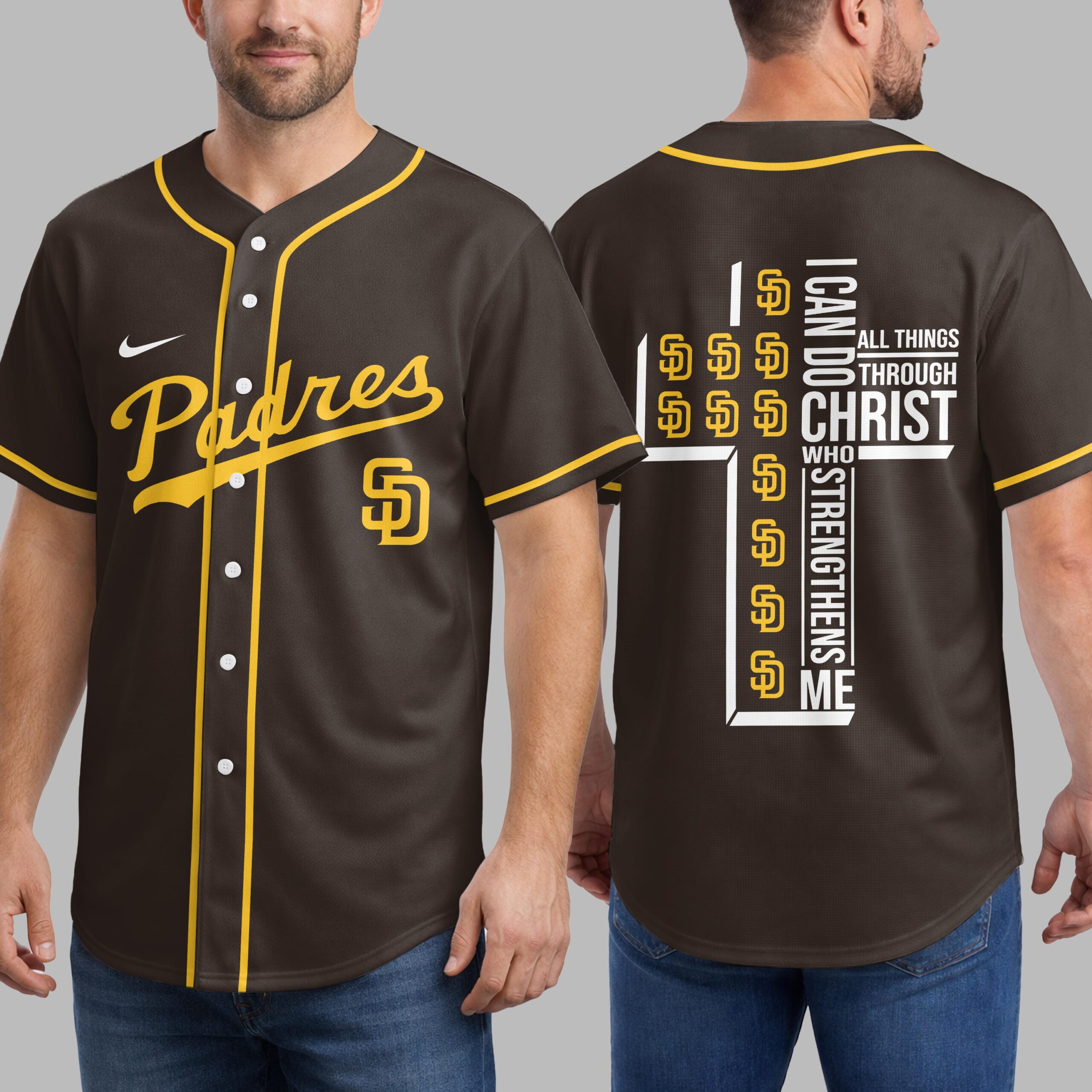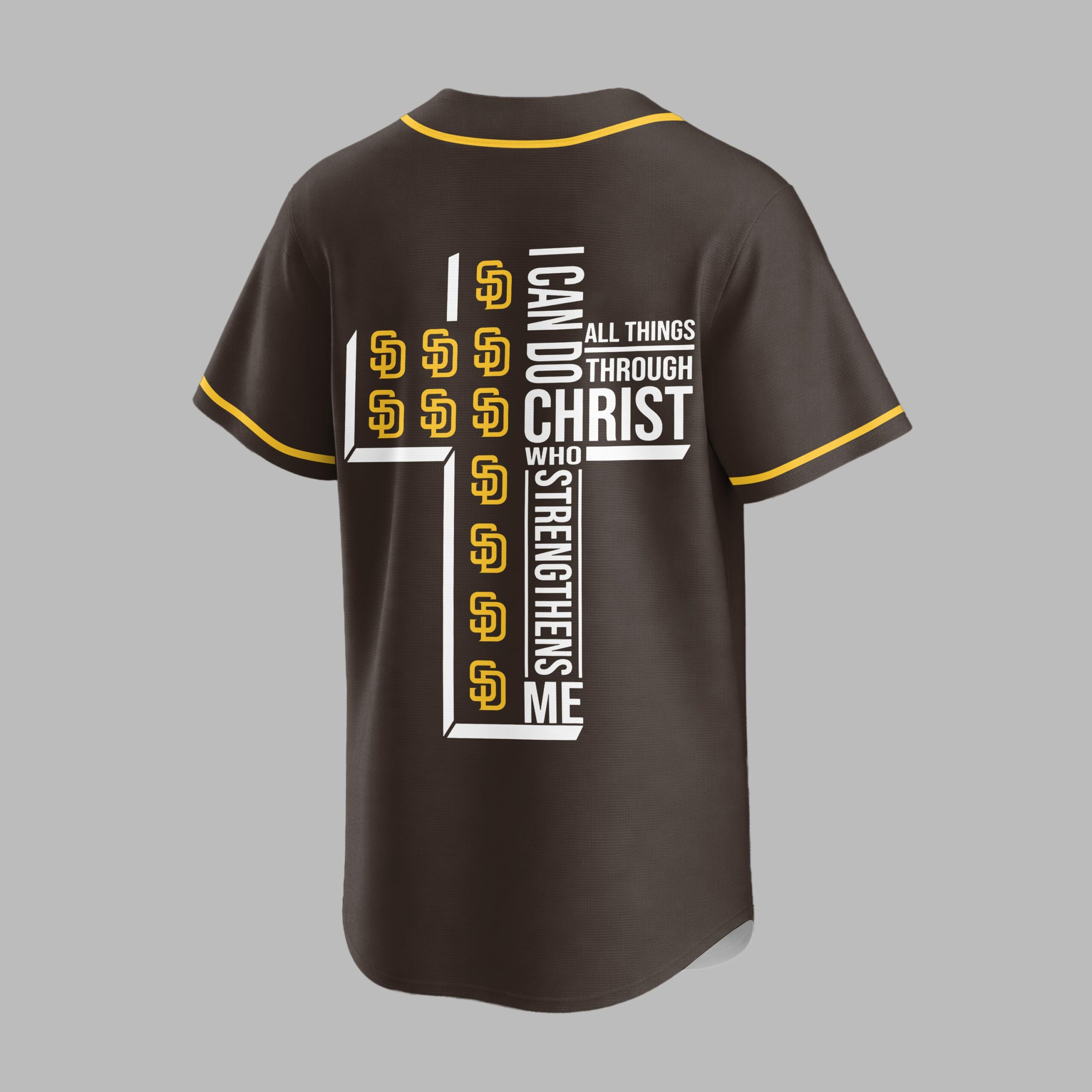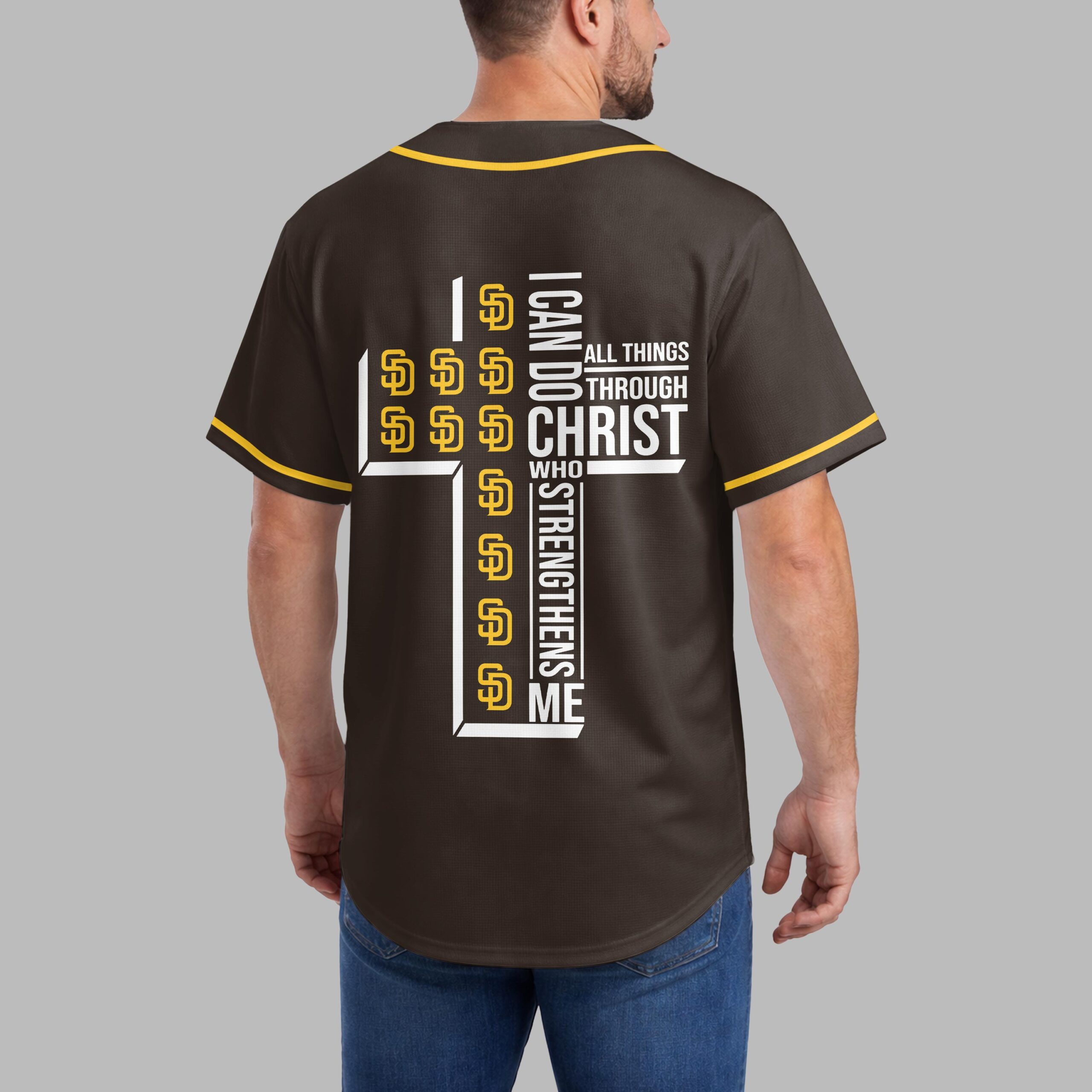 Show your unwavering team spirit and personal conviction with this unique San Diego Padres baseball jersey. Designed for fans who find strength in both their team and their faith, this shirt connects your passion for baseball with an inspiring message of resilience. The front proudly displays Padres in a classic yellow script, accompanied by the iconic SD logo, all against a rich dark brown backdrop with matching yellow piping. The back makes a powerful statement, featuring the verse I CAN DO ALL THINGS THROUGH CHRIST WHO STRENGTHENS ME artfully arranged into a bold white cross, accented by multiple SD logos. Perfect for cheering on the Padres at the ballpark, attending faith-based events, or simply expressing your dual devotion in everyday life. This jersey is more than just fan gear; it’s a testament to what truly strengthens you, whether it’s hitting a home run or overcoming life’s challenges.