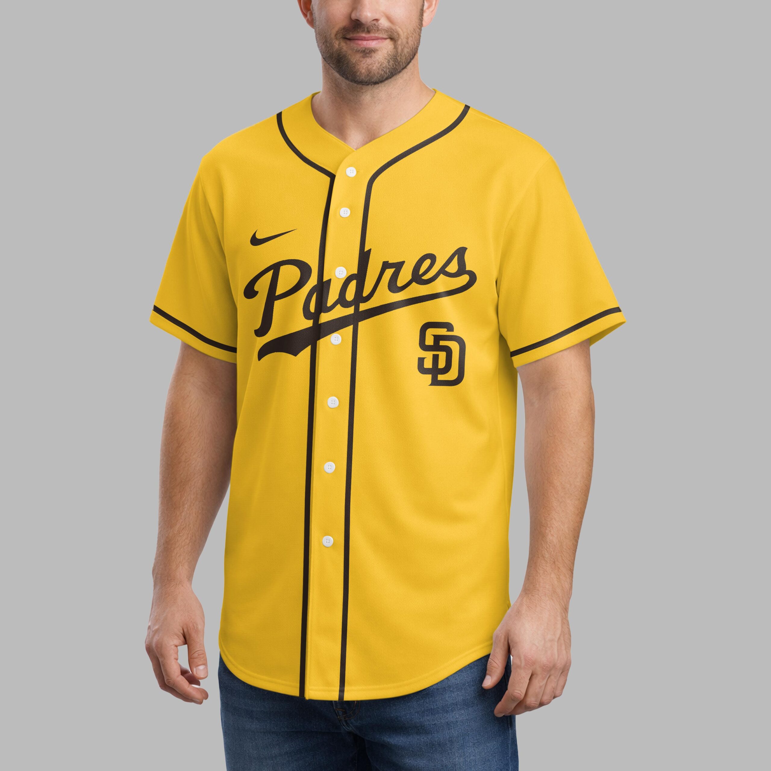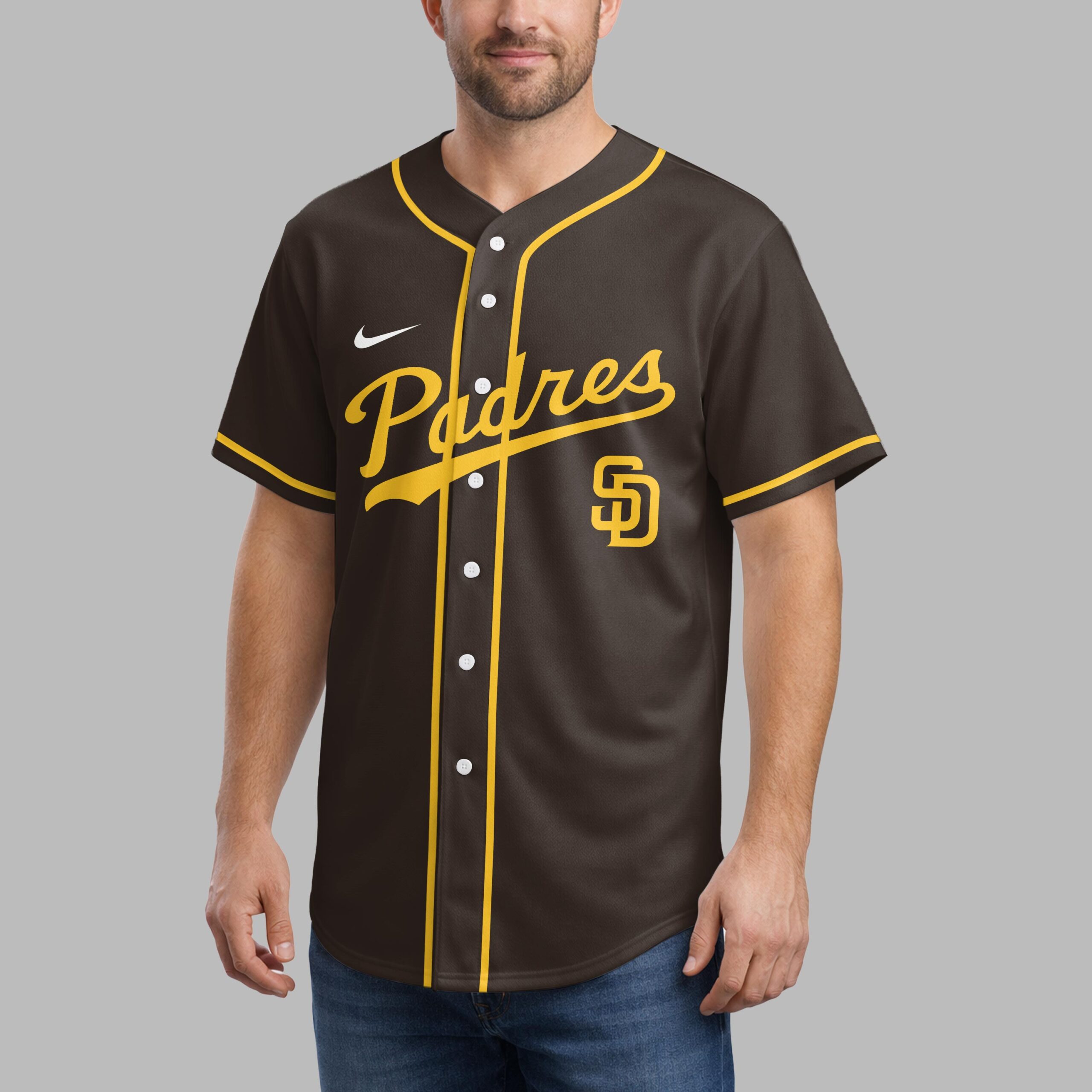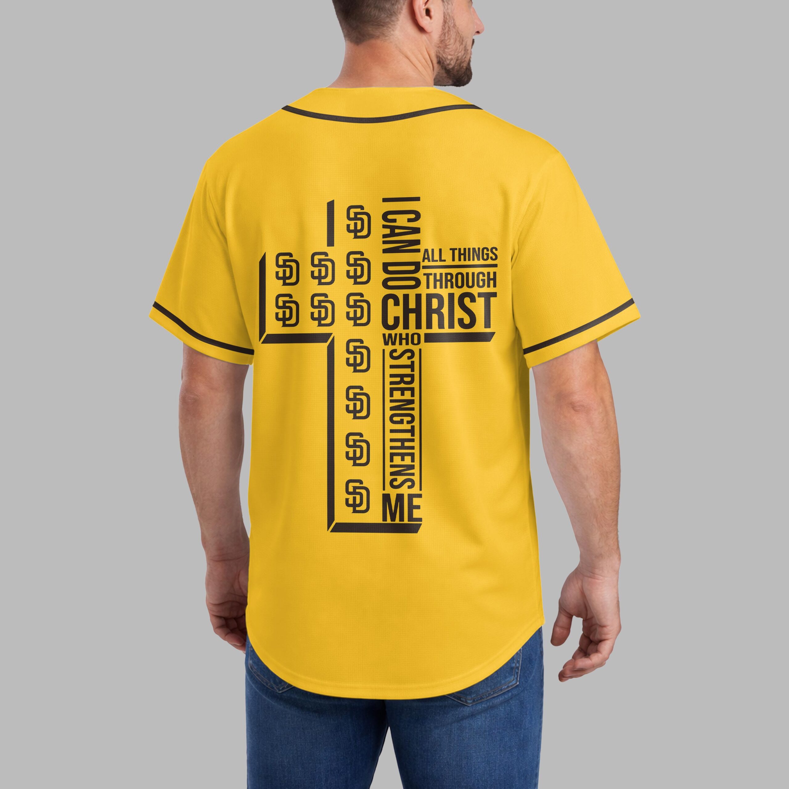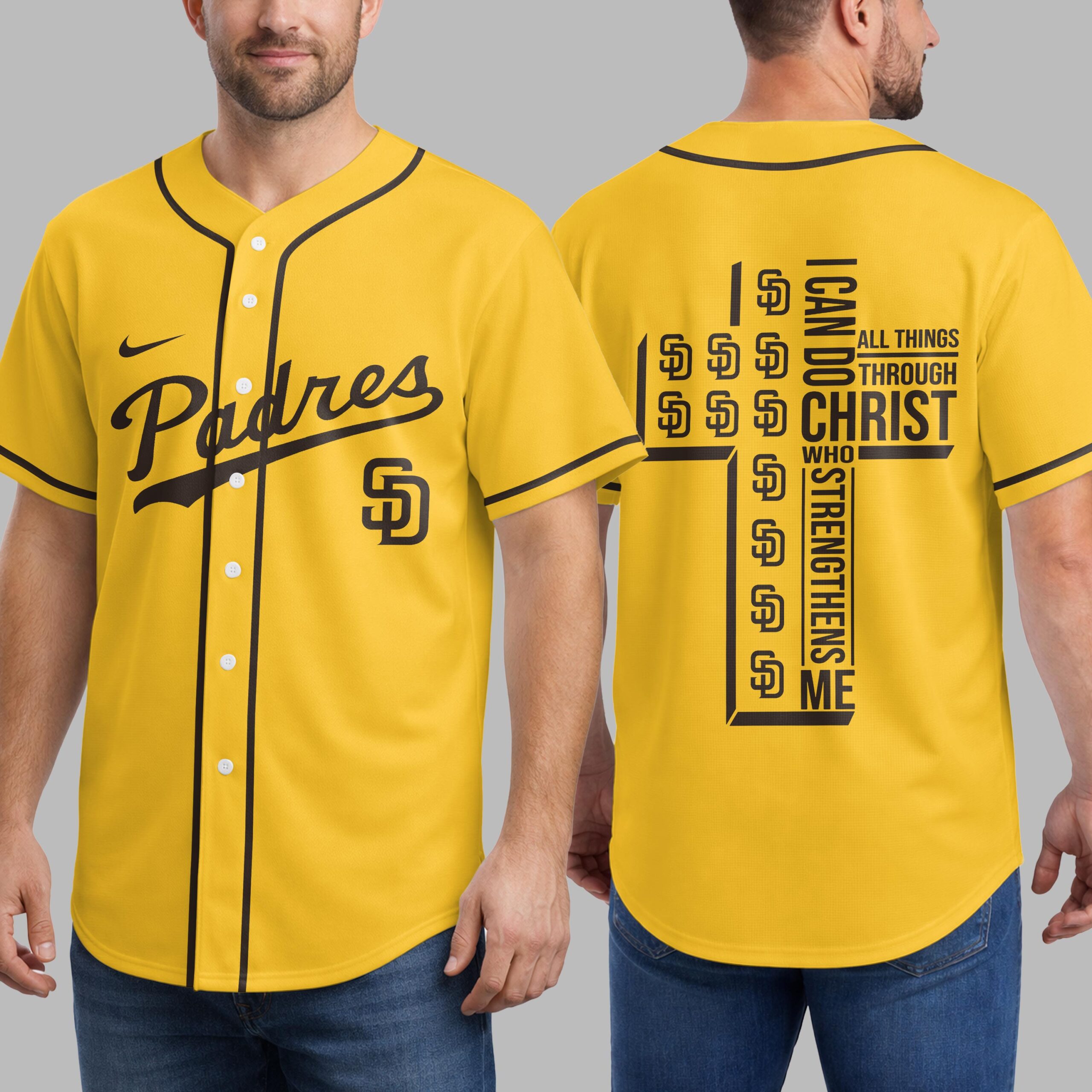 Show your unwavering team spirit and personal conviction with this unique San Diego Padres baseball jersey. Designed for fans who find strength in both their team and their faith, this shirt connects your passion for baseball with an inspiring message of resilience. The front proudly displays Padres in a classic yellow script, accompanied by the iconic SD logo, all against a rich dark brown backdrop with matching yellow piping. The back makes a powerful statement, featuring the verse I CAN DO ALL THINGS THROUGH CHRIST WHO STRENGTHENS ME artfully arranged into a bold white cross, accented by multiple SD logos. Perfect for cheering on the Padres at the ballpark, attending faith-based events, or simply expressing your dual devotion in everyday life. This jersey is more than just fan gear; it’s a testament to what truly strengthens you, whether it’s hitting a home run or overcoming life’s challenges.