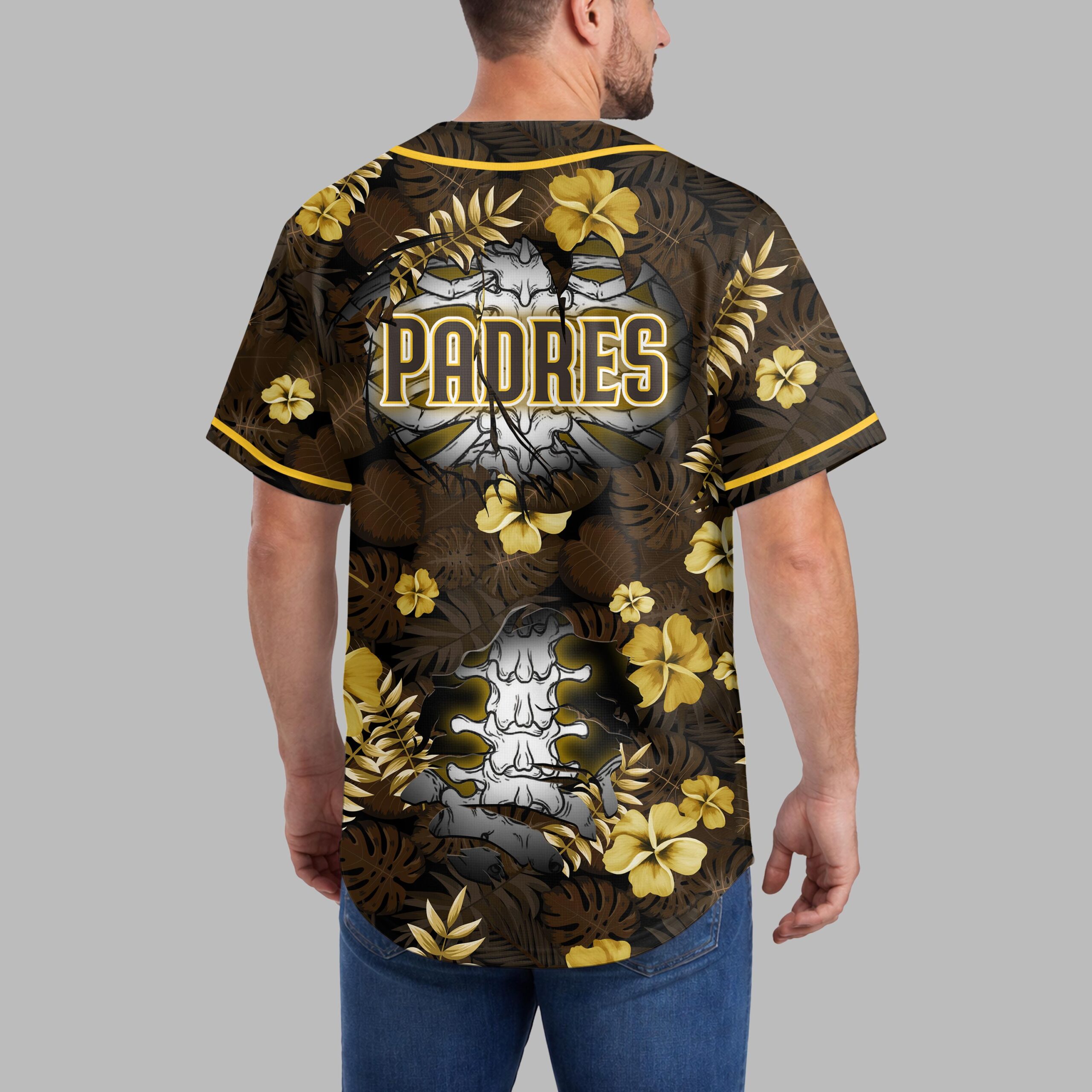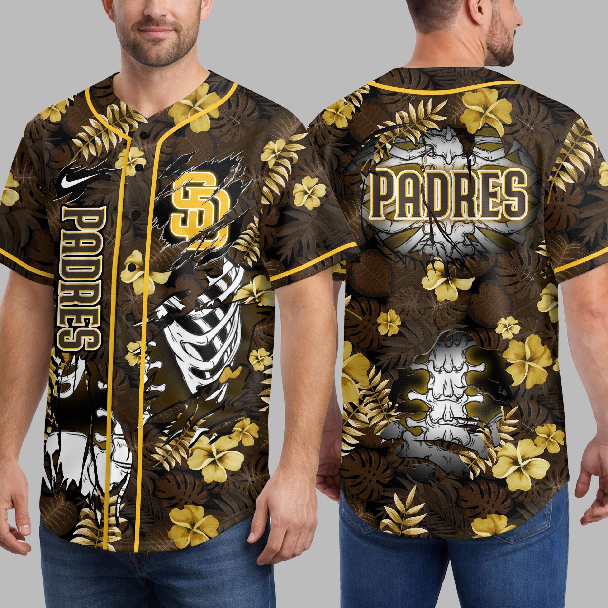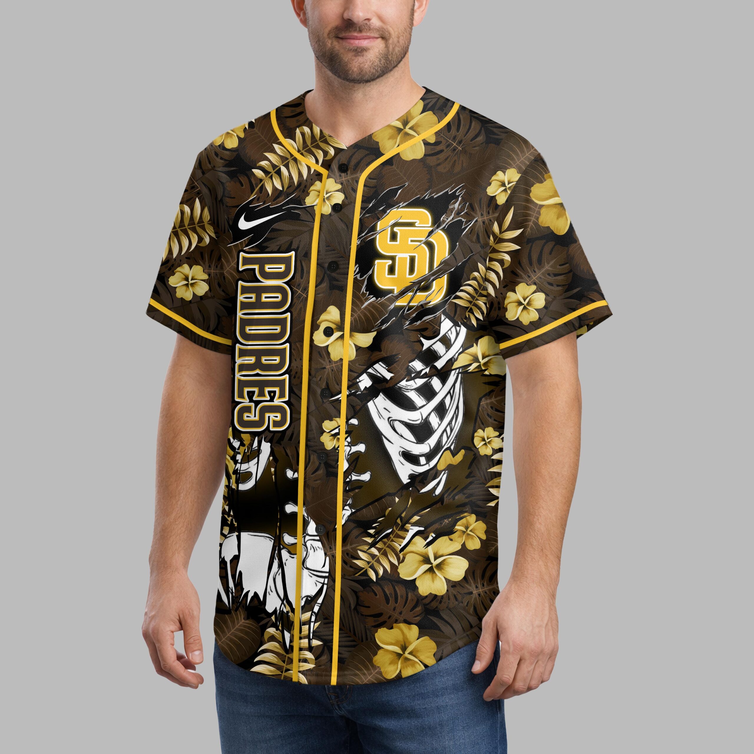 Unleash your ultimate San Diego Padres spirit with this uniquely designed baseball jersey! Perfect for fans who love to stand out, this shirt masterfully blends vibrant team pride with a cool, laid-back tropical vibe. Show your unwavering loyalty to the Padres with a look that’s both energetic and distinct, perfect for any occasion. The front features a striking brown background adorned with lush tropical leaves and golden yellow hibiscus flowers, creating an eye-catching backdrop. The iconic SD logo boldly appears as if ripping through the fabric, revealing a fierce skeleton rib cage beneath. A vertical PADRES text strip adds an extra layer of team identity, complemented by a sleek Nike swoosh on the sleeve. Whether you’re cheering from the stands at Petco Park, enjoying a casual day out, or heading to a beachside gathering, this Padres jersey is your go-to. It’s an ideal way to express your passion for San Diego baseball with a refreshing tropical twist that’s sure to turn heads and spark conversations.