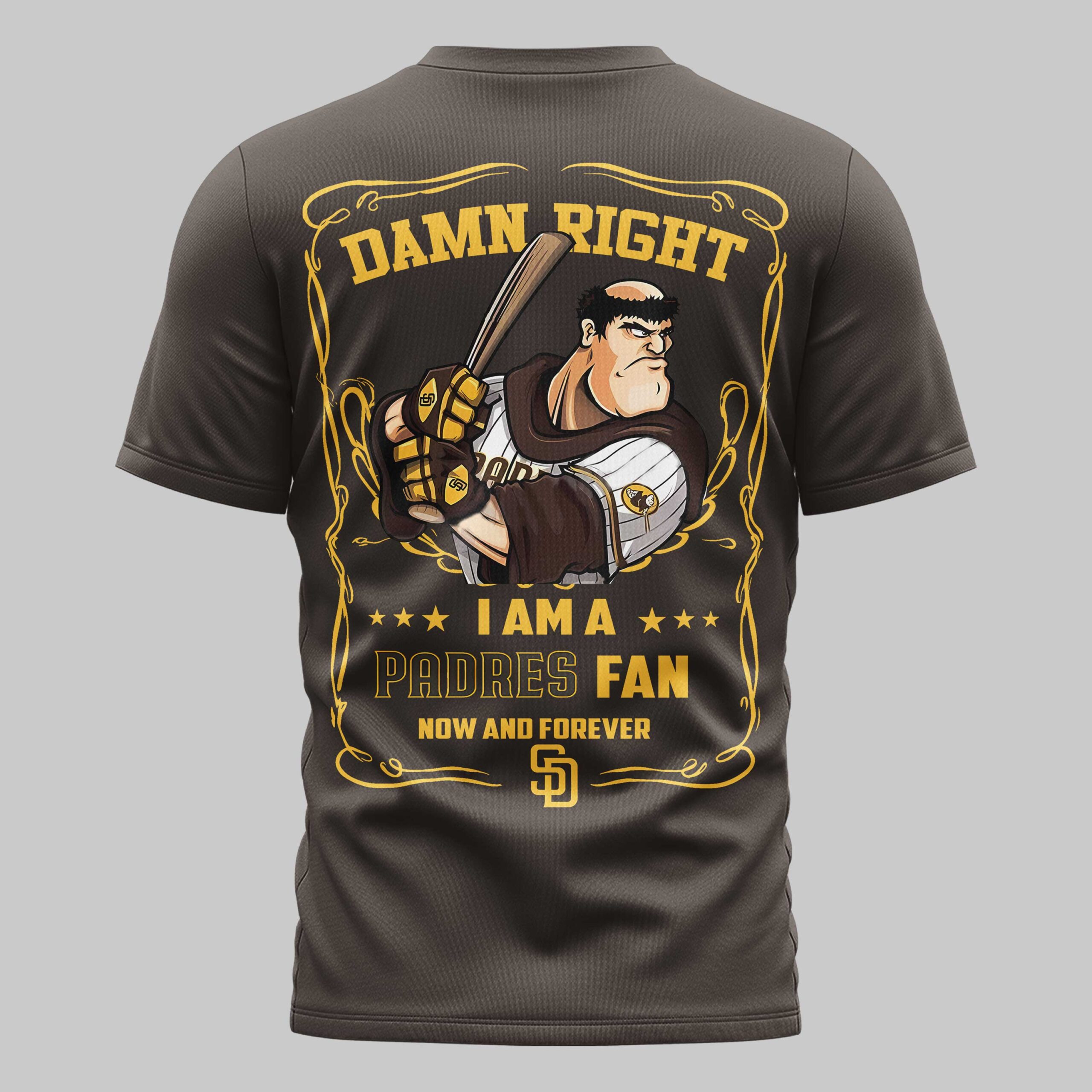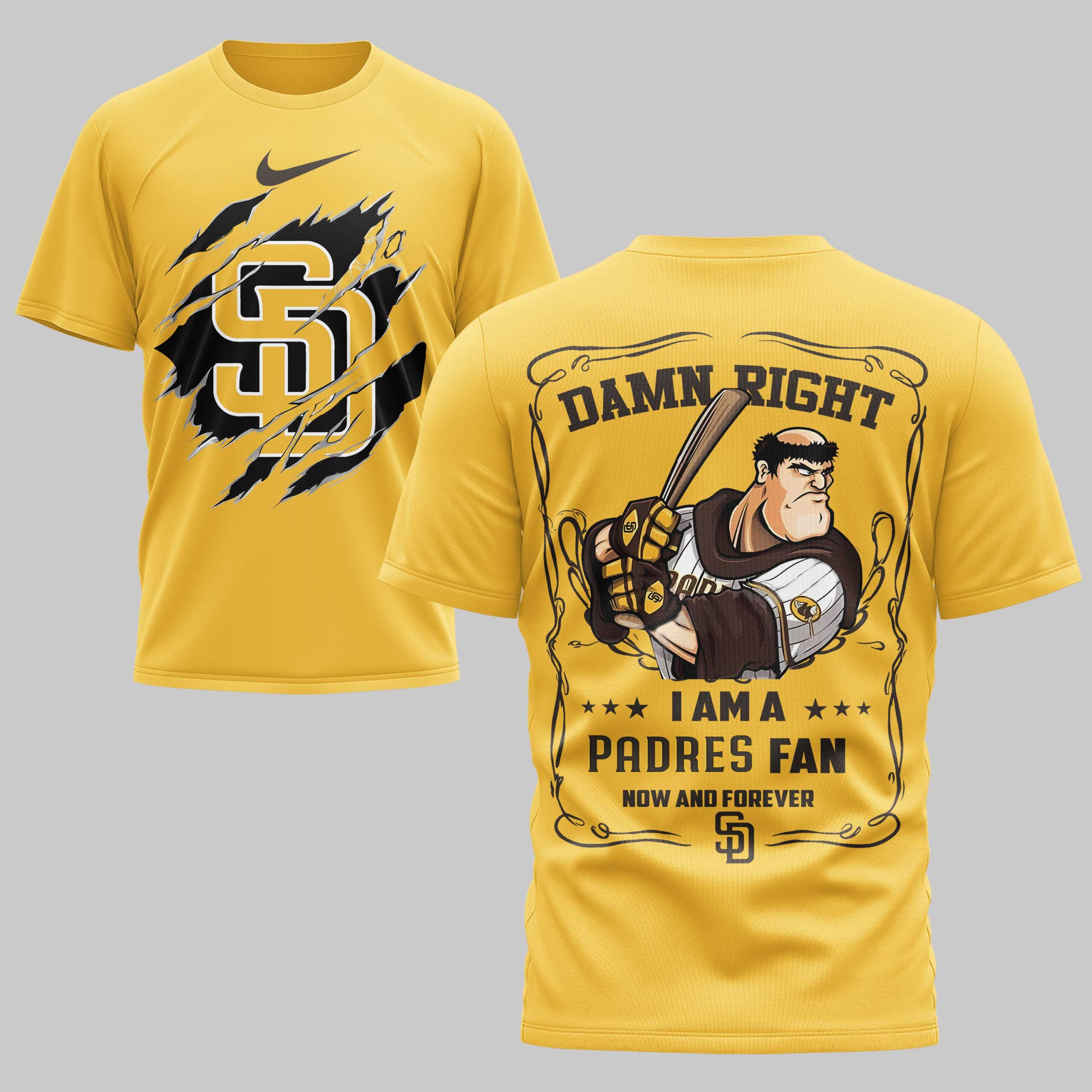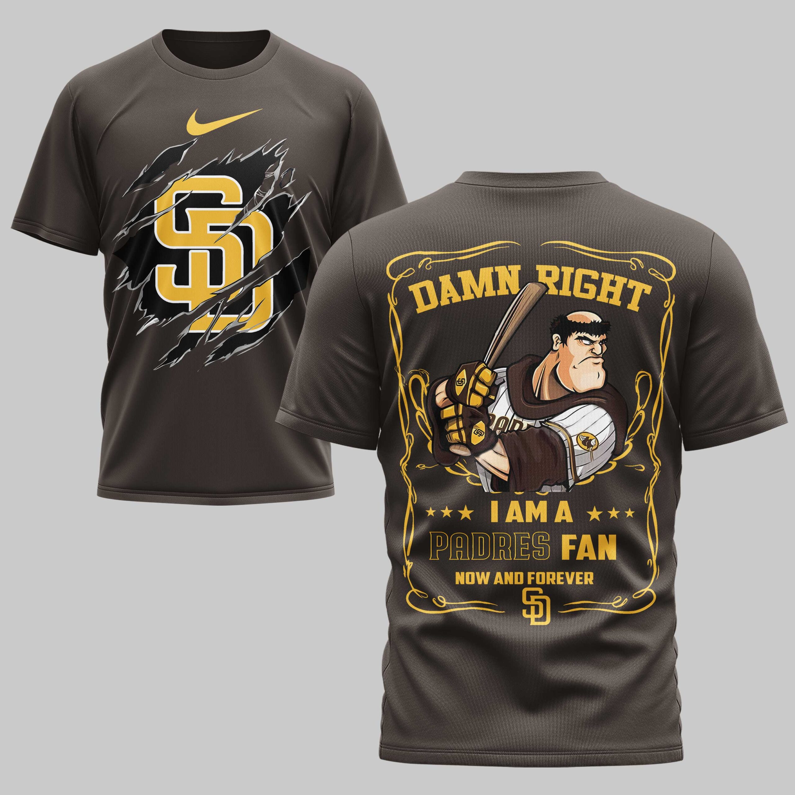 Showcase your undeniable loyalty to the San Diego Padres with this bold and spirited fan tee. Perfect for those who stand by their team through every pitch, every inning, and every season, this shirt makes an emphatic statement of true Padres pride. It’s more than just apparel; it’s a declaration of unwavering dedication to your favorite baseball squad. The front of the shirt features the iconic SD logo dynamically tearing through the fabric, symbolizing the fierce spirit of the Padres. Turn around to reveal an assertive Padres player, bat in hand, accompanied by the powerful declaration: DAMN RIGHT I AM A Padres FAN NOW AND FOREVER. This striking design captures the gritty determination of a true fan. Whether you’re cheering from the stands at Petco Park, gathering with fellow fans for a watch party, or simply going about your day, this tee is your go-to for expressing passionate team support. Wear it loud and proud to every game, tailgate, or casual outing to let everyone know where your baseball allegiance lies.