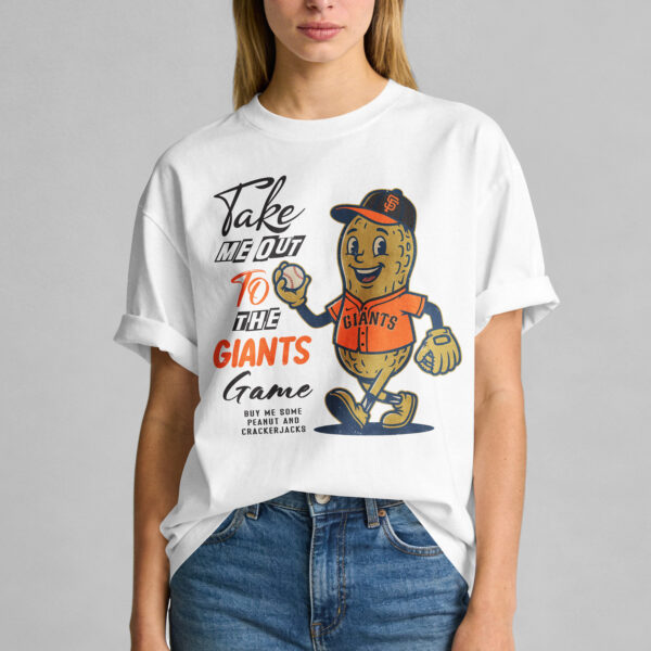 Show your San Francisco Giants pride with a fun, nostalgic twist! This unique tee perfectly captures the cherished traditions of game day, blending humor and classic baseball spirit for any dedicated fan. The design features an adorable animated peanut character, fully decked out in a Giants uniform with an orange GIANTS jersey and an SF logo cap, holding a baseball. Playful lyrics Take ME OUT TO THE GIANTS Game and BUY ME SOME PEANUT AND CRACKERJACKS evoke the iconic ballpark anthem and beloved snacks. This shirt is a home run for any occasion! Wear it to Oracle Park, a watch party, or simply for a casual day out. It’s ideal for game days, summer fun, or just showing off your Giants loyalty with a smile.