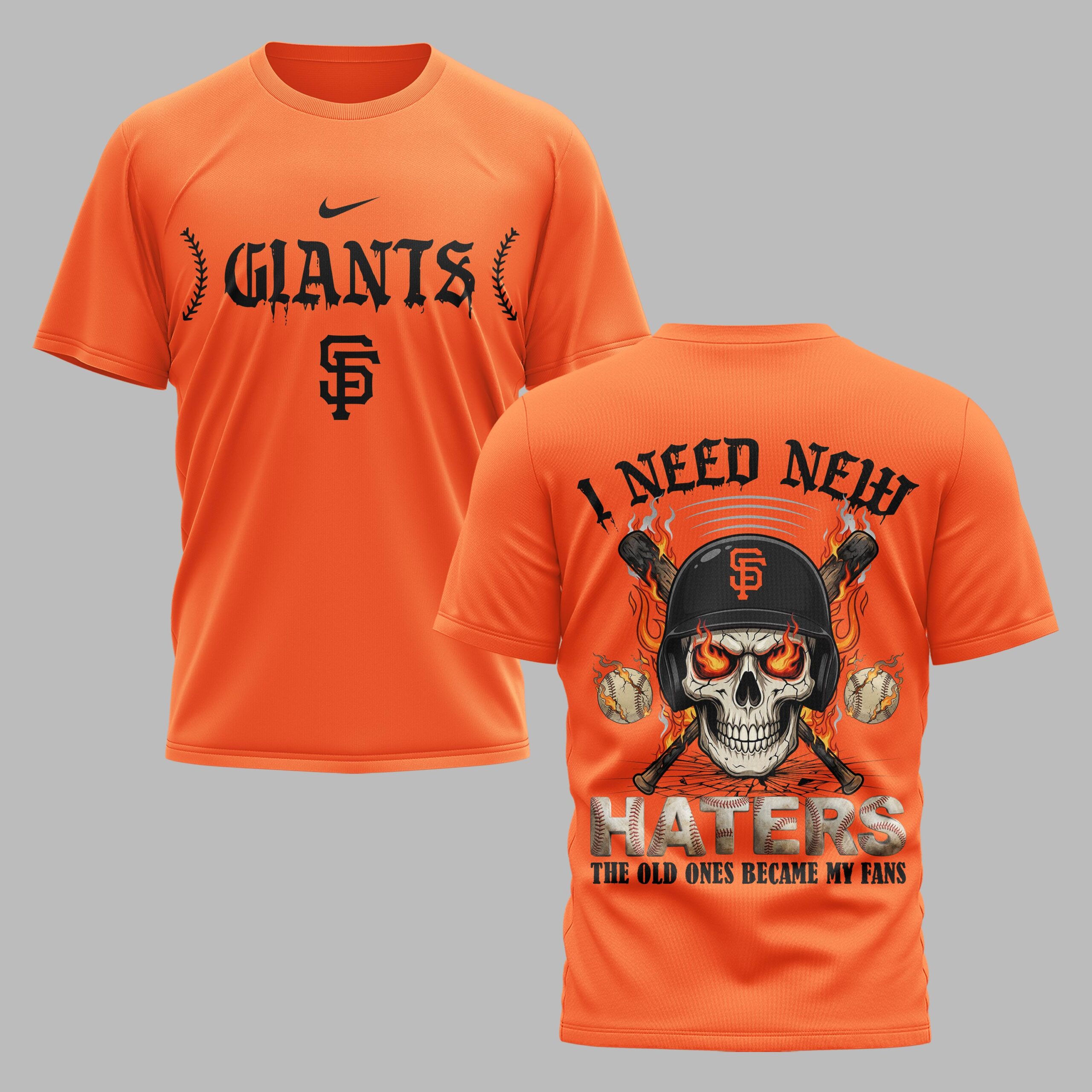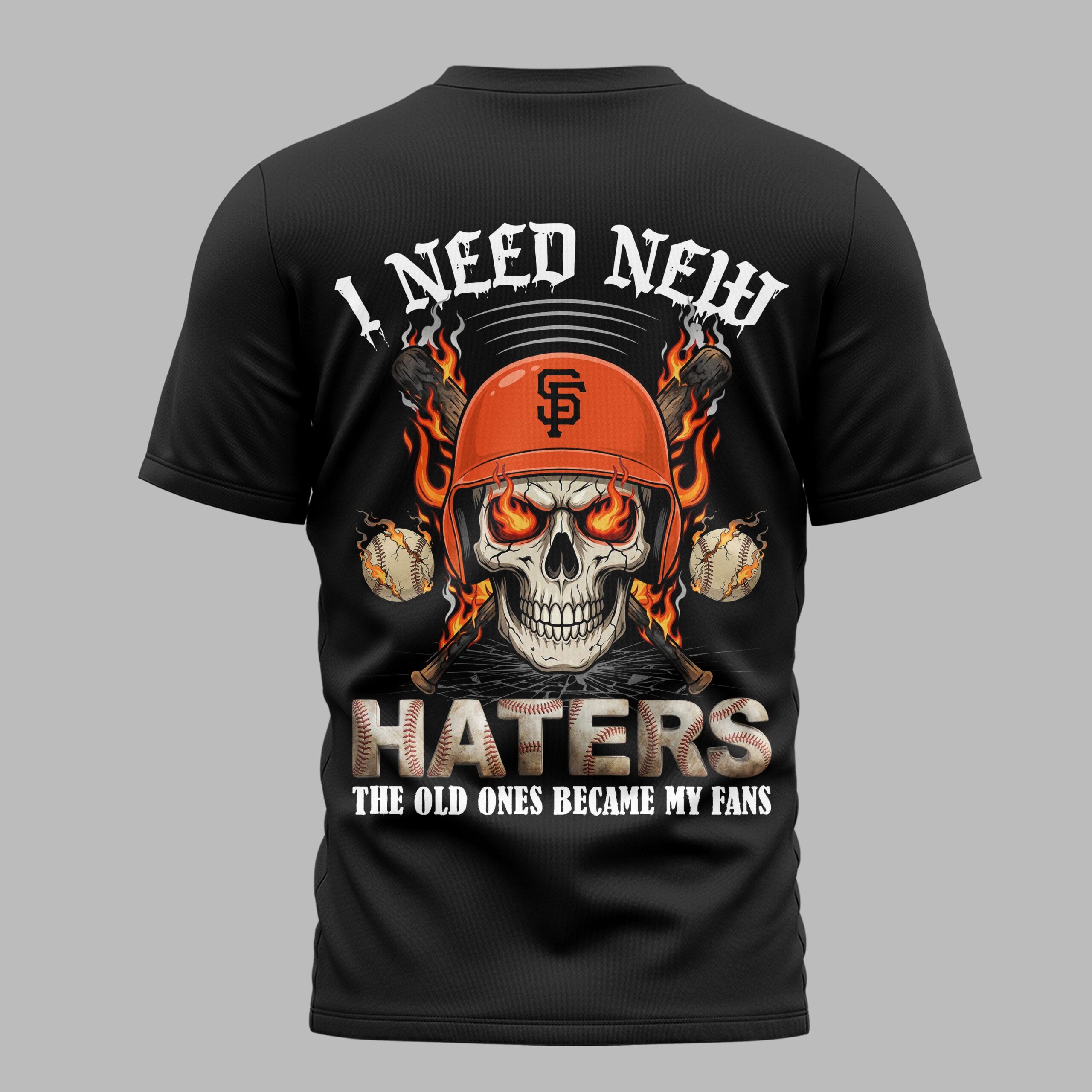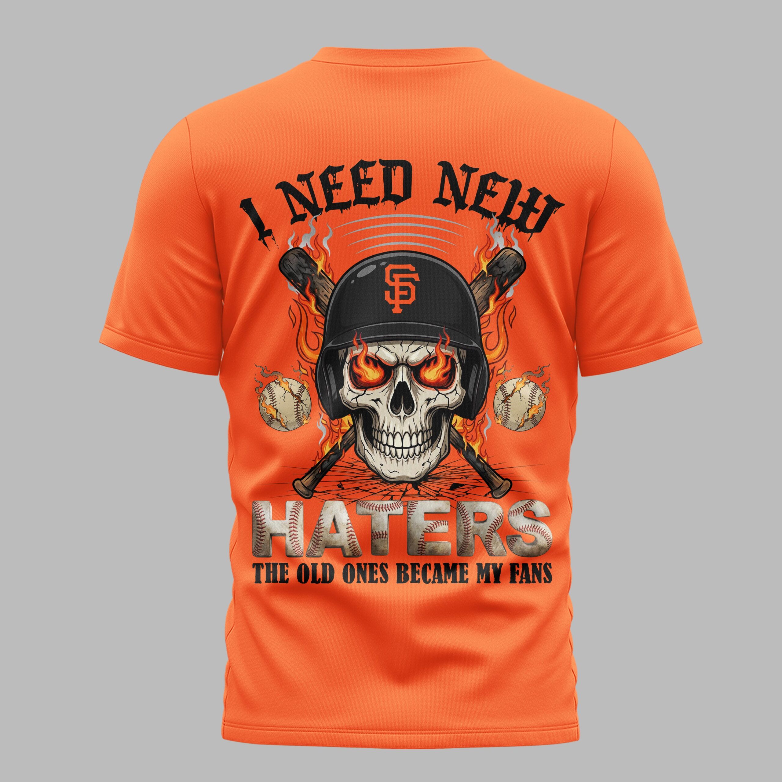 Unleash your ultimate SF Giants fan energy with a tee that speaks volumes about your loyalty and undeniable confidence. This isn’t just game day apparel; it’s a bold declaration for every devoted fan who knows their team reigns supreme, turning skeptics into admirers with every win. Stand out in the crowd and let your Giants pride blaze hotter than ever. The front proudly displays ‘GIANTS’ in a rugged, dripping white font, flanked by classic red baseball stitching, with the iconic ‘SF’ logo beneath. The real statement explodes on the back: a fierce skull rocking an orange Giants helmet with flaming eyes, framed by crossed baseball bats and fiery baseballs. Above, the bold declaration ‘I NEED NEW HATERS’ sets the stage, with ‘THE OLD ONES BECAME MY FANS’ etched below in a cool baseball texture. Perfect for cheering loudly at the ballpark, dominating game day watch parties, or simply showcasing your fearless Giants spirit around town. This tee is ideal for any passionate fan ready to make a powerful statement about their team allegiance and undying support, commanding attention wherever you go.