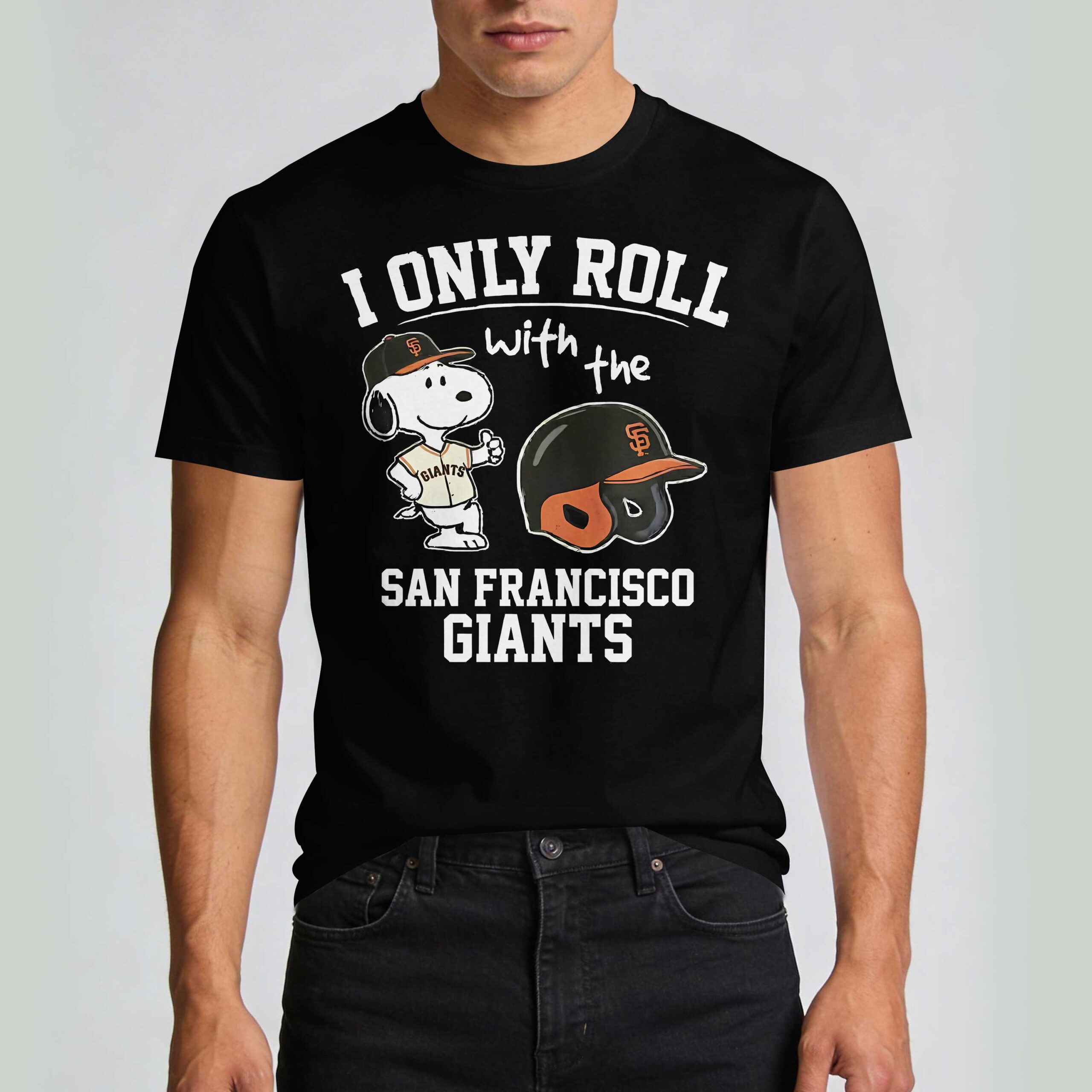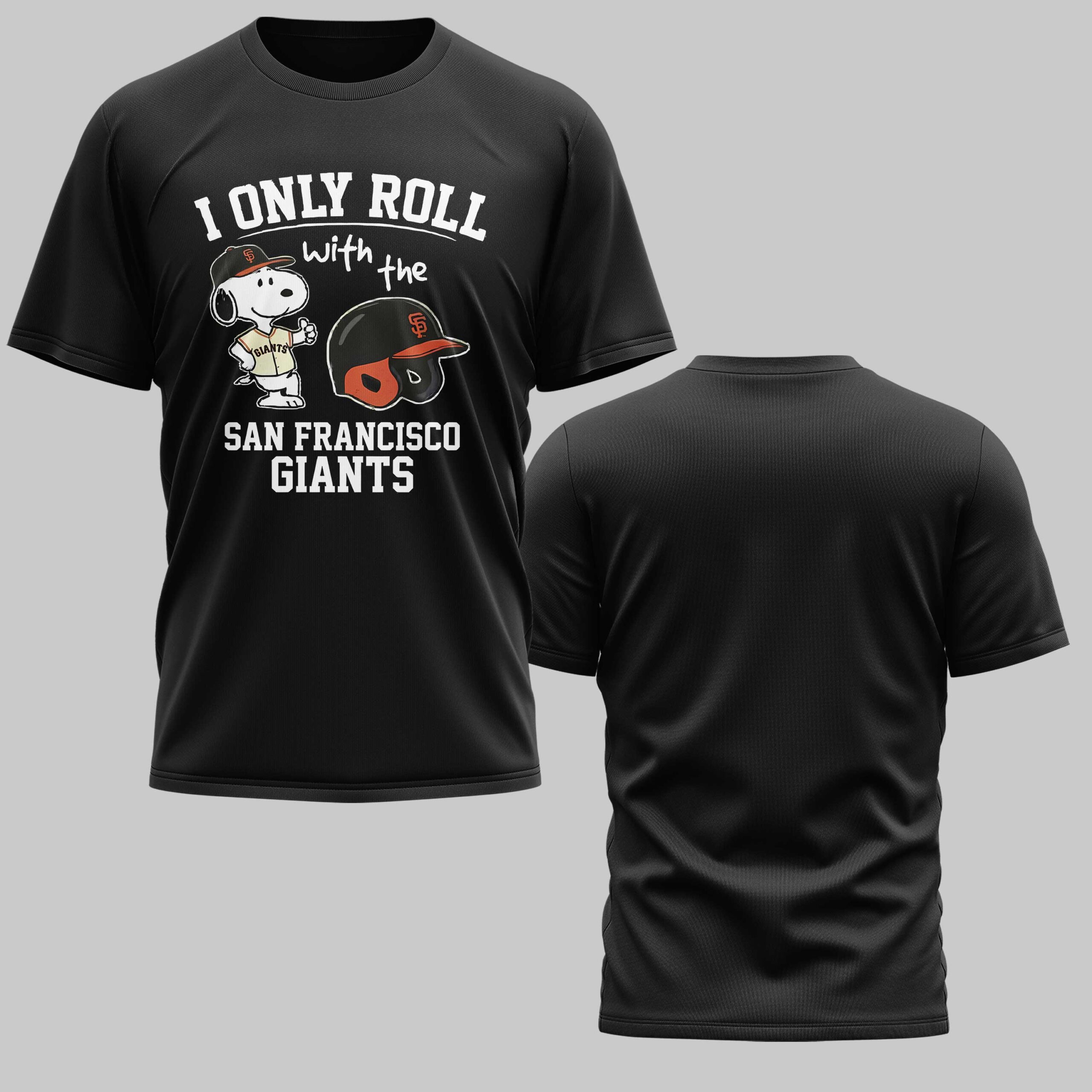 Show off your unwavering loyalty to the San Francisco Giants with this spirited fan tee! It’s the perfect way to combine your love for baseball and the beloved Peanuts character, Snoopy, in one dynamic statement of team pride. This shirt speaks volumes about where your allegiance lies, making it a must-have for any true supporter. The front design proudly features a cheerful Snoopy, decked out in his own Giants jersey and cap, giving a confident thumbs-up. Beside him sits an authentic-looking black and orange Giants batting helmet, complete with the iconic SF logo. Bold white text declares, I ONLY ROLL with the SAN FRANCISCO GIANTS, leaving no doubt about your favorite team. The back of the shirt is a classic, solid black. Whether you’re cheering from the stands at Oracle Park, hosting a game day watch party, or simply heading out for a casual day, this tee is your go-to. It’s an ideal choice for showing your Giants spirit during the season, off-season, or any time you want to celebrate your favorite baseball team.