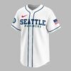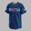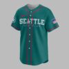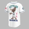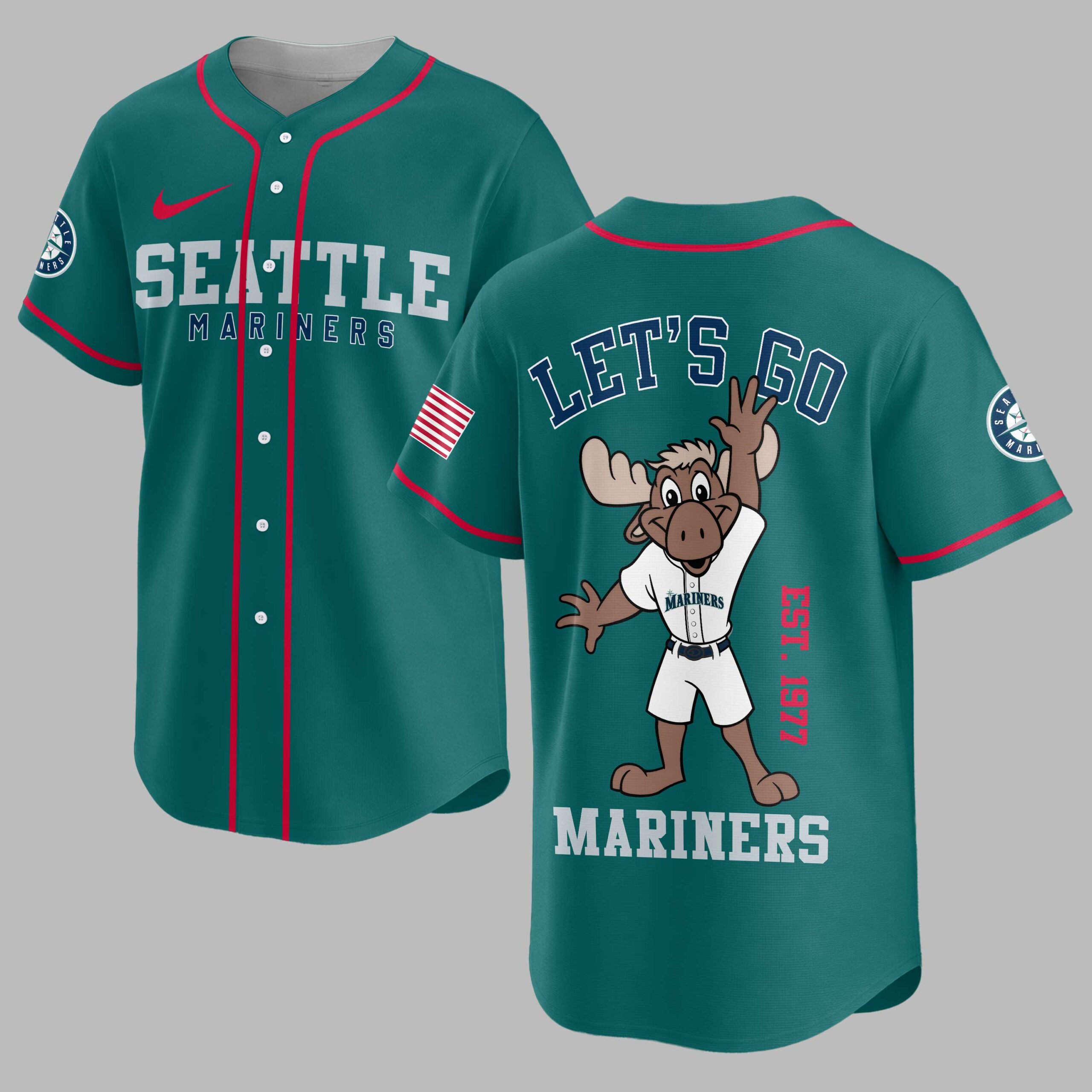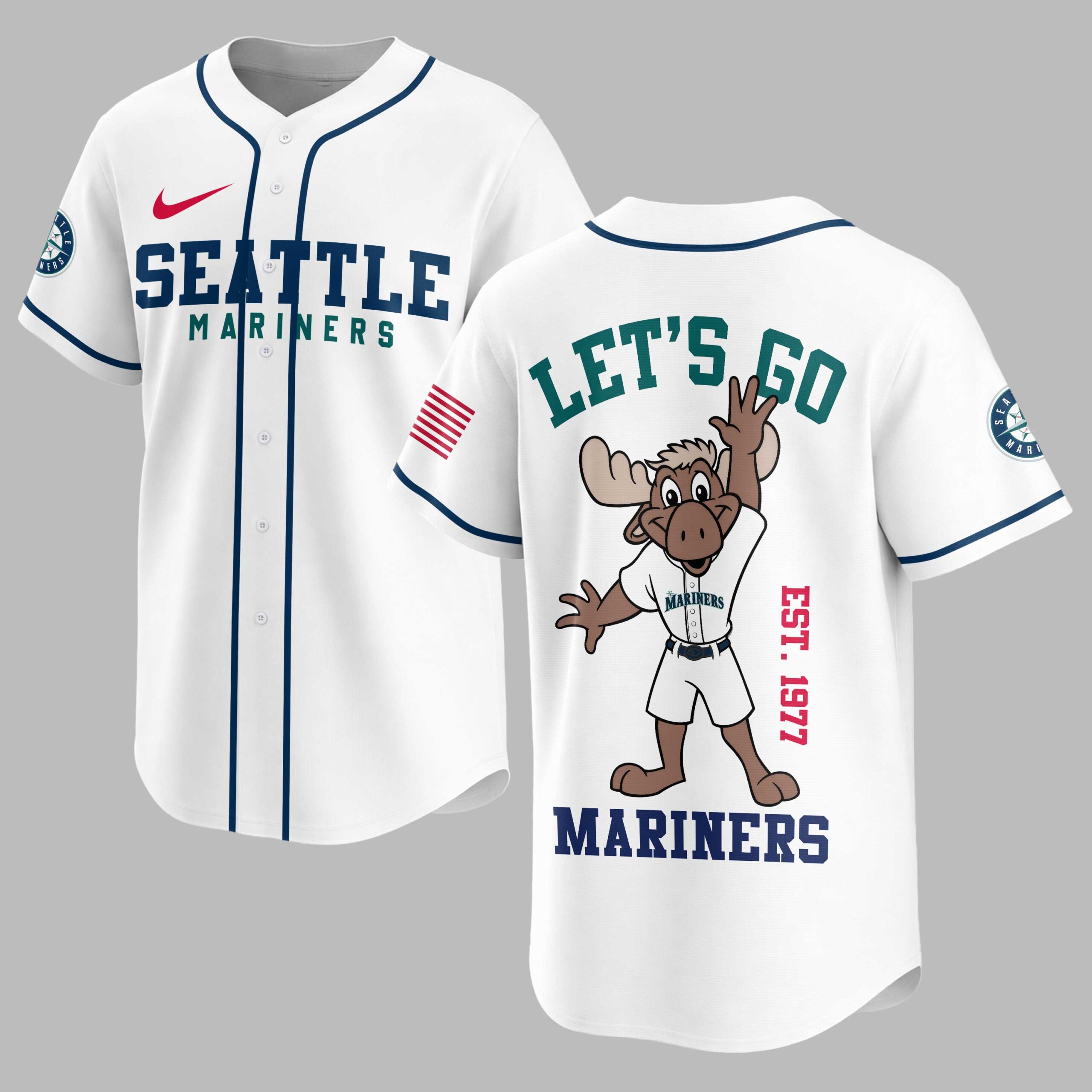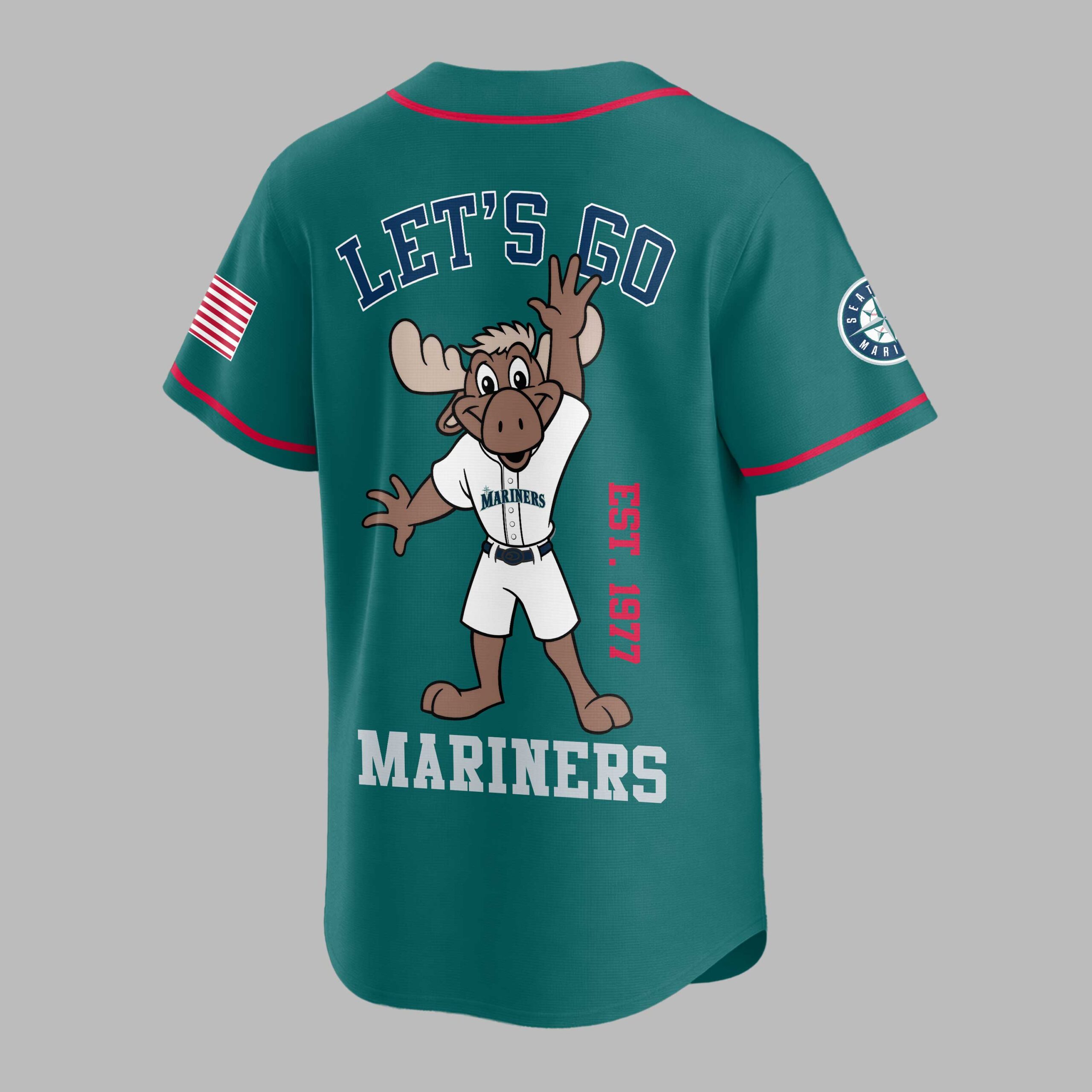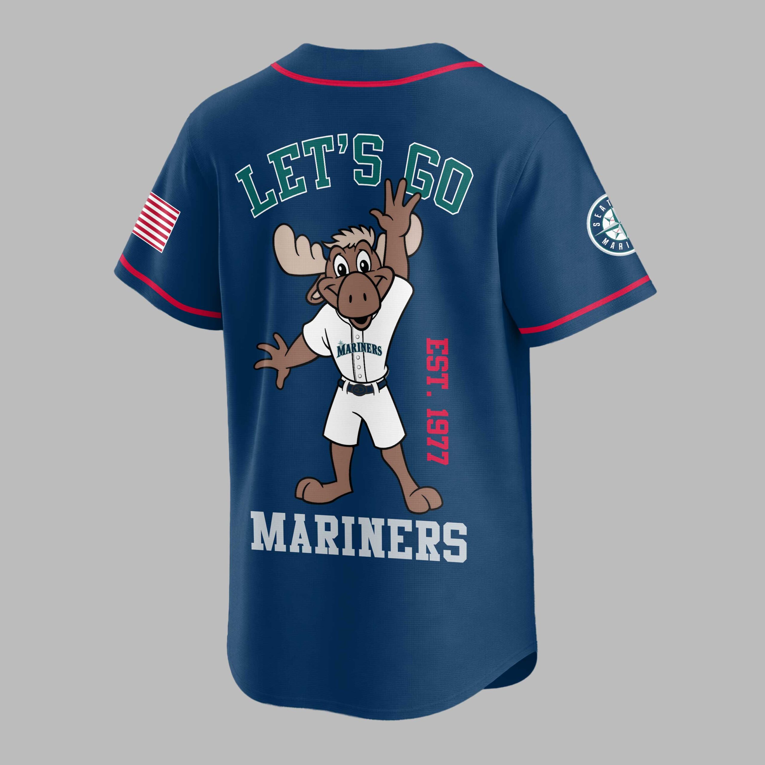 Rally behind your favorite team with this vibrant Seattle Mariners baseball jersey, perfect for any devoted fan! Show your unwavering spirit and celebrate the enduring legacy of the Mariners, capturing the exciting energy of game day and the pride of supporting your team, established in 1977. The front proudly displays SEATTLE MARINERS in bold team colors, along with the iconic Mariners compass logo on the sleeve and an American flag patch, signifying true fan loyalty. The back features an energetic, cartoon moose mascot, fully decked out in a Mariners uniform, with the rallying cry LET’S GO above and MARINERS below, alongside EST. 1977 to honor the team’s history. Whether you’re catching a game at the ballpark, hosting a spirited watch party, or simply out and about, this jersey is designed to make a statement. It’s the perfect way to wear your passion on your sleeve and cheer on the Seattle Mariners with undeniable enthusiasm.