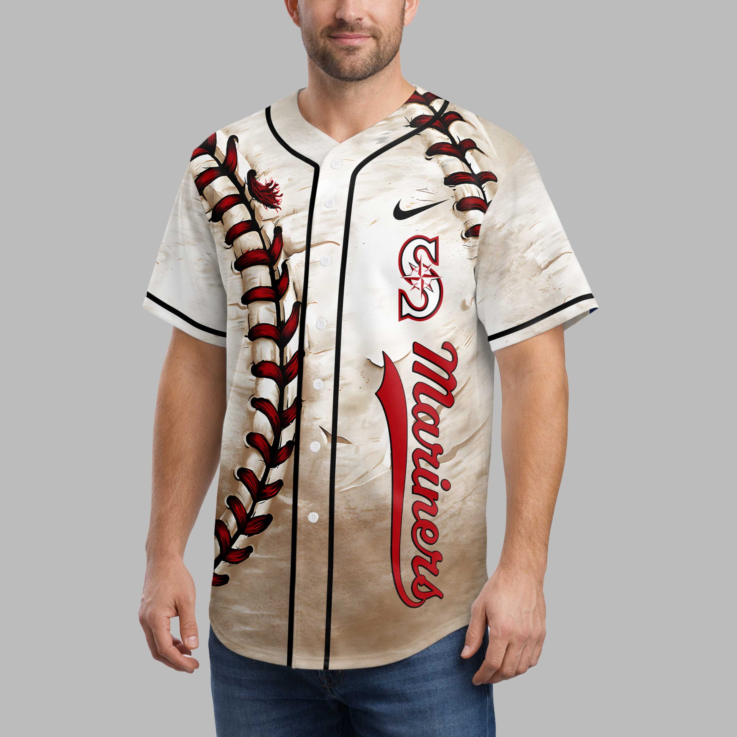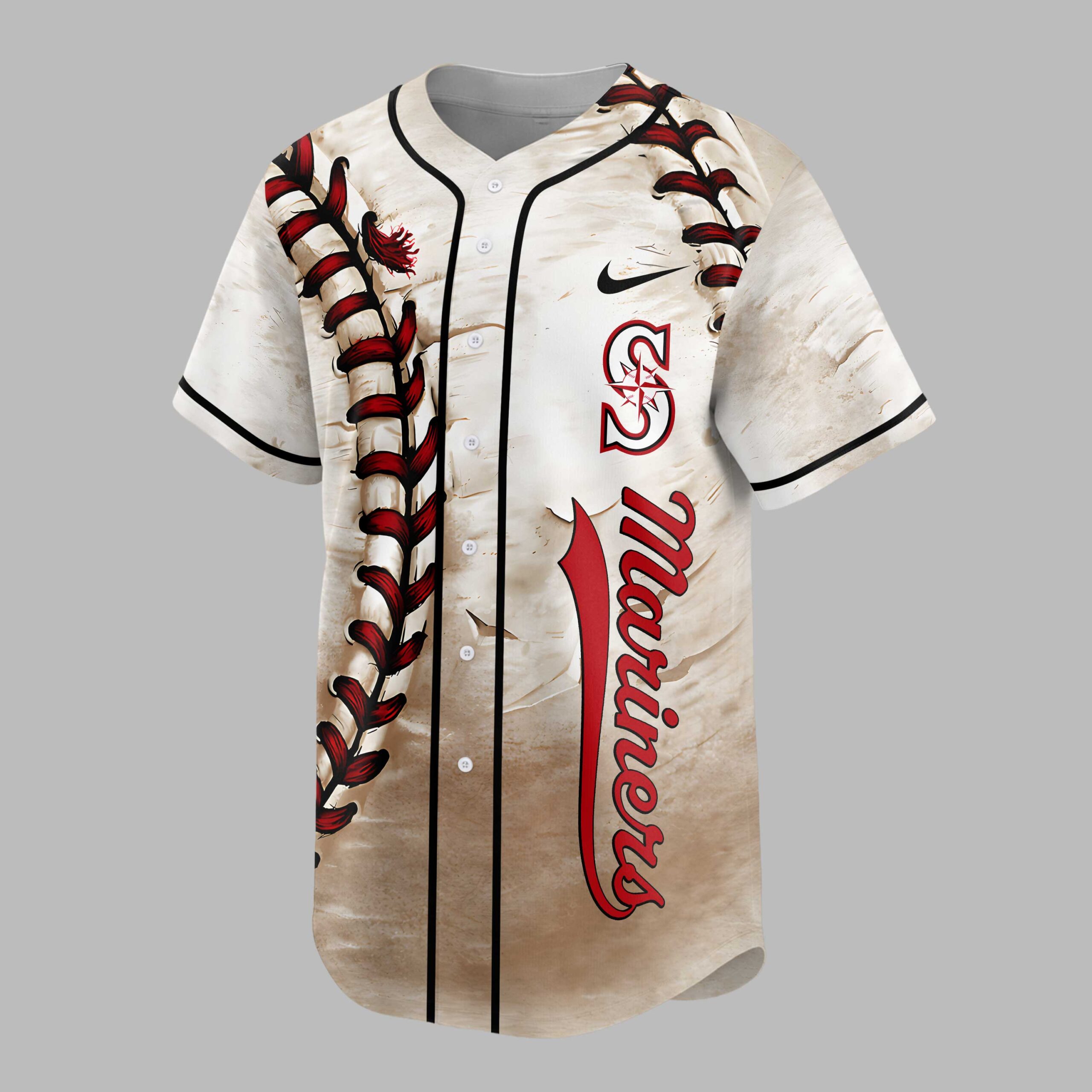 Show your unwavering loyalty with our custom baseball jersey, inspired by the iconic Seattle Mariners. It’s the ultimate statement piece for any fan who lives and breathes baseball, letting you personalize your gear with vintage flair. The front boasts a distinctive distressed look, reminiscent of a well-loved game day uniform. A bold ‘Mariners’ script, featuring a compass rose and intricate baseball stitch pattern, proudly displays your allegiance. The back awaits your personal touch: add ‘Your Name’ and favorite number in a striking, baseball-themed font. Whether cheering from the stands or gathering with friends, this jersey is designed to stand out. It’s ideal for game days, summer outings, or any occasion to celebrate your Mariners passion and America’s favorite pastime.