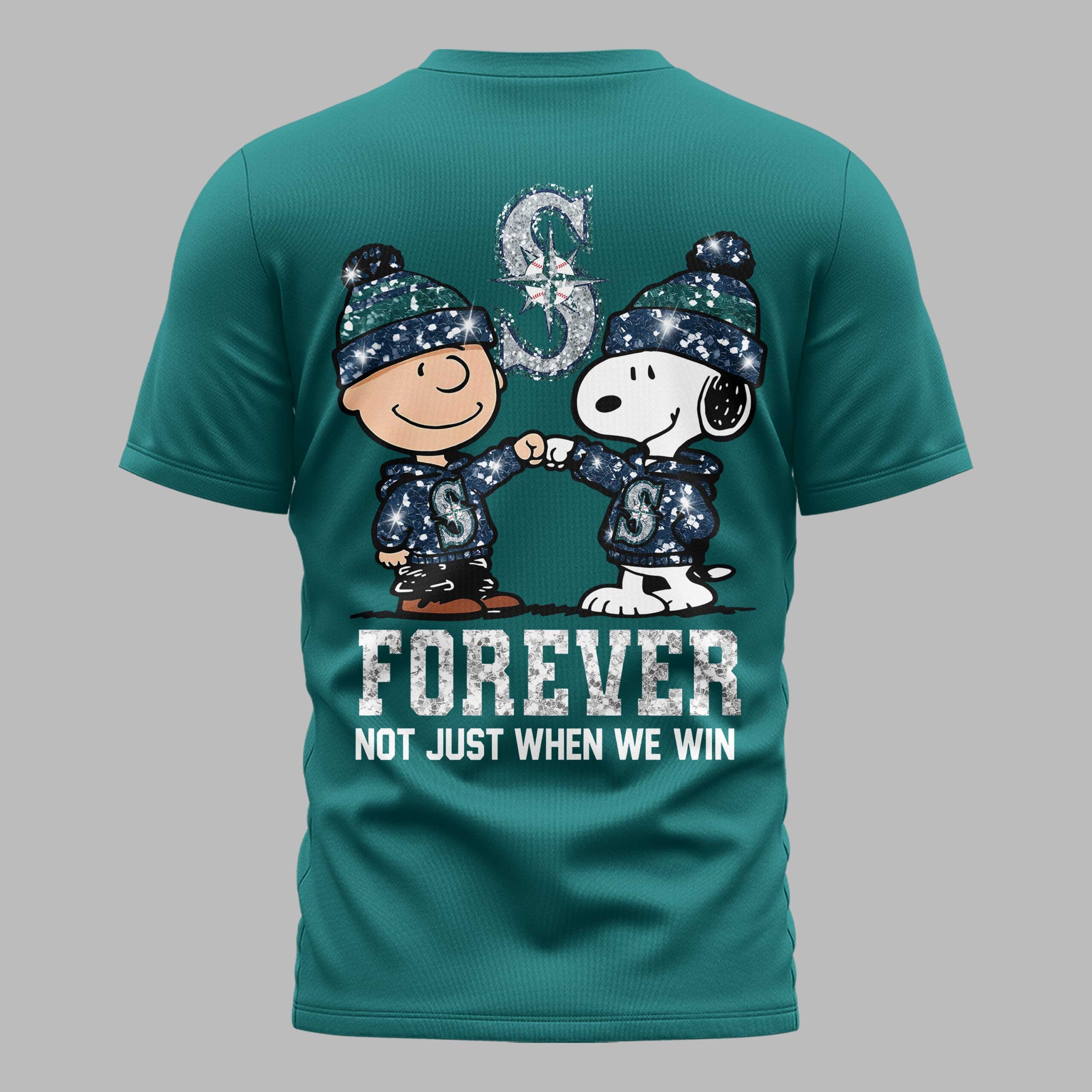 Declare your unwavering devotion to the Seattle Mariners with this charming and spirited fan tee! It’s more than just a shirt; it’s a symbol of loyalty, bringing together the timeless appeal of Peanuts with your favorite baseball team. Perfect for every true fan, this shirt celebrates the spirit of sticking with your team, win or lose. The front of the shirt proudly displays the classic Seattle Mariners S logo, infused with a sparkling, glitter-like texture that catches the eye. On the back, an adorable graphic takes center stage, featuring Charlie Brown and Snoopy, both sporting Mariners-themed beanies and hoodies, sharing a fist bump of solidarity. Above them, a larger, shimmering Mariners logo stands tall, while below, the bold statement FOREVER NOT JUST WHEN WE WIN resonates with undeniable team pride. Whether you’re heading to T-Mobile Park, hosting a game day watch party, or simply out and about, this shirt is the ultimate way to showcase your Mariners passion. It’s an ideal pick for those who bleed teal and navy, making it a fantastic gift for any dedicated fan who cherishes their team through every season.