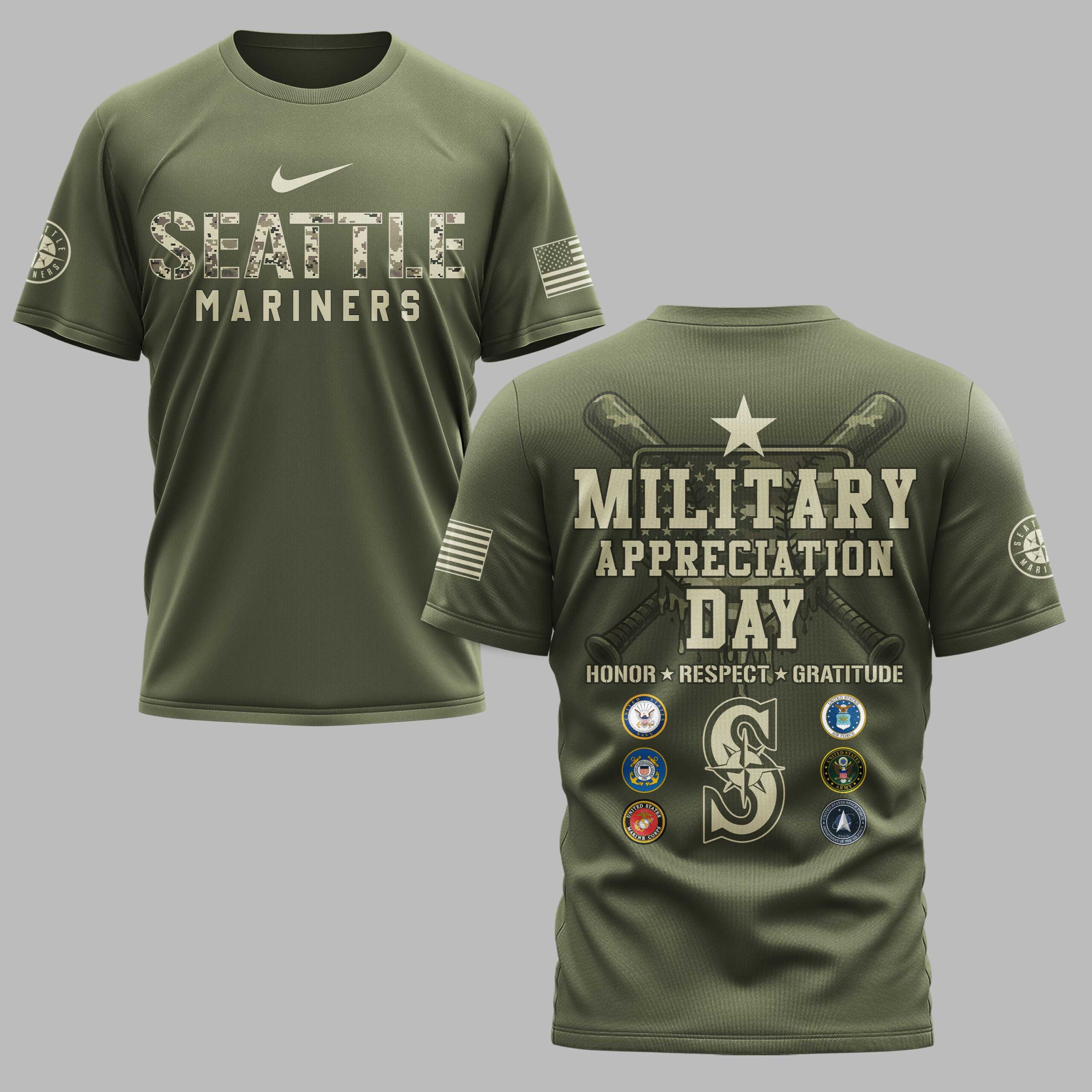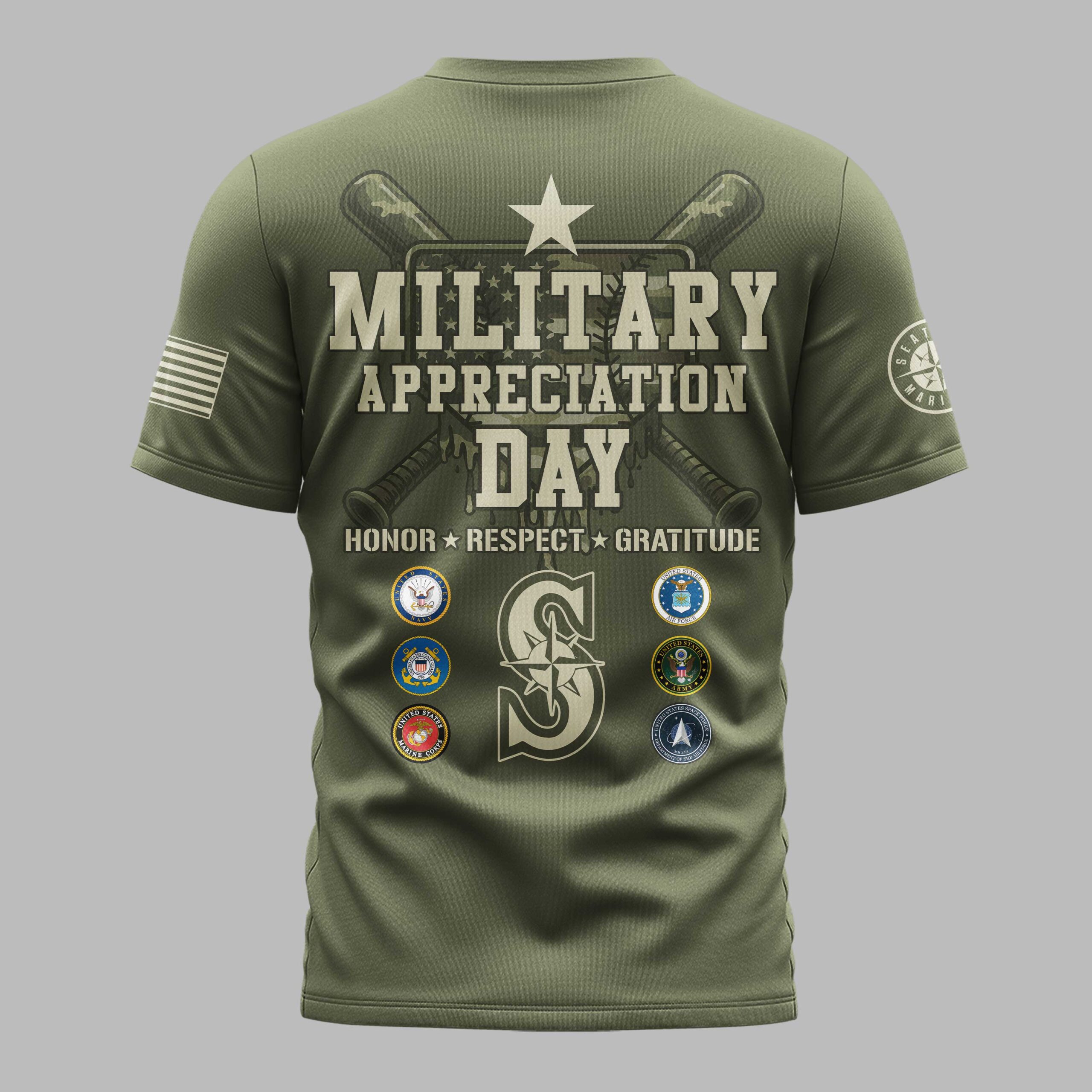 Show your unwavering support for the Seattle Mariners and proudly honor our nation’s heroes with this special Military Appreciation Day shirt. This tee is a powerful tribute, blending your passion for baseball with deep respect and gratitude for the brave men and women of the US Armed Forces. The front features SEATTLE in a striking digital camouflage pattern, with MARINERS boldly displayed below, accented by an American flag patch on the sleeve. The back is a profound statement, showcasing MILITARY APPRECIATION DAY above a star, crossed bats, and the inspiring message HONOR * RESPECT * GRATITUDE. Flanking a large Mariners S logo are the emblems of all six US military branches, making it clear where your allegiance lies. Perfect for game days, military appreciation events, Memorial Day, Veterans Day, or simply as a daily display of pride, this shirt is a must-have for any Mariners fan who cherishes freedom and honors service. Wear it with pride and let your patriotism shine!