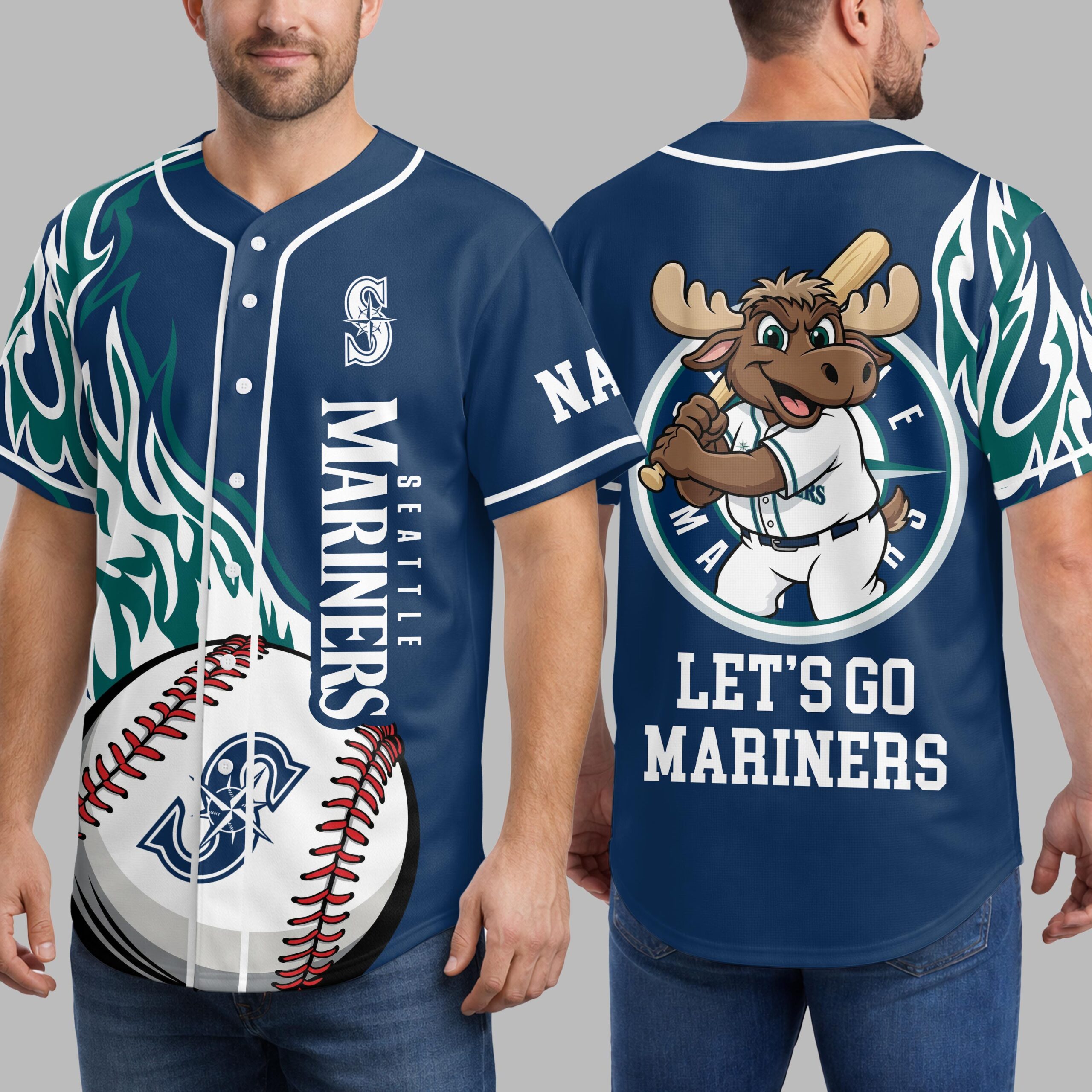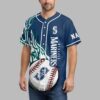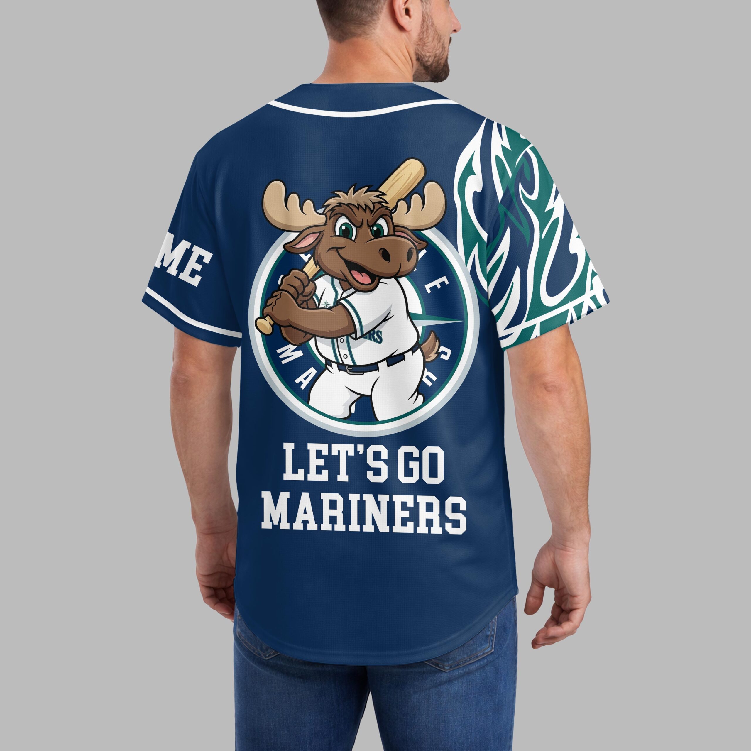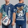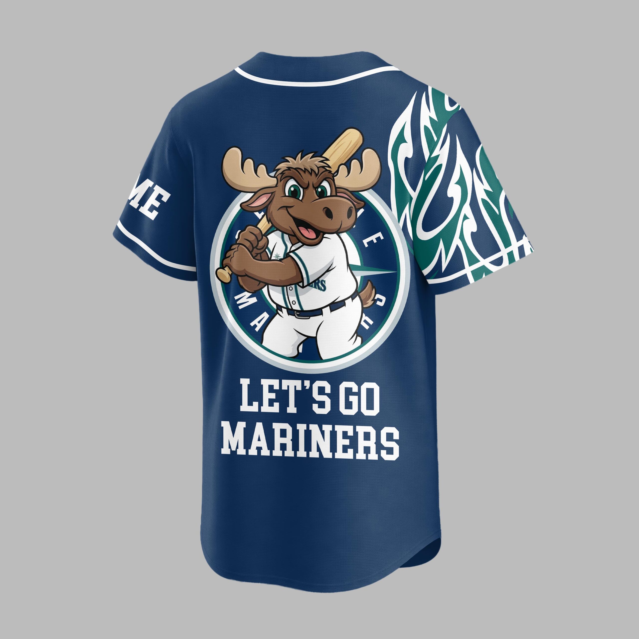 Rally behind your favorite team with this vibrant Seattle Mariners baseball jersey! Perfect for dedicated fans, this jersey captures the spirited energy of game day, letting you showcase your Mariners pride with undeniable flair. Get ready to cheer your team to victory in style. The front features dynamic green and white tribal patterns flowing across the shoulders, complementing the classic navy blue. The SEATTLE MARINERS name is boldly displayed vertically down one side, while a striking baseball graphic with the iconic S compass rose logo dominates the other. On the back, a cheerful moose mascot, geared up in a Mariners uniform and holding a bat, is ready for action, paired with the enthusiastic LET’S GO MARINERS slogan. Whether you’re at T-Mobile Park, hosting a watch party, or simply out and about, this jersey is designed for ultimate fan expression. It’s the ideal gear for game days, sporting events, or any casual occasion where you want to proudly represent the Seattle Mariners.