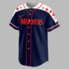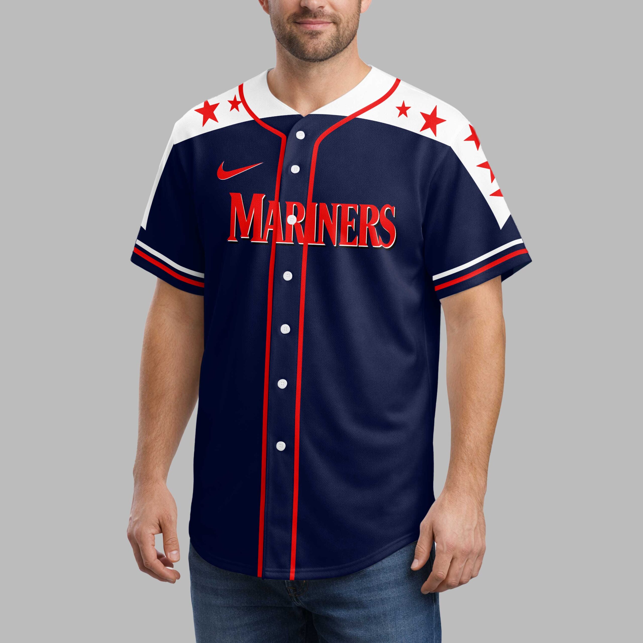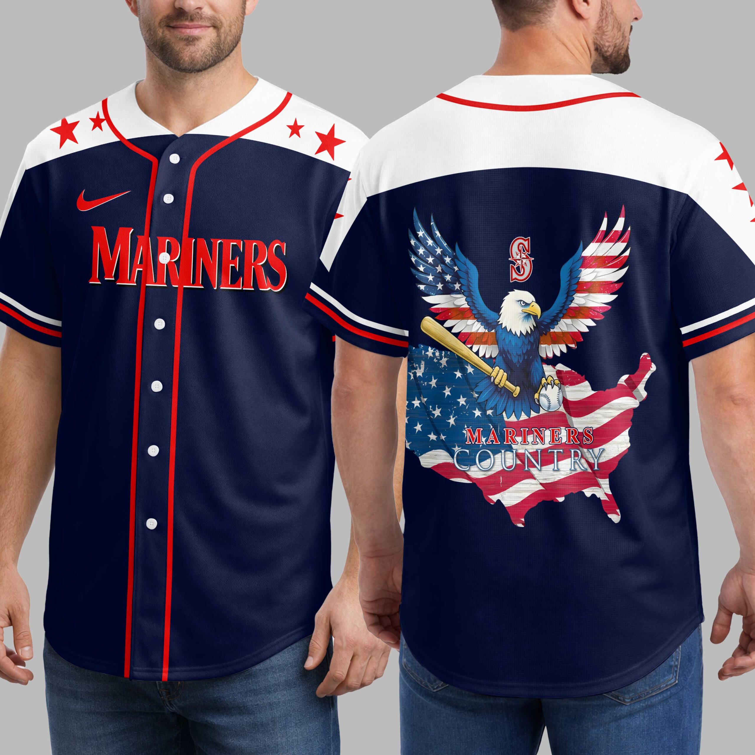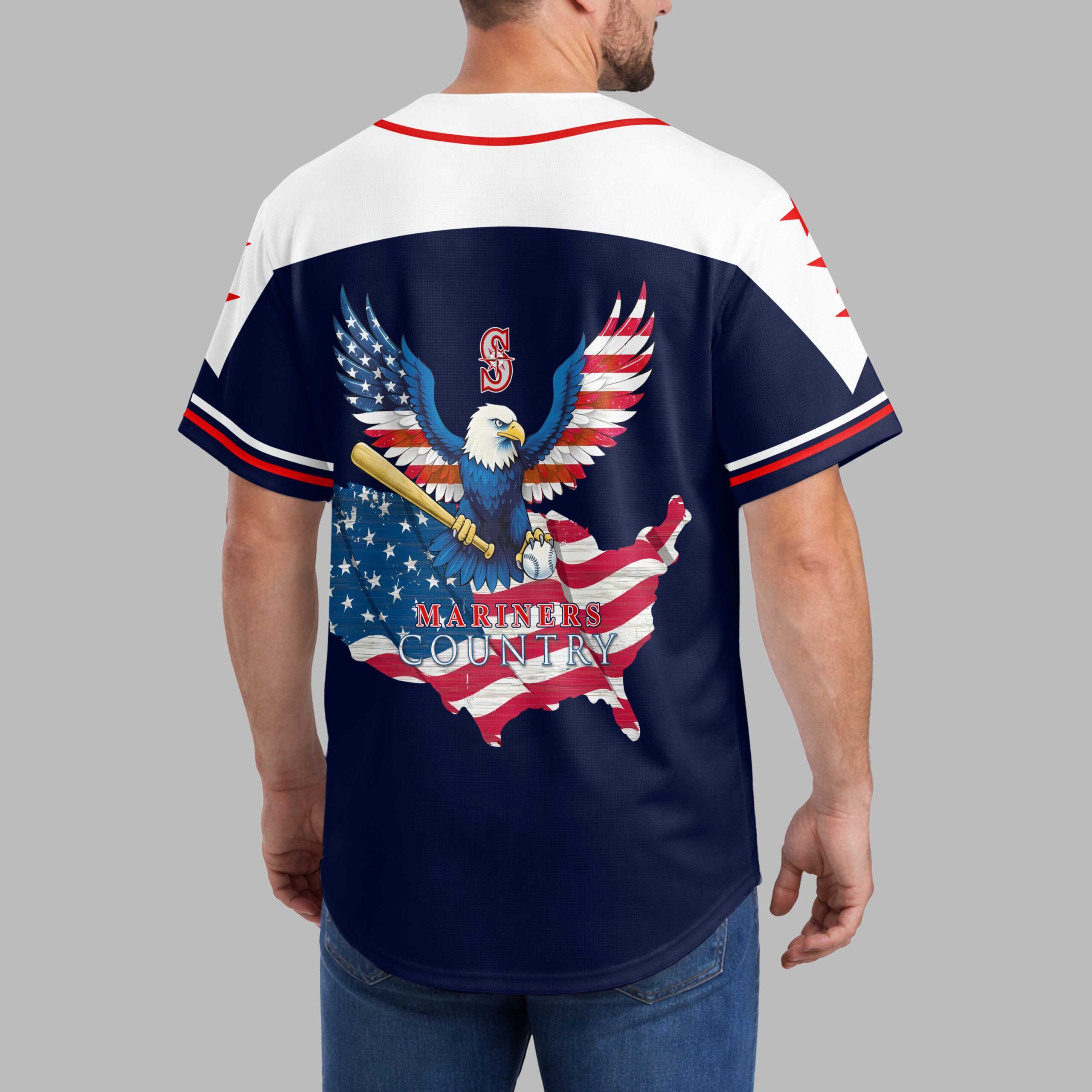 Show your unwavering loyalty to the Mariners and your American pride with this dynamic baseball jersey! It’s more than just game day apparel; it’s a bold statement of your love for both your team and your country, perfect for any devoted fan ready to cheer loud and proud. The front of this striking navy blue jersey proudly displays ‘MARINERS’ in vibrant red lettering across the chest, complemented by spirited red stars adorning the white shoulder panels. Turn heads with the impressive back design, featuring a majestic bald eagle with wings inspired by the American flag, clutching a baseball bat over a distressed USA map. Below this powerful emblem, the rallying cry ‘MARINERS COUNTRY’ makes a clear declaration of your allegiance. This spirited jersey is ideal for game days at the ballpark, Fourth of July celebrations, or any event where you want to showcase your Mariners spirit and patriotic heart. Wear it to watch parties, family BBQs, or simply as everyday wear to let everyone know where your loyalties lie.