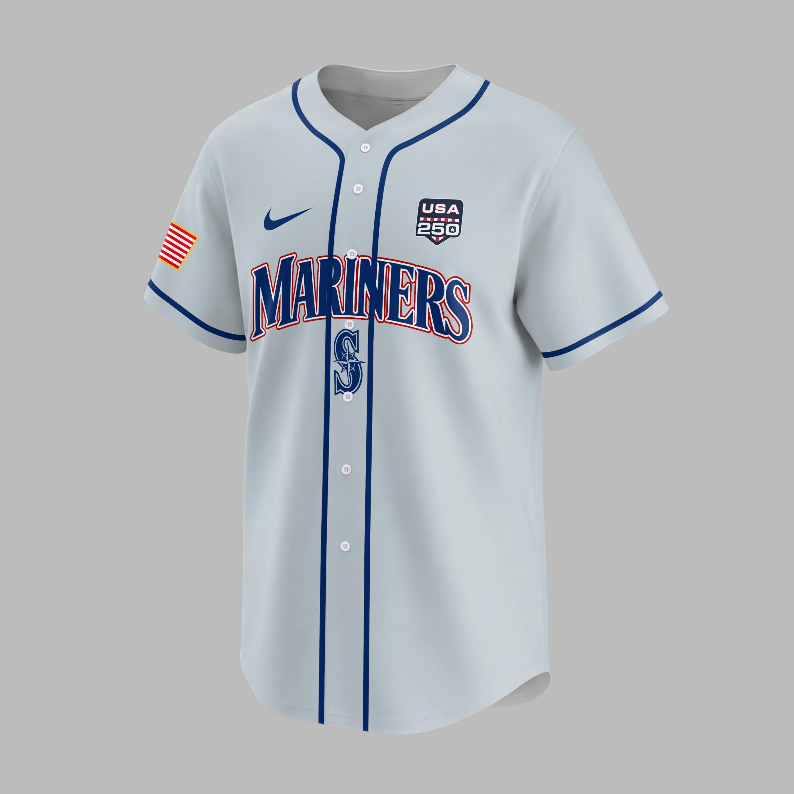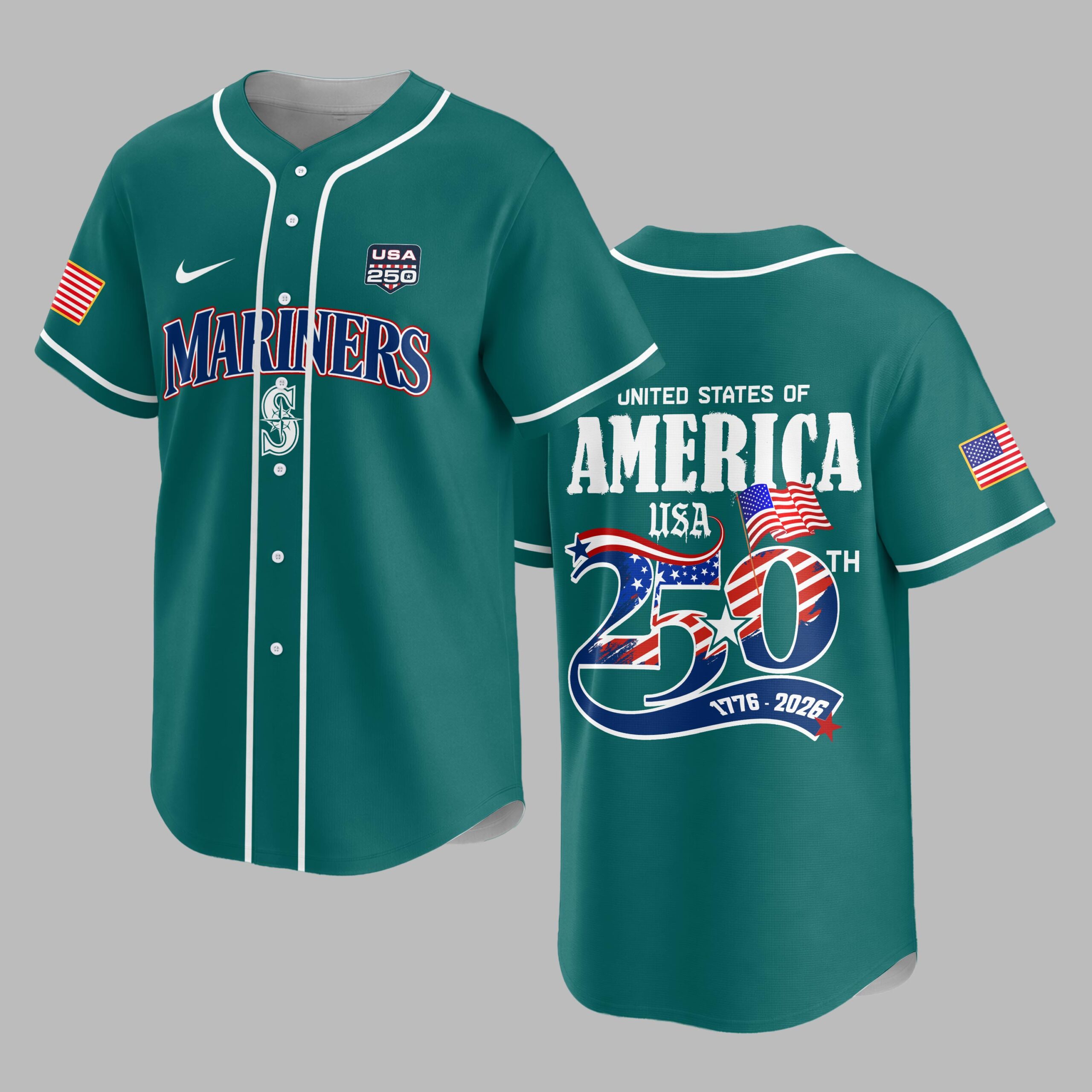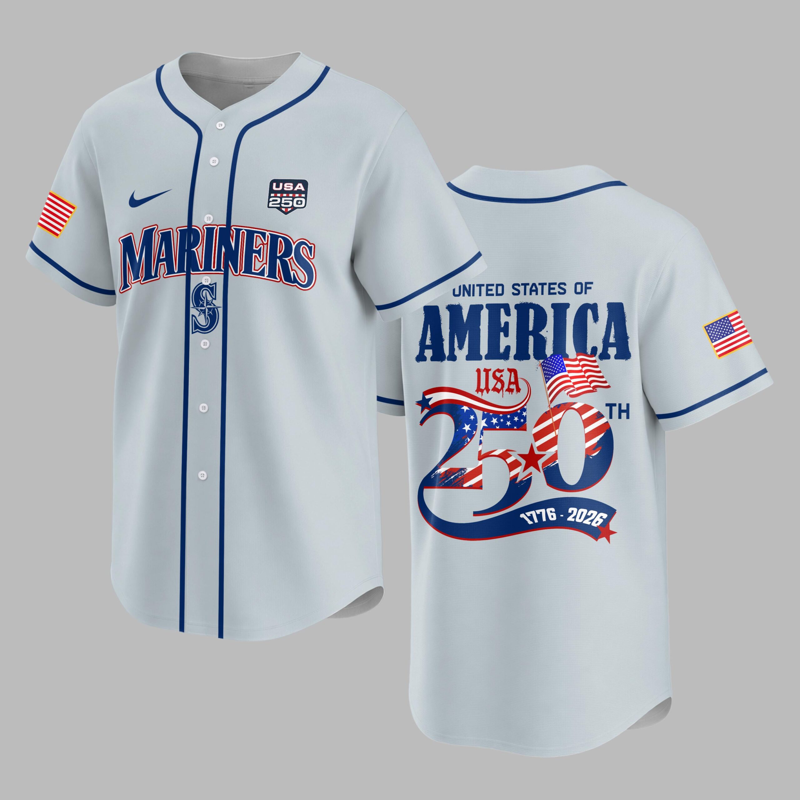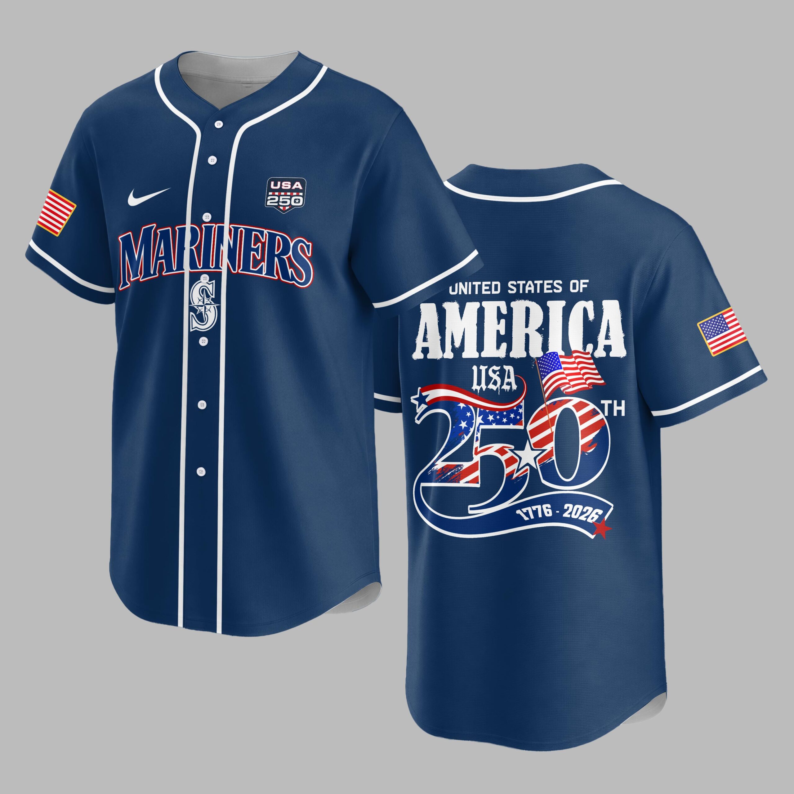 Celebrate both your love for the Seattle Mariners and American pride with this commemorative baseball jersey! This exclusive design perfectly blends the thrill of the game with a powerful tribute to the 250th anniversary of the United States, making it a must-have for any fan who values both country and team. The front proudly displays MARINERS in bold red and blue lettering, alongside the iconic compass rose logo and a special USA 250 patch. On the back, a striking UNITED STATES OF AMERICA declaration sits above a large 250TH graphic, vividly adorned with the American flag stars and stripes, signifying the historic 1776-2026 milestone. Each sleeve features a patriotic American flag patch, completing this spirited design. This jersey is ideal for cheering on the Mariners at the ballpark, celebrating national holidays like the 4th of July, or simply showcasing your patriotism and team loyalty in everyday wear. It’s the perfect choice for historical events, special anniversary celebrations, or any occasion where you want to wear your American pride on your sleeve – literally!