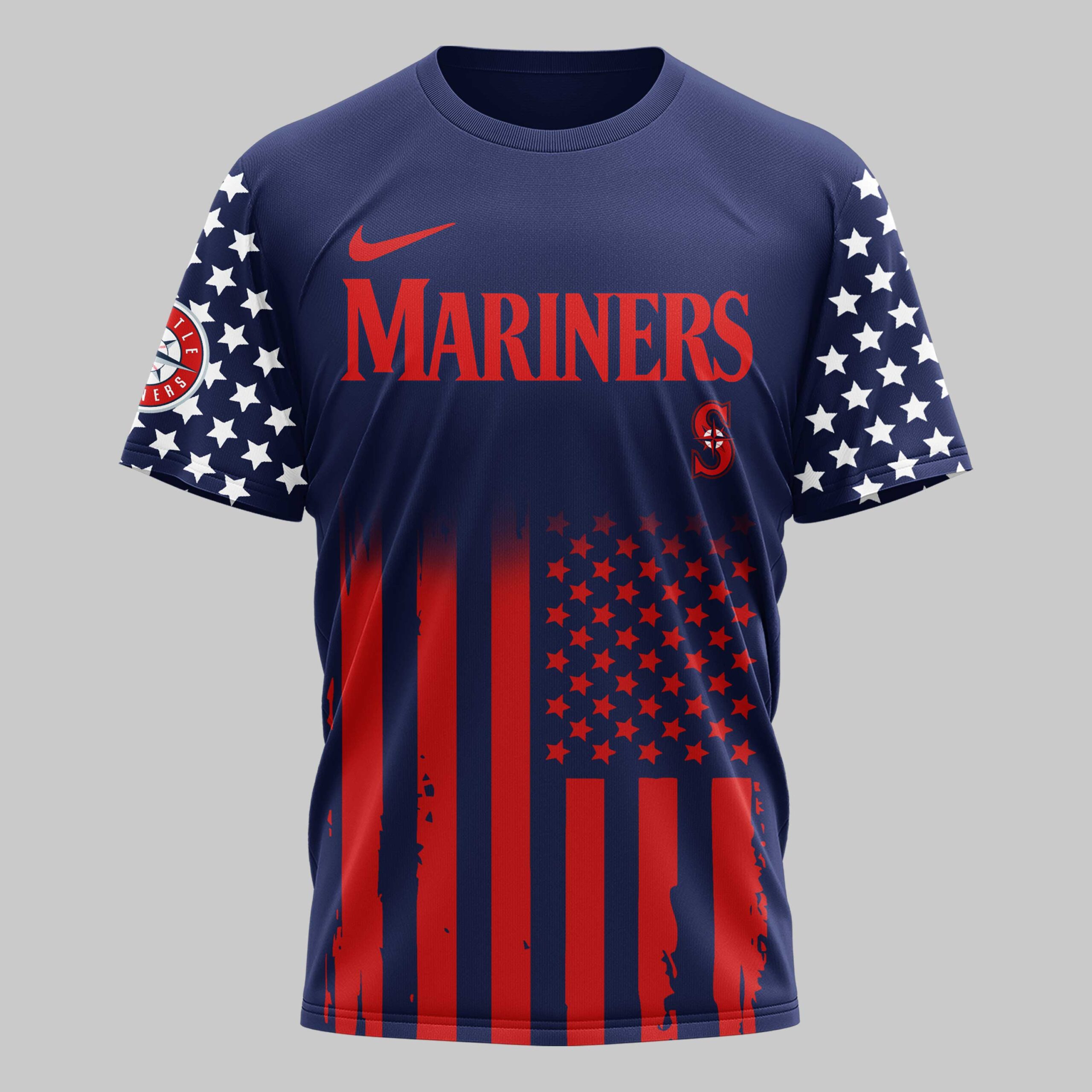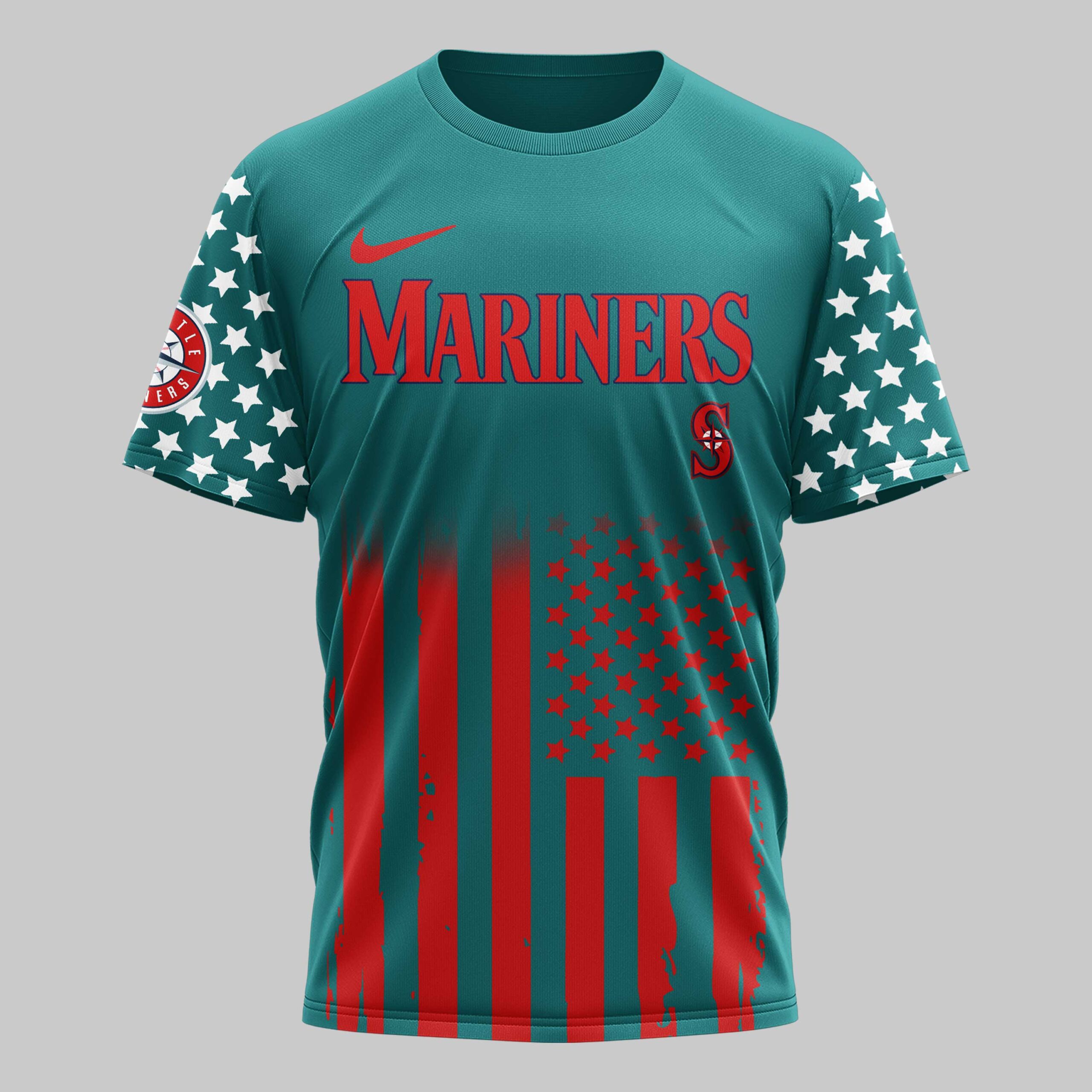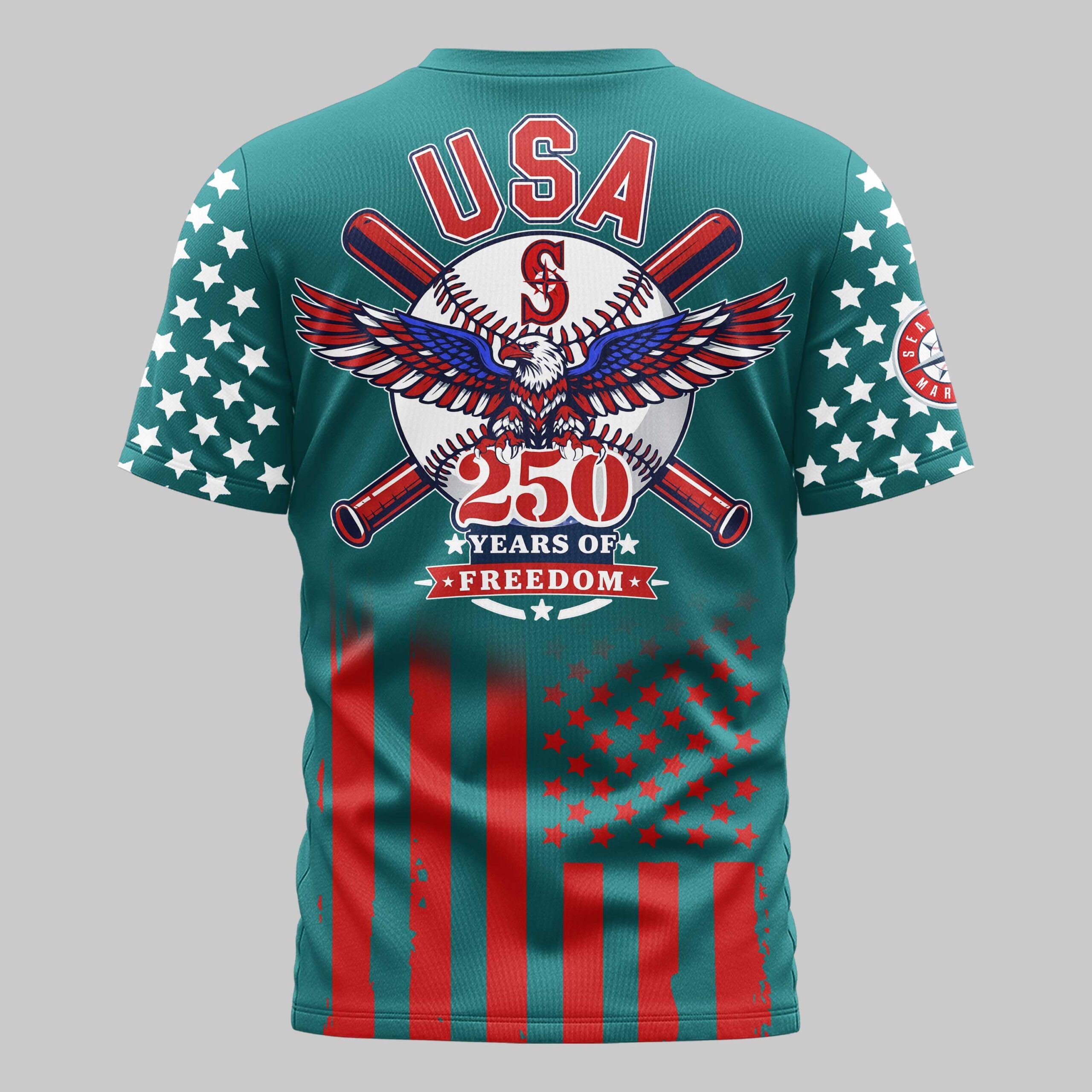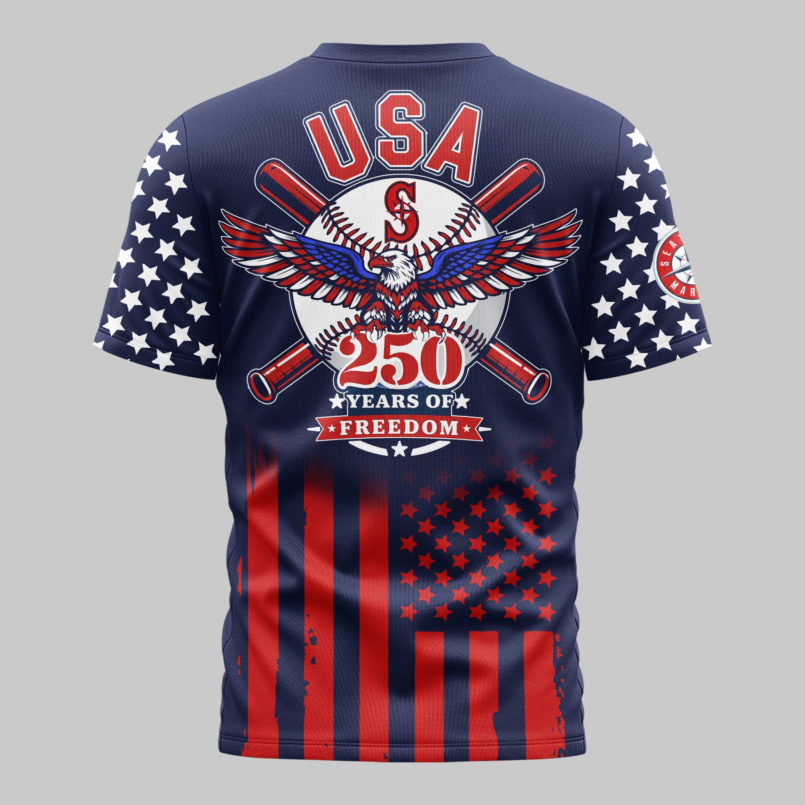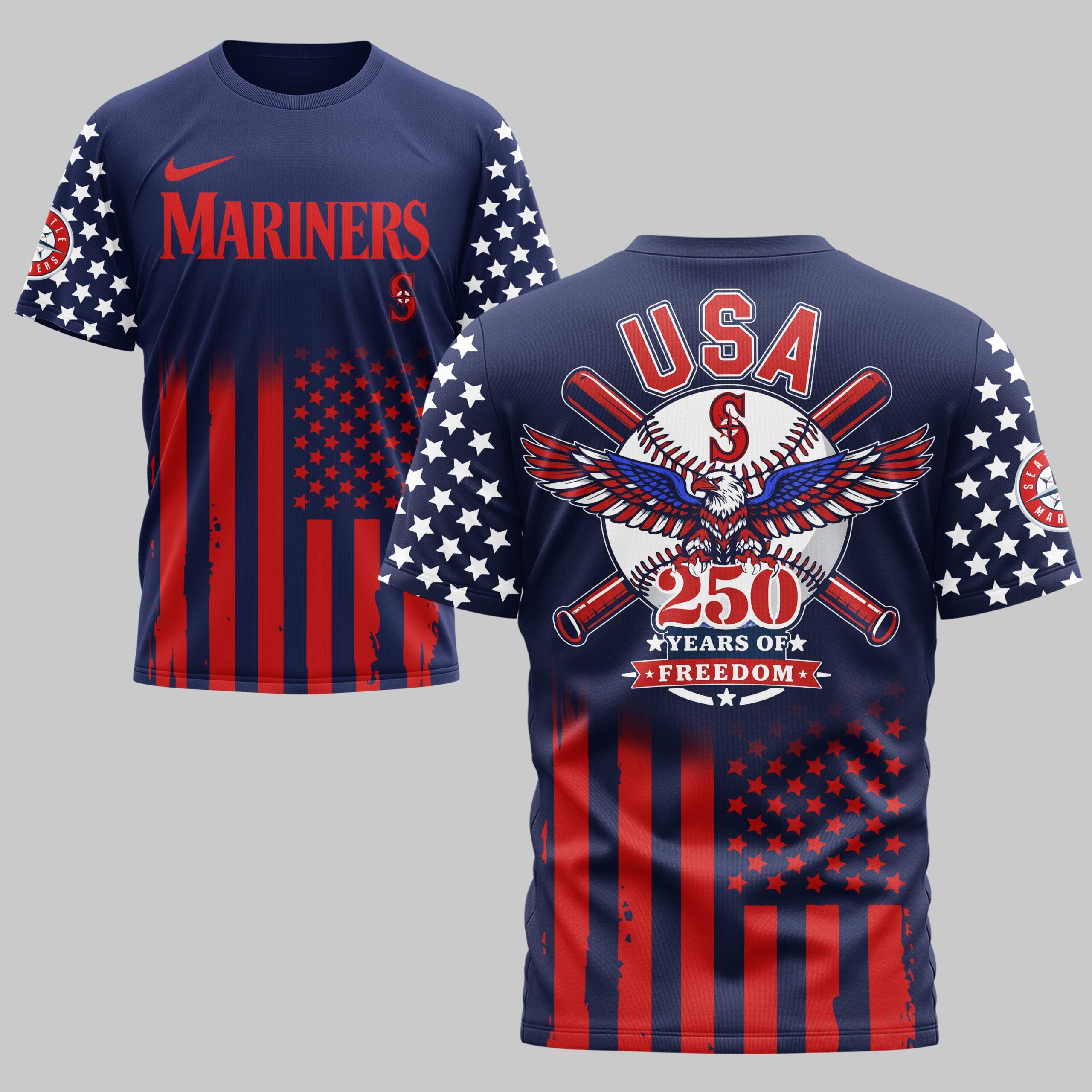 Seattle Mariners USA 250 Independence Baseball Fan T-Shirt Showcase your loyalty to the Seattle Mariners with a design that honors both the team and the nation. This vibrant shirt blends Pacific Northwest pride with a powerful patriotic theme, celebrating the milestone of 250 years of freedom. It’s a bold statement piece for fans who carry their team spirit and country’s heritage wherever they go. The front features MARINERS in bold red lettering with the classic compass logo. The sleeves are decked in white stars, while the hem displays a stylized flag pattern. The back is a showstopper, featuring a majestic bald eagle with wings outspread across a baseball and crossed bats, all set under a proud USA banner and 250 Years of Freedom graphics. Perfect for game day at the ballpark, Independence Day festivities, or everyday wear, this shirt is designed to stand out. It’s the ultimate way to support the Mariners while celebrating American liberty.