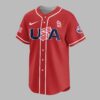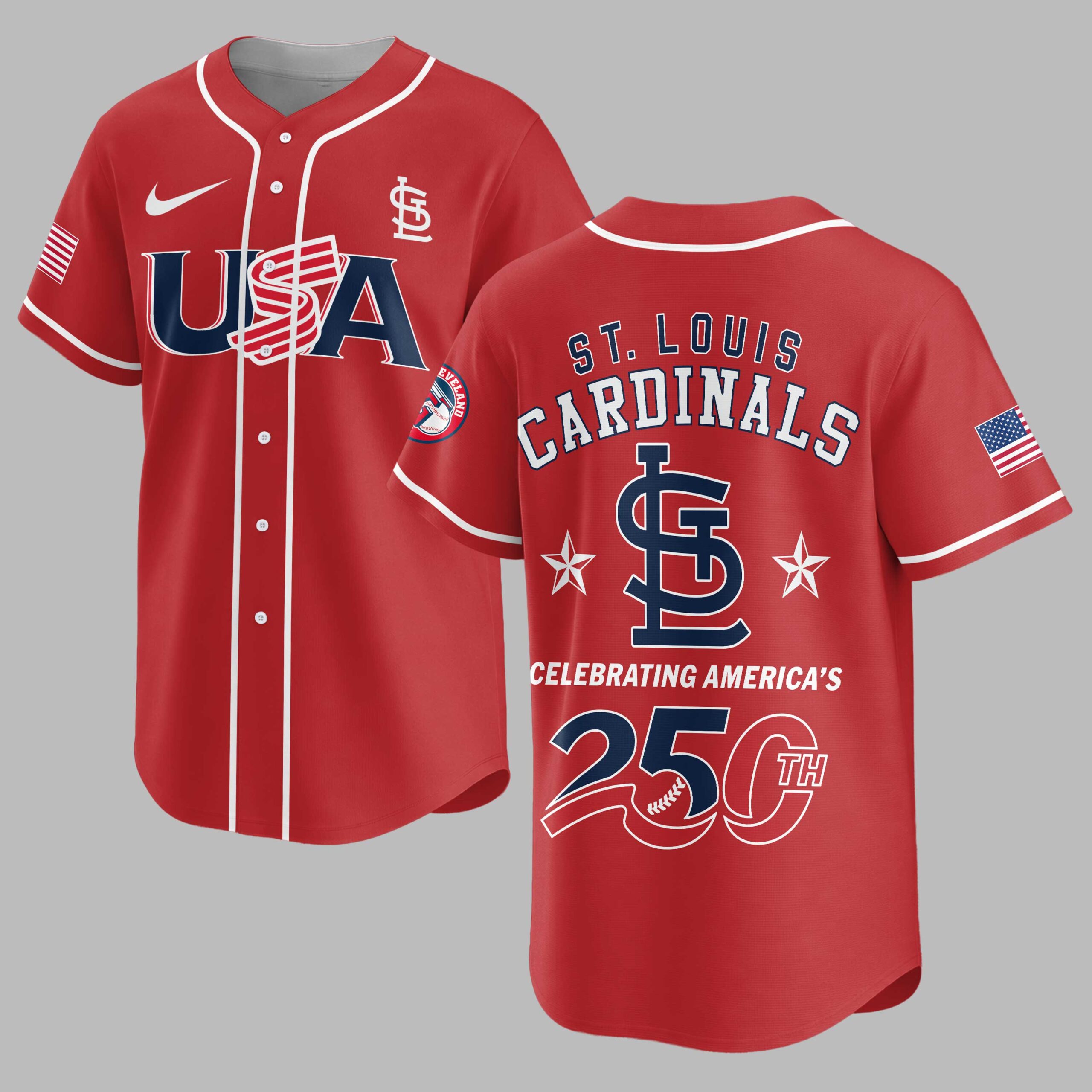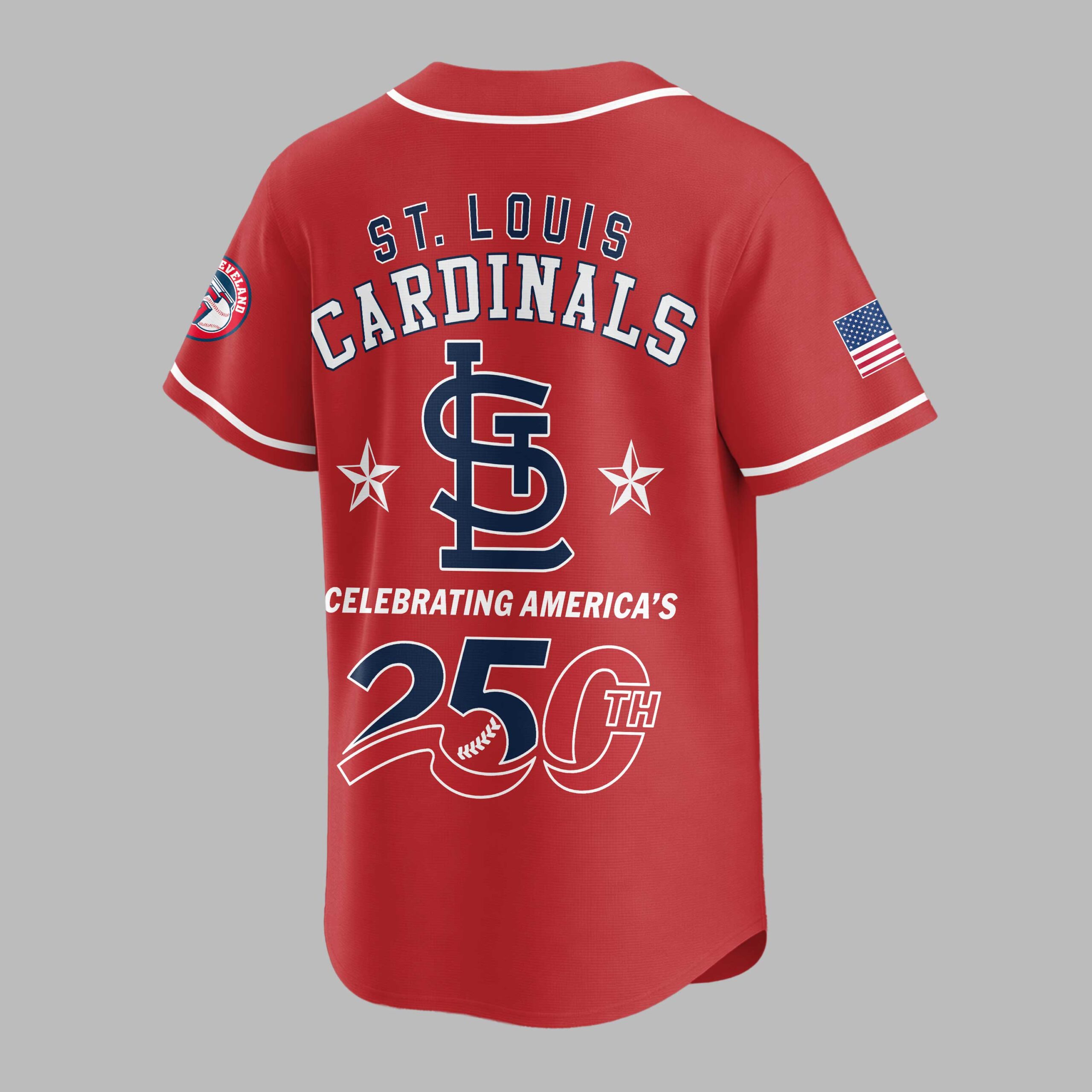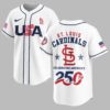 Show your unwavering support for the St. Louis Cardinals and celebrate a monumental moment in American history with this special edition patriotic baseball jersey. This vibrant red top is a powerful statement of both your team loyalty and national pride, honoring America’s enduring legacy while you cheer on the Redbirds. The front proudly displays ‘USA’ in bold, patriotic stripes, accented by the iconic St. Louis Cardinals ‘StL’ logo and an American flag on the sleeve. Turn around to reveal ‘ST. LOUIS CARDINALS’ in classic styling, framed by two stars and the striking ‘250TH’ graphic, commemorating America’s 250th anniversary with a subtle baseball stitch detail. Another American flag adorns the back sleeve, completing this vibrant design. Perfect for cheering on the Cardinals at the ballpark, celebrating national holidays like the Fourth of July or Memorial Day, or simply showcasing your American and team spirit wherever you go. This jersey is ideal for any fan ready to honor both their favorite team and their country with pride.