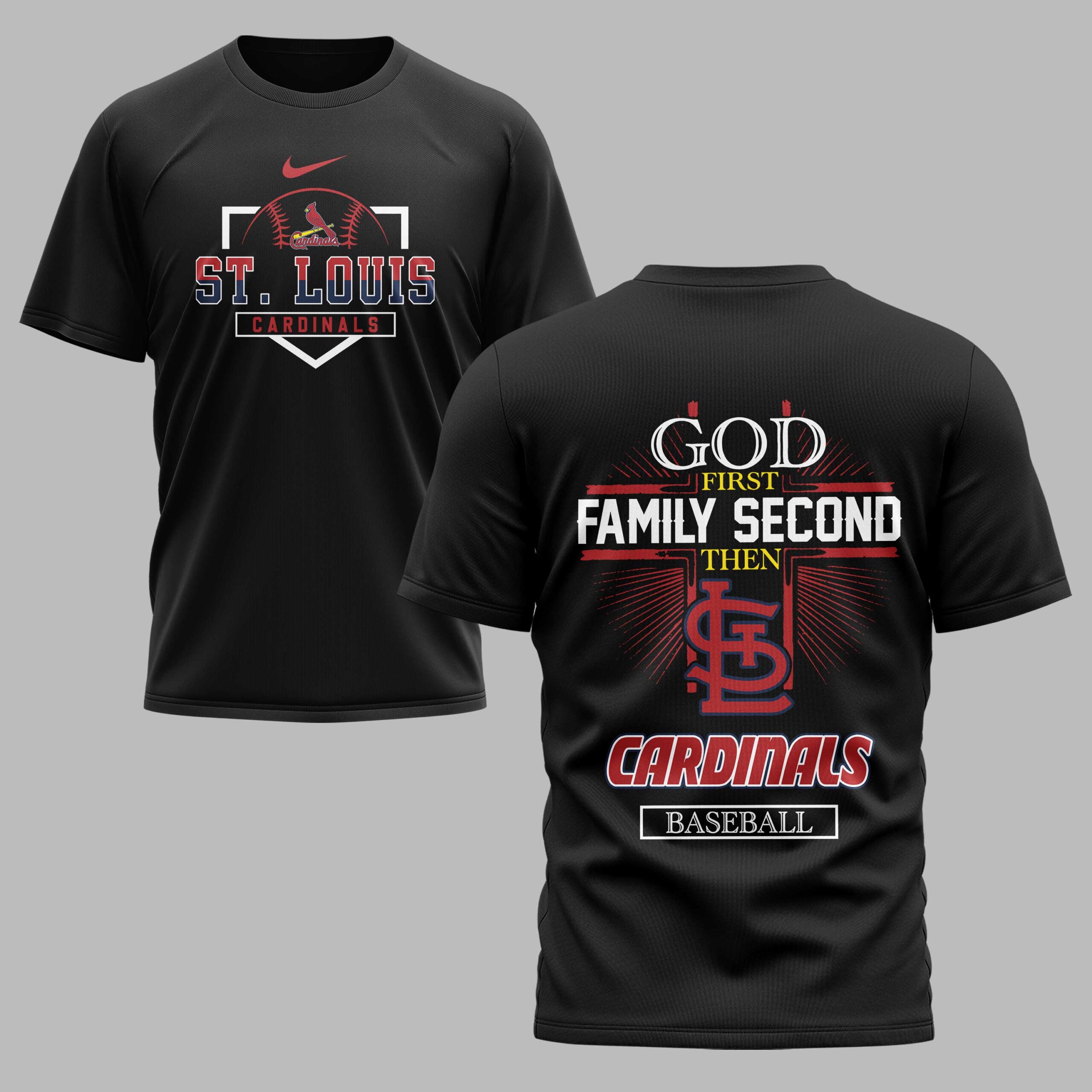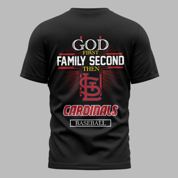 Showcase your unwavering loyalty to the Gateway to the West with this St. Louis Cardinals fan tee. Designed for those who value faith, family, and home-run heroics, this shirt blends deep team pride with a bold patriotic spirit. It’s the ultimate gear for any member of the Cardinals faithful looking to celebrate their heritage and their favorite team simultaneously. The front features a striking St. Louis Cardinals graphic framed by a classic baseball diamond, complete with the iconic cardinal-on-the-bat logo. The back makes a powerful statement about your priorities: God First, Family Second, Then Cardinals Baseball. This detailed design is anchored by the famous interlocking SL logo and dynamic red, white, and blue accents that honor the American spirit. Wear it to Busch Stadium, a Fourth of July cookout, or just around town. It’s perfect for game days and everyday wear, making it clear where your heart lies.