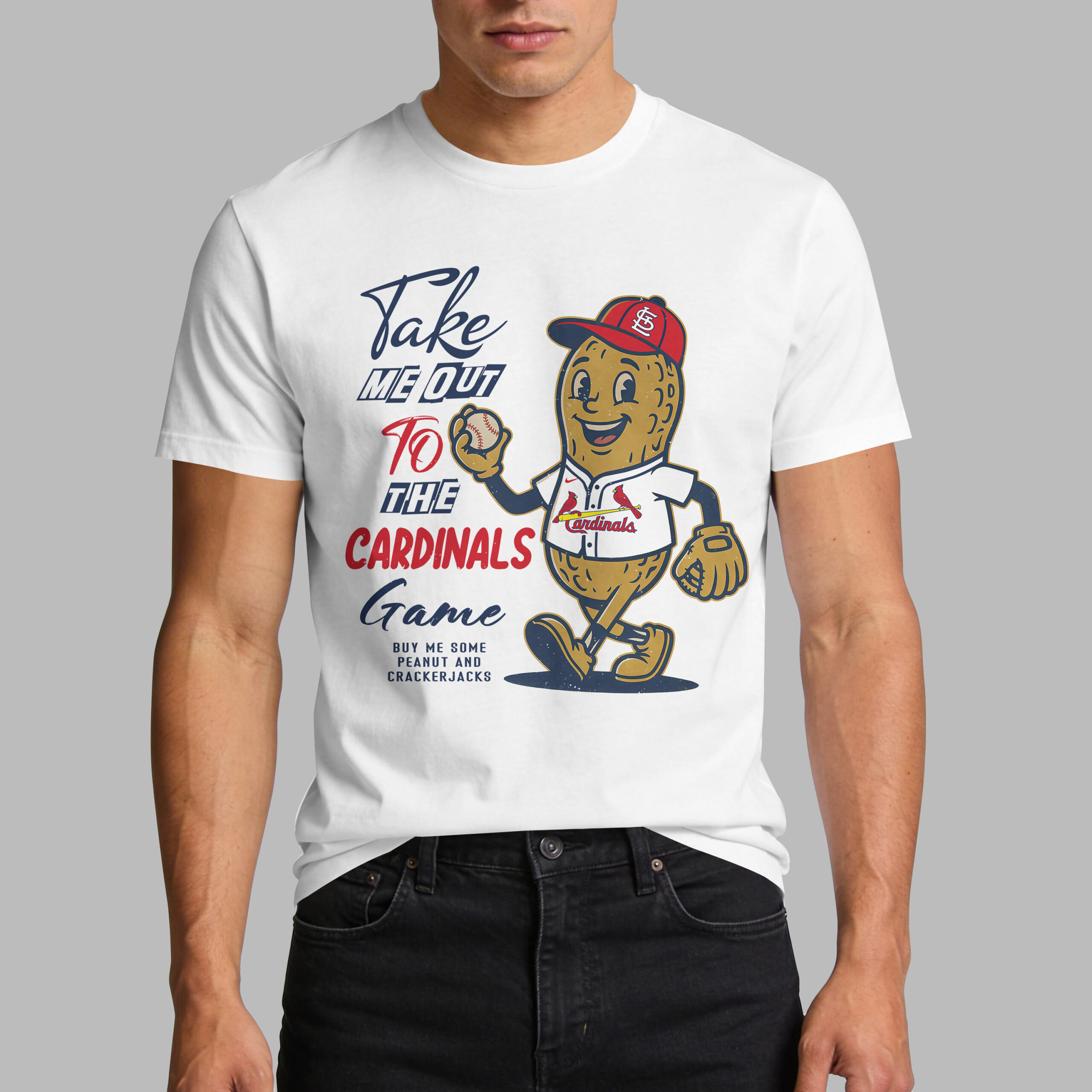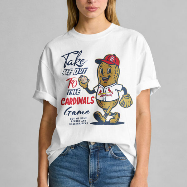 Root for the St. Louis Cardinals with this spirited baseball tee! Perfect for devoted fans, it captures the joyful nostalgia of game day and America’s favorite pastime. Show your team loyalty and get in the game spirit. The design features an adorable cartoon peanut character, uniformed in a Cardinals cap and jersey, holding a baseball. Bold text proclaims, Take ME OUT TO THE CARDINALS Game, humorously followed by, BUY ME SOME PEANUT AND CRACKERJACKS. It’s a delightful nod to ballpark treats. Ideal for the stadium, a watch party, or casual outings, this tee expresses Cardinals devotion with humor. It’s a fantastic way to celebrate your team and share your love for baseball.