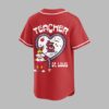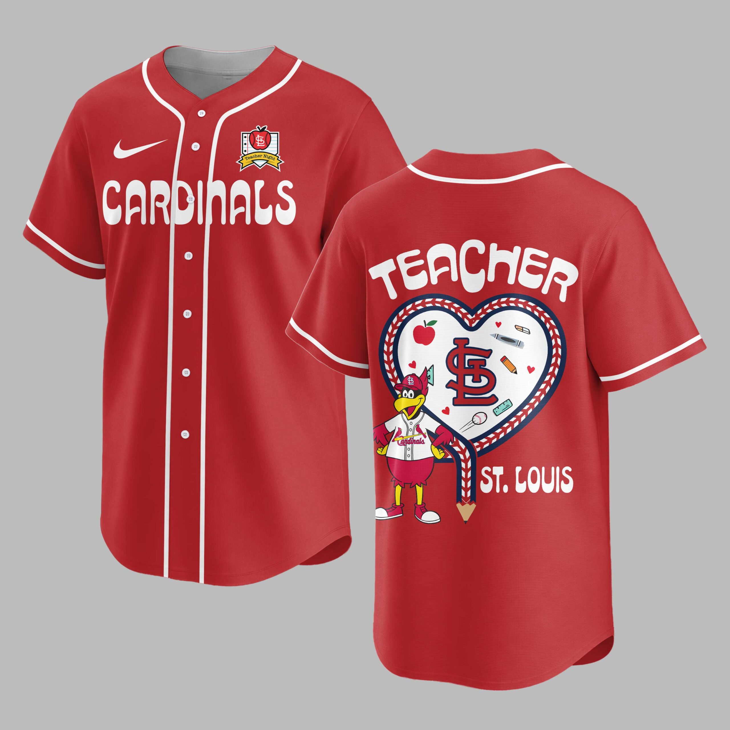 Celebrate your passion for both America’s favorite pastime and the incredible impact of educators with this unique St. Louis Cardinals Teacher Night jersey! This spirited shirt is the perfect way for dedicated teachers and baseball fans to show their appreciation for the game and their profession, all while cheering on the Cardinals. The front of this crisp white jersey proudly displays Cardinals in classic red script, accented by a special Teacher Night emblem featuring the iconic St. Louis bird logo nestled within an apple on a notebook paper design. The back is a vibrant tribute, featuring TEACHER boldly above a heart-shaped design outlined with baseball stitching. Inside the heart, an array of charming school supplies, the beloved Cardinals mascot, and the St. Louis team logo come together, finished with ST. LOUIS in red lettering. Perfect for attending a special Teacher Night at Busch Stadium, cheering from home, or simply showing your team pride and professional dedication around town. This jersey is an excellent gift for any St. Louis Cardinals-loving teacher, making every day feel like a home run for education and baseball.