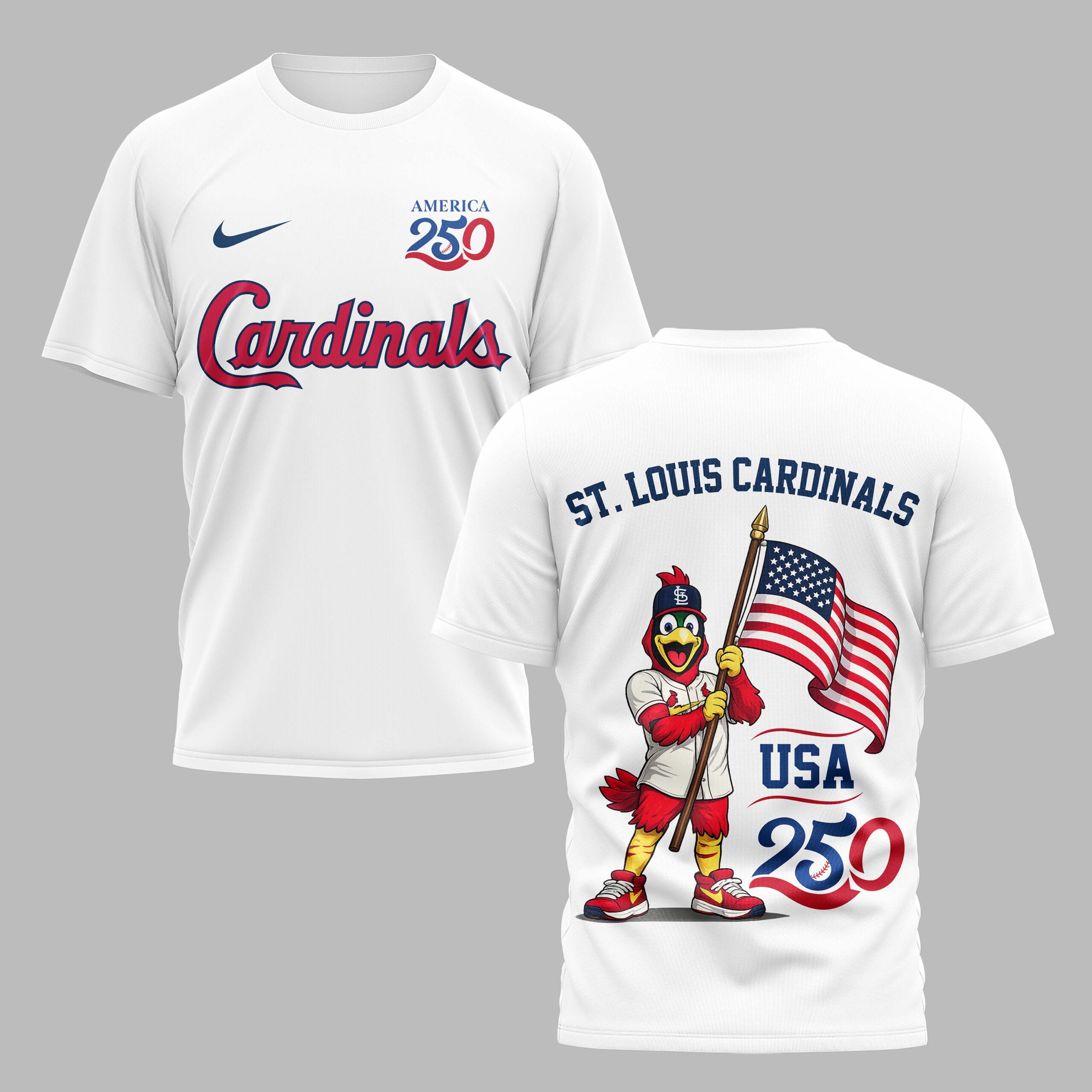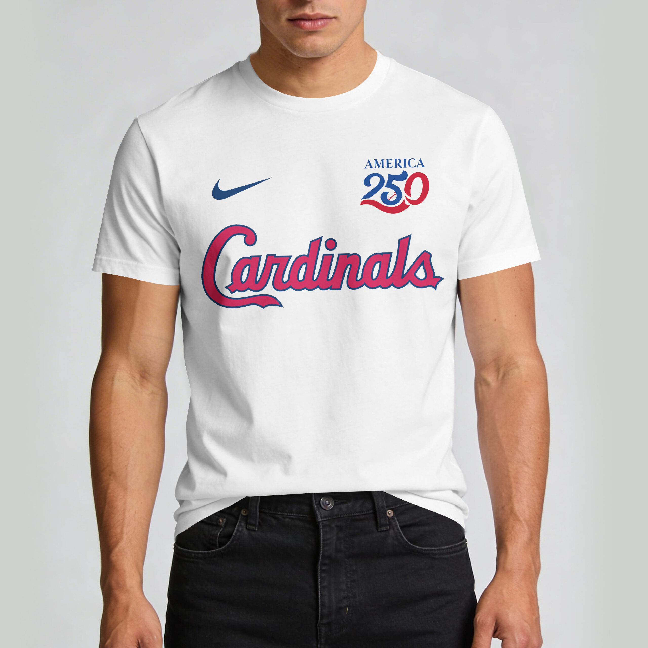 Step up to the plate and celebrate your Cardinals pride with this special edition tee. Designed to honor America’s 250th anniversary, this shirt perfectly blends your passion for the game with a bold patriotic spirit. It’s a must-have for any dedicated fan looking to showcase their loyalty to both the team and the nation during this historic milestone. The front features the iconic Cardinals script, rendered in striking red with a clean navy outline for a classic look. To commemorate the celebration, the America 250 logo sits prominently on the chest, incorporating a baseball motif and the timeless red, white, and blue color scheme. A stylish athletic swoosh adds a professional finishing touch to the vibrant design seen in the image. This tee is perfect for game days at the stadium, Independence Day celebrations, or casual outings around town. Whether you’re cheering from the stands or enjoying a summer cookout, represent your favorite team with pride all season long.