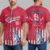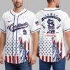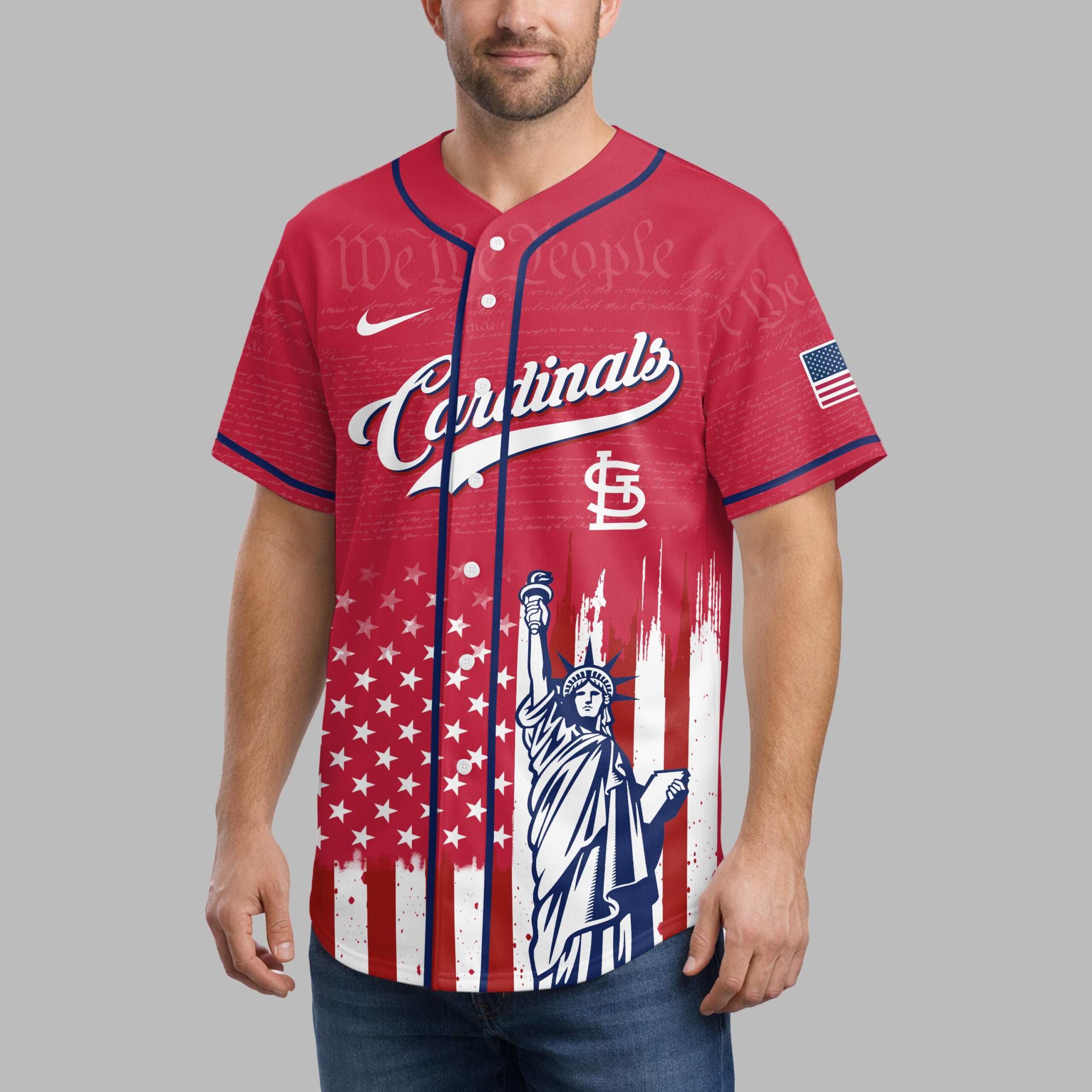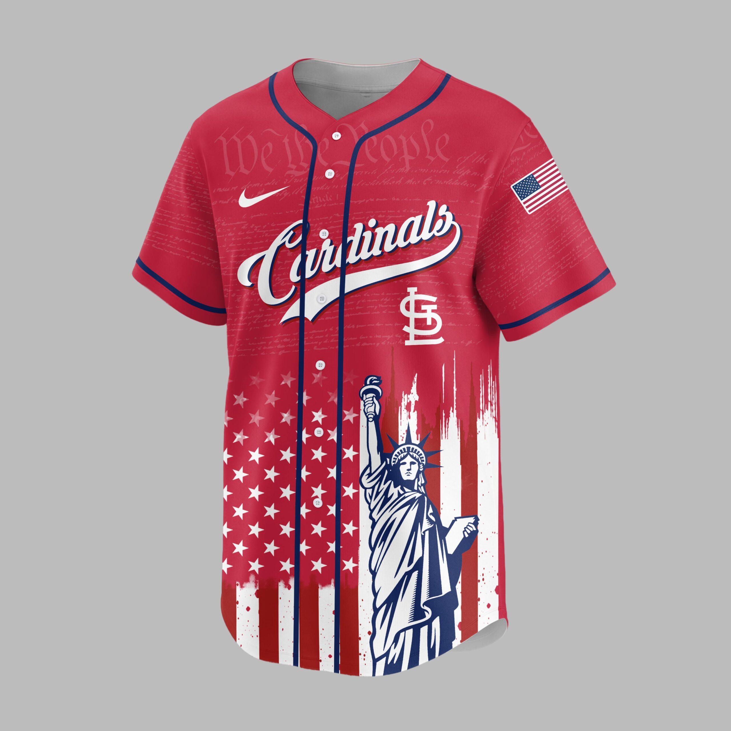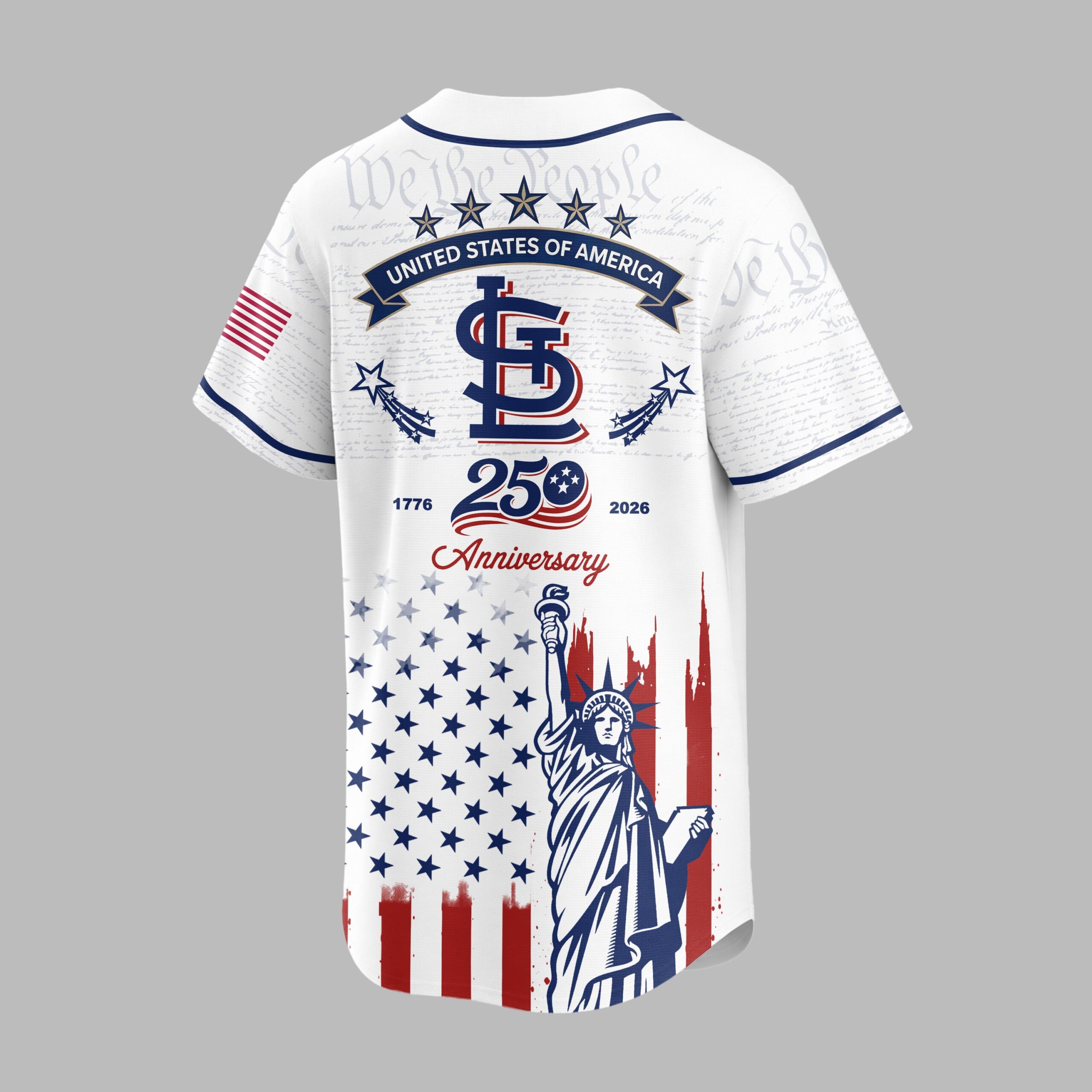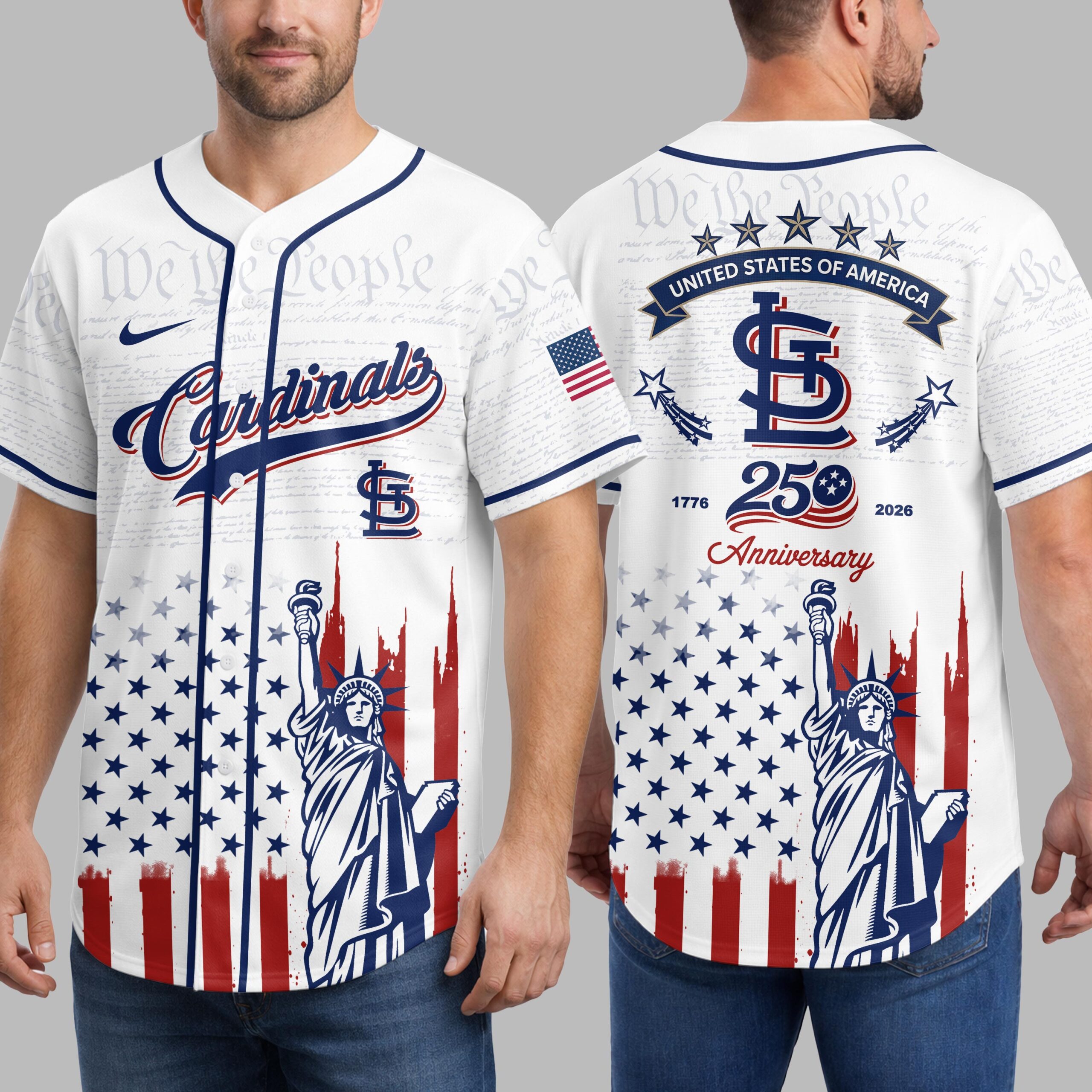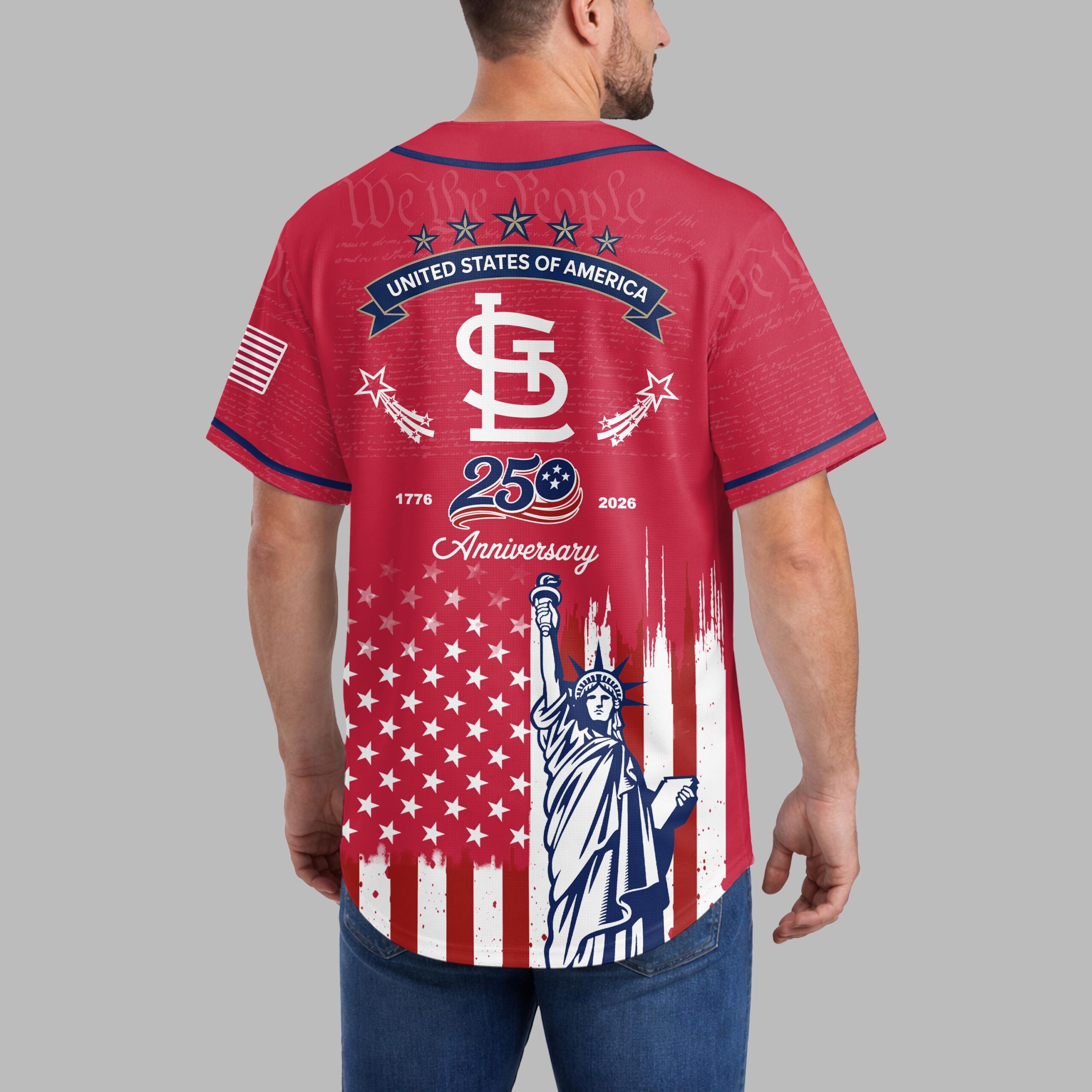 Celebrate your unwavering St. Louis Cardinals pride and American heritage with this striking patriotic baseball jersey! This unique design blends the thrill of the game with a powerful tribute to the nation, perfect for fans who stand tall for both their team and their country. Get ready to show off your spirit in a truly unforgettable way. The front proudly displays the iconic Cardinals script and STL logo, set against a subtle background of historical constitutional text. Below, a distressed American flag design featuring bold blue stars and vibrant red stripes, alongside the majestic Statue of Liberty, creates a powerful visual statement. The back continues this impactful theme with a STATES OF AMERICA banner, the large STL logo, and a special 1776 250 2026 Anniversary commemoration, all against the same patriotic flag and Statue of Liberty backdrop. This jersey is an absolute must-have for game days, especially during patriotic holidays like the Fourth of July, or any event where you want to proudly display your dual loyalty. Wear it to the ballpark, family BBQs, or historical celebrations to honor the enduring spirit of America and cheer on your beloved Cardinals.