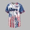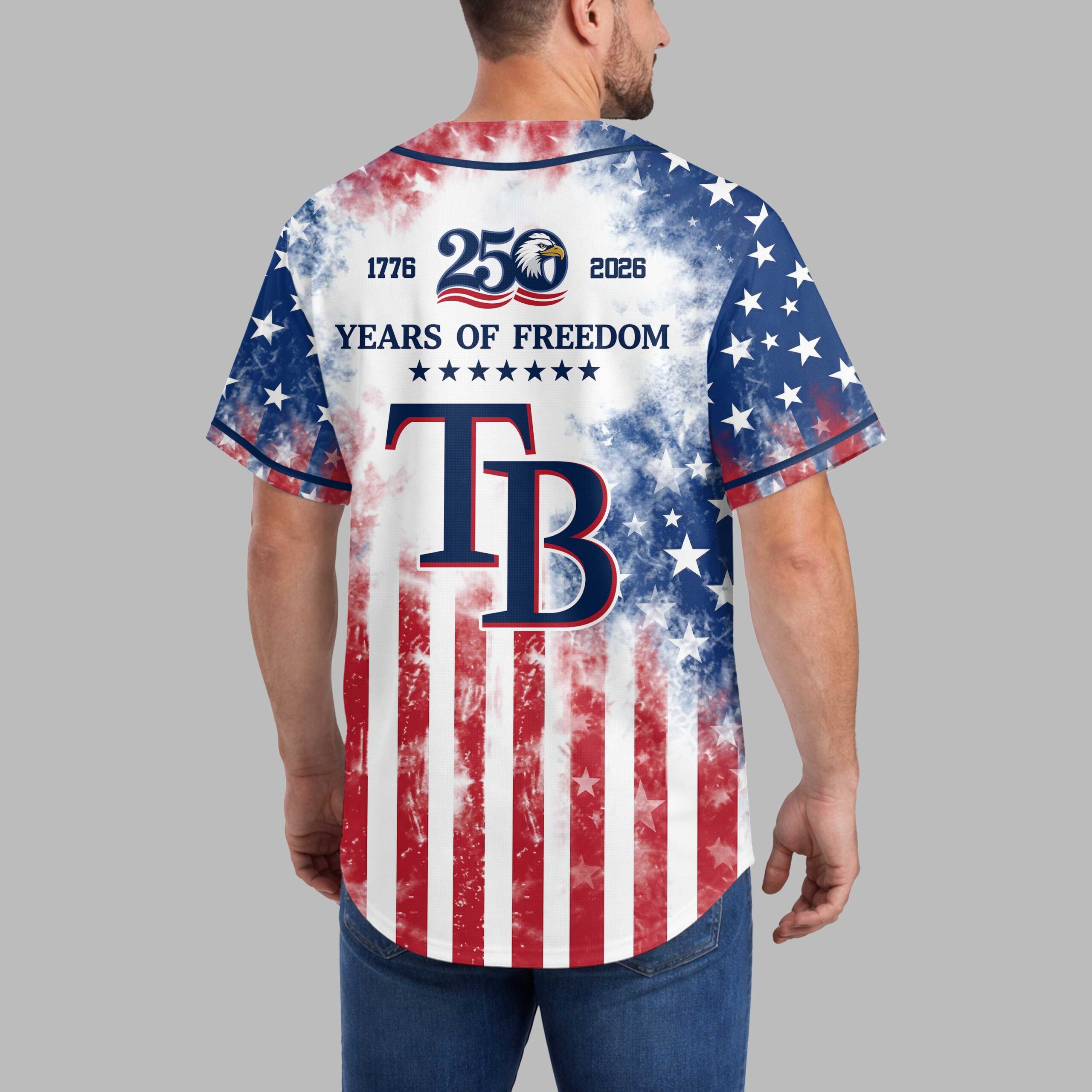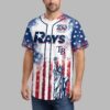 Show your unwavering pride for the Tampa Bay Rays and your country with this electrifying baseball jersey! This shirt is a powerful tribute to both your favorite team and 250 years of American freedom, perfect for fans who celebrate history and sport with equal passion. Embrace the spirit of independence and national pride every time you wear it. The front of this striking jersey features the iconic RAYS and TB logos, boldly set against a dynamic, distressed American flag backdrop of red and white stripes merging into a field of stars. A majestic Statue of Liberty stands tall, alongside a special 250 Years of Freedom emblem with an eagle, commemorating the 1776-2026 milestone. The back echoes this powerful message, showcasing TB with the 1776 250 2026 YEARS OF FREEDOM design, all on the same patriotic watercolor flag design. Perfect for game days at Tropicana Field, Fourth of July celebrations, Memorial Day barbecues, or any patriotic event where you want to stand out. This jersey is ideal for showing off your Rays fandom and American spirit, making it a powerful statement piece for every proud fan.