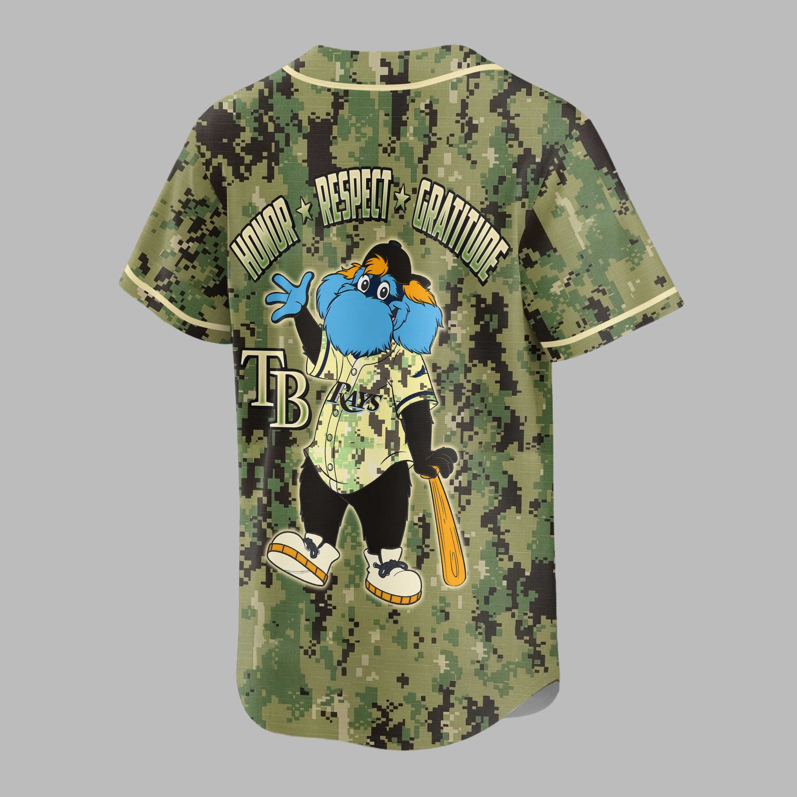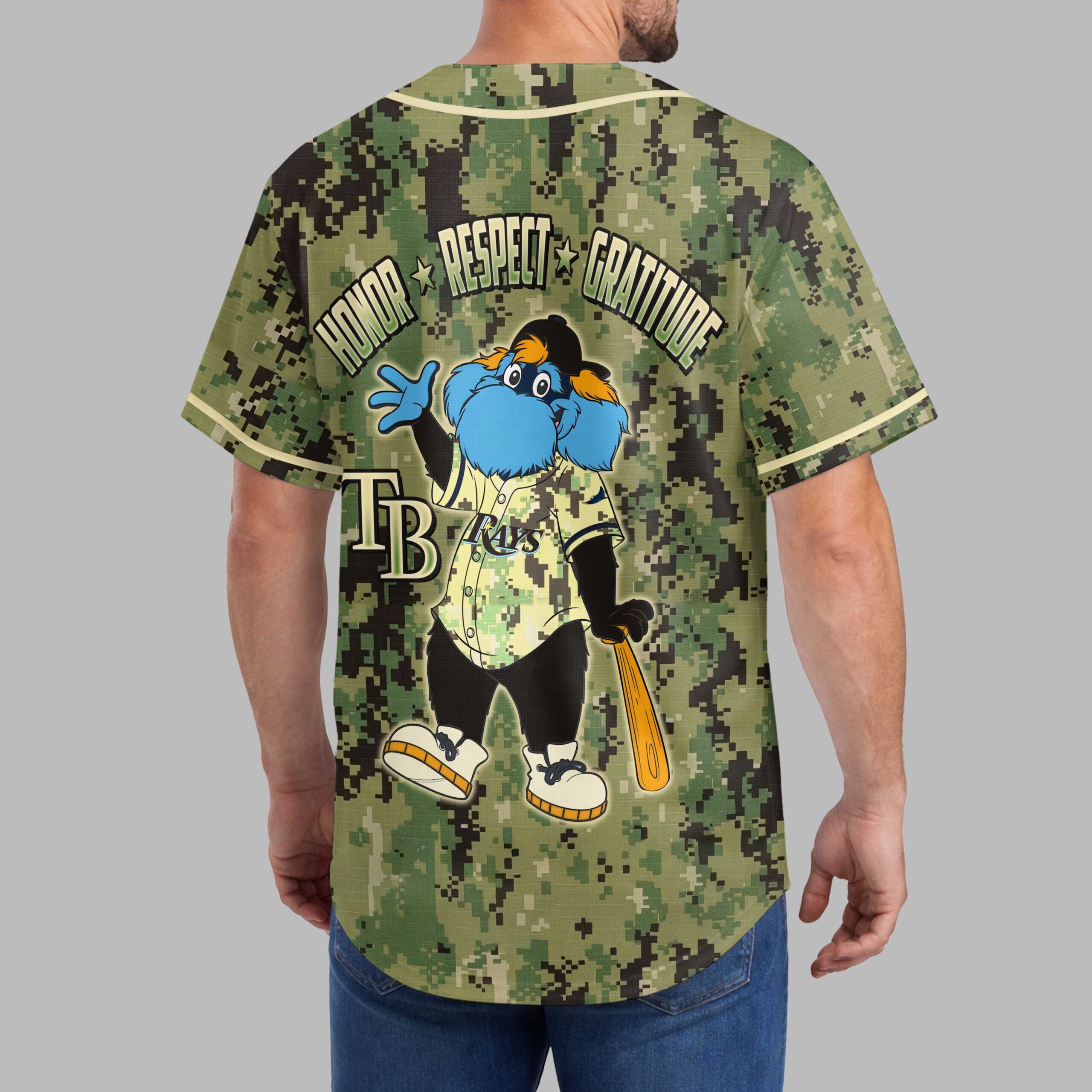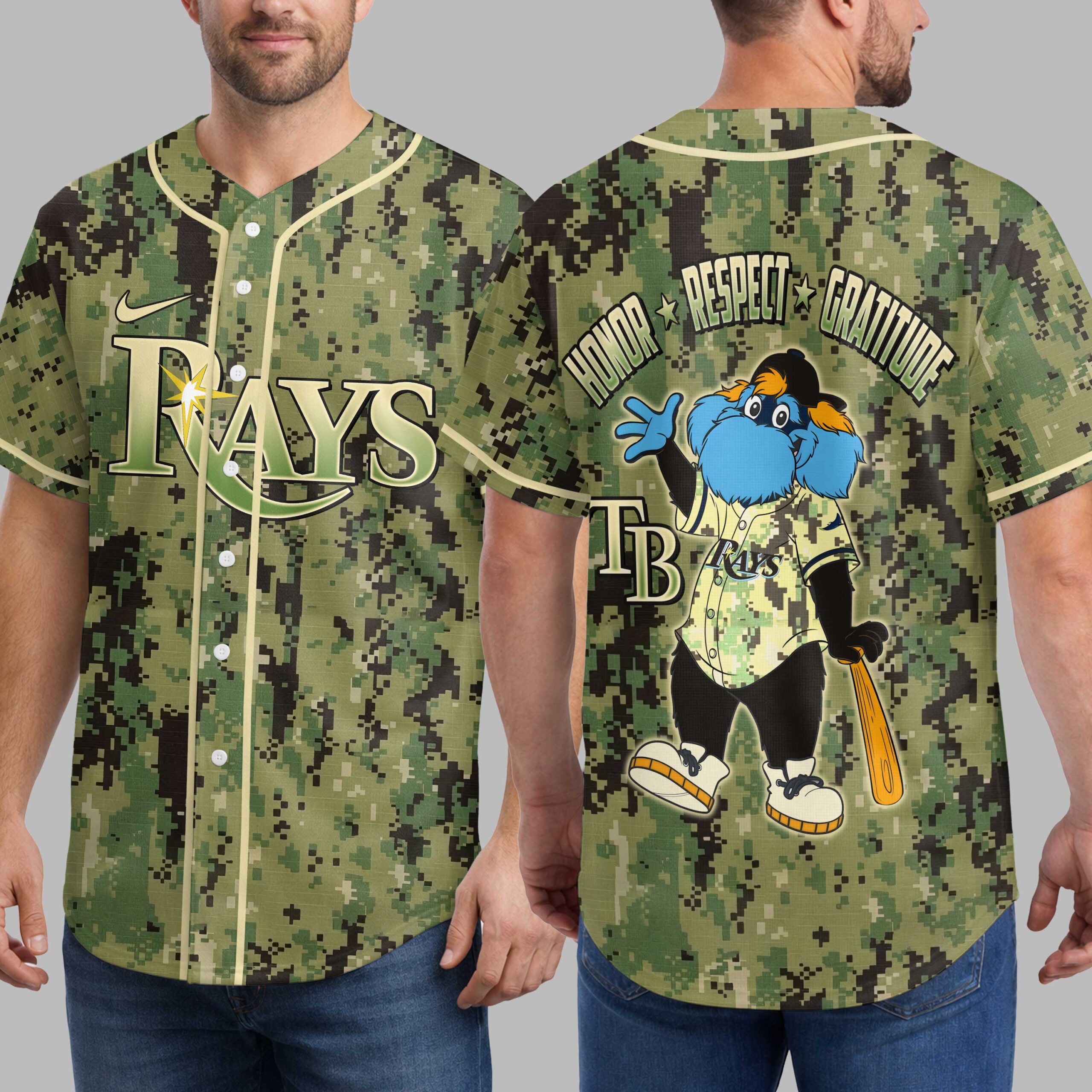 Show your unwavering support for the Tampa Bay Rays with this unique baseball jersey, blending team pride with a powerful message of appreciation. Perfect for fans who want to honor our service members while cheering on their favorite team, this shirt embodies both loyalty and gratitude. The front features the iconic RAYS logo in a vibrant green with a shining starburst, all set against a striking digital camouflage pattern. The back showcases a bold, blue mascot character sporting a baseball cap and camo jersey, holding a bat. Above, the words HONOR RESPECT GRATITUDE are prominently displayed, making a clear statement of respect. Whether you’re at Tropicana Field, a casual gathering, or simply out and about, this jersey is ideal for game days, patriotic holidays, or any occasion where you want to combine your love for baseball with a heartfelt tribute. It’s a true standout piece for dedicated Rays fans.