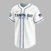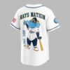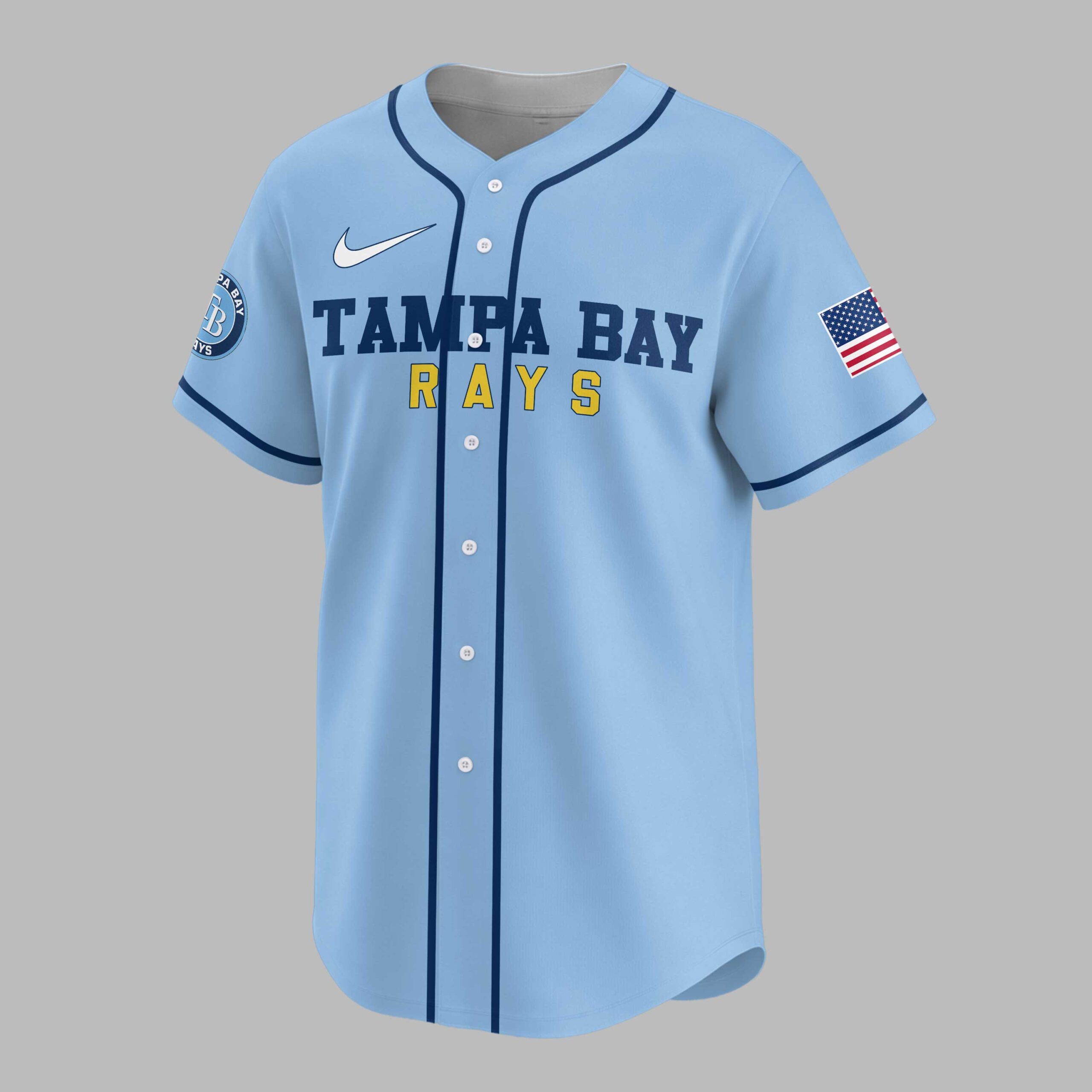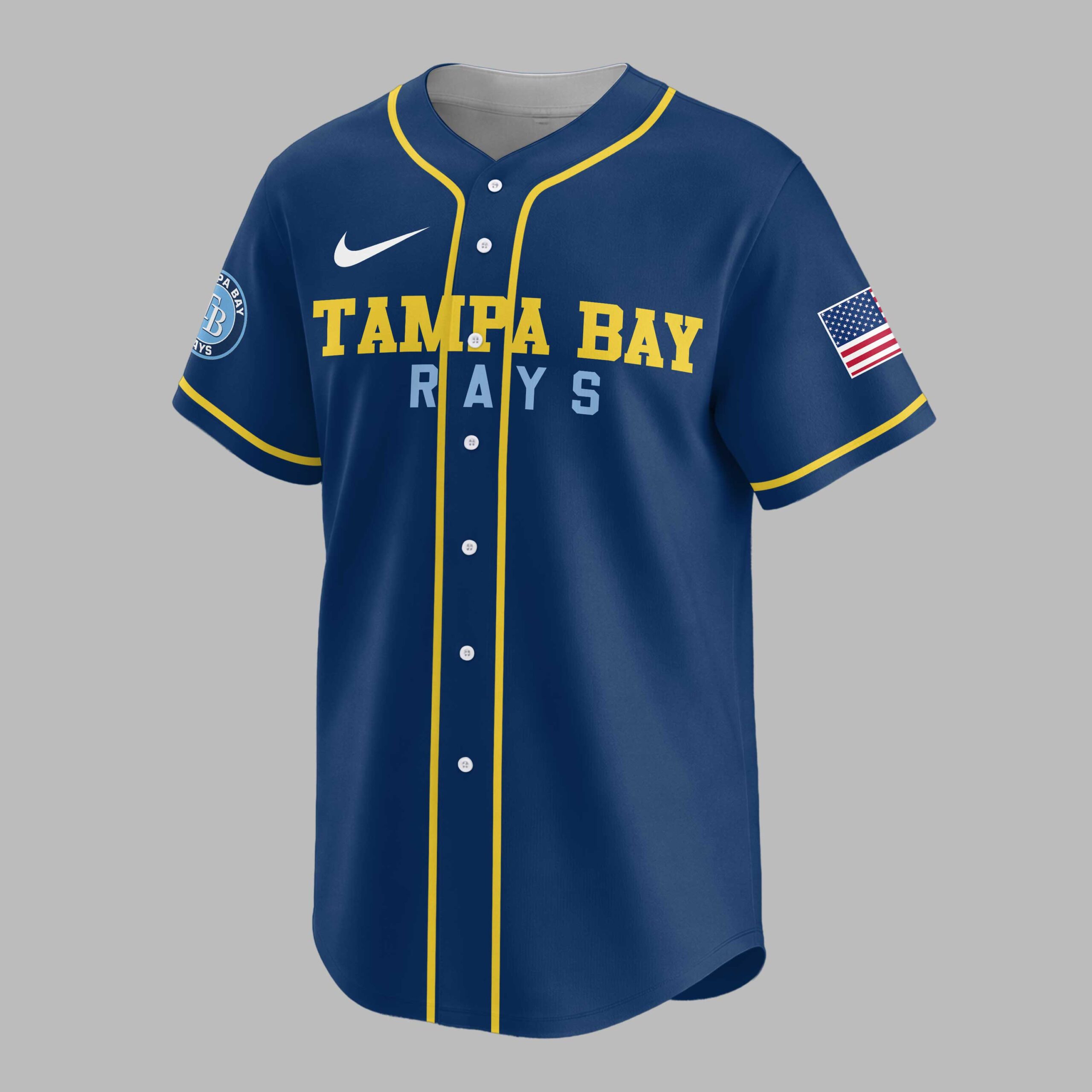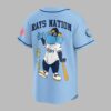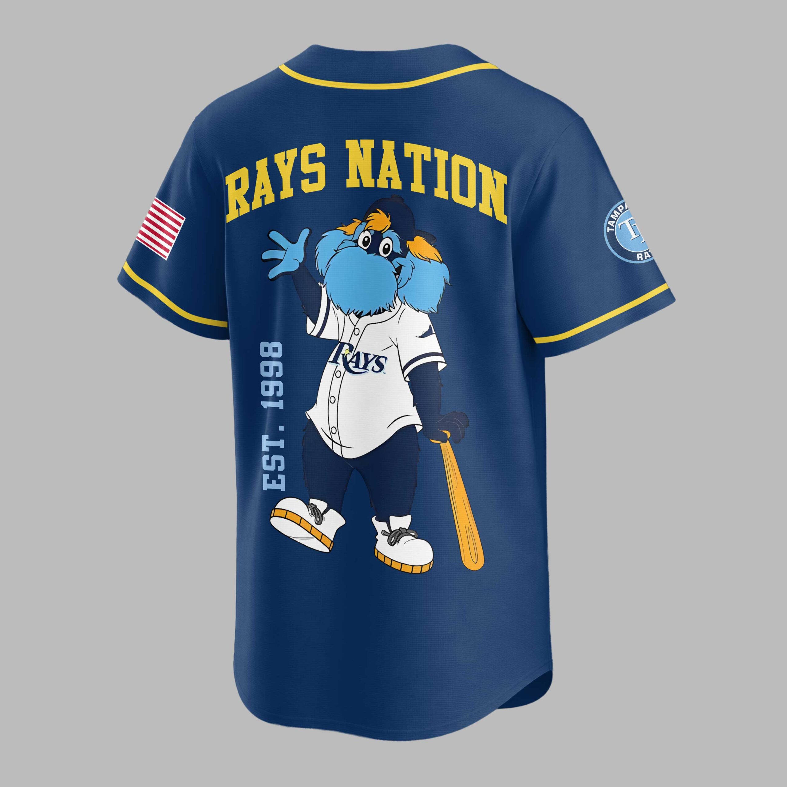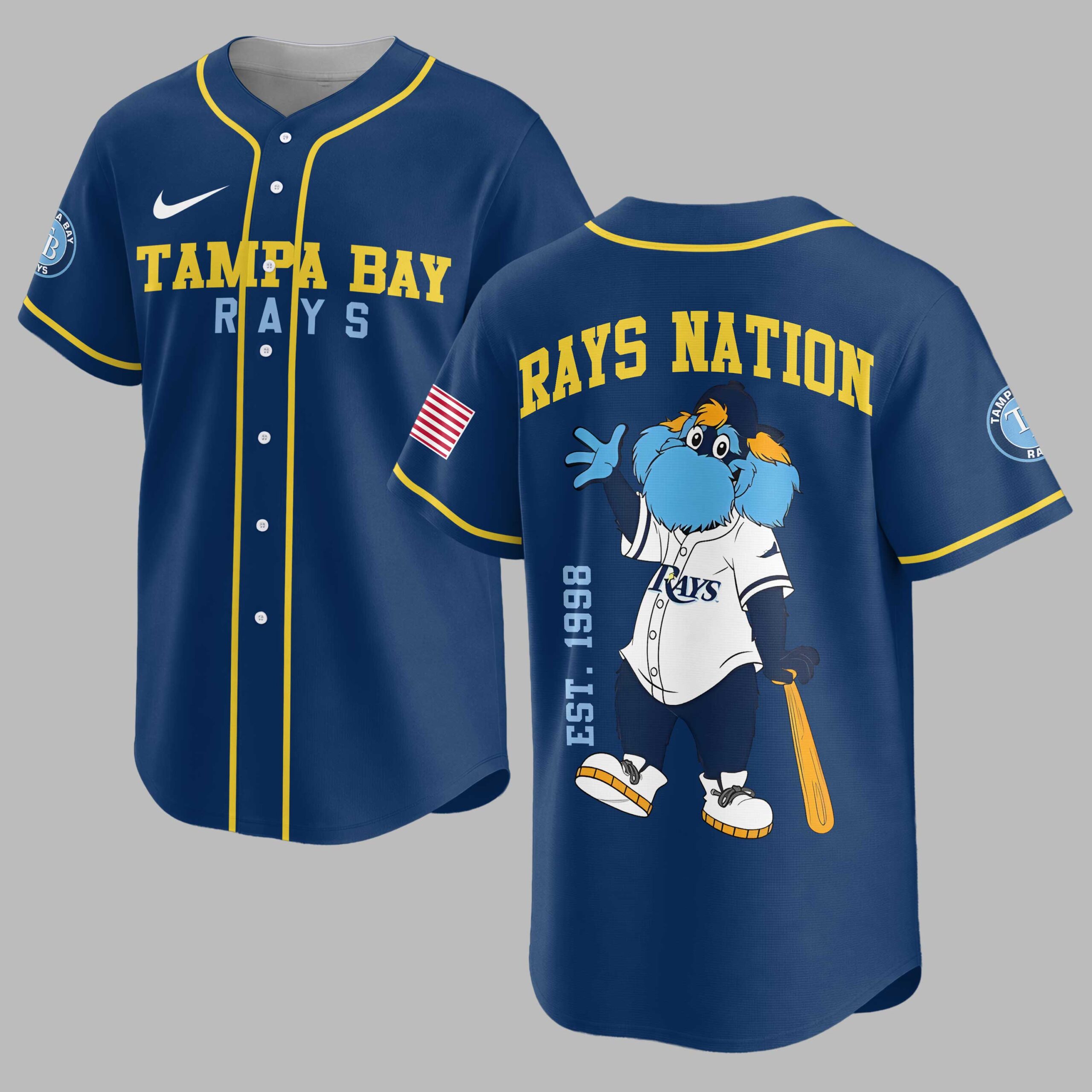 Gear up and show your ultimate Tampa Bay Rays pride with this vibrant baseball fan jersey! Perfect for every devoted supporter, this jersey embodies the energetic spirit of the Rays and lets you celebrate your favorite team in style, whether you’re at the stadium or watching from home. The front of this eye-catching jersey proudly features TAMPA BAY RAYS in bold yellow and light blue lettering, topped with a striking yellow Nike swoosh. The sleeves are adorned with a patriotic American flag patch on one side and the classic A BAY B RAYS circular emblem on the other, all framed by crisp navy blue piping. Flip it around to reveal an awesome back design showcasing a playful blue Rays mascot, ready to swing his bat, beneath the rallying cry RAYS NATION and EST. 1998, marking the team’s proud origins. This spirited jersey is your go-to for game days, tailgates, or any occasion where you want to flaunt your team loyalty. It’s an essential piece for cheering on every home run, celebrating every victory, and letting everyone know you’re part of the passionate Tampa Bay Rays Nation!