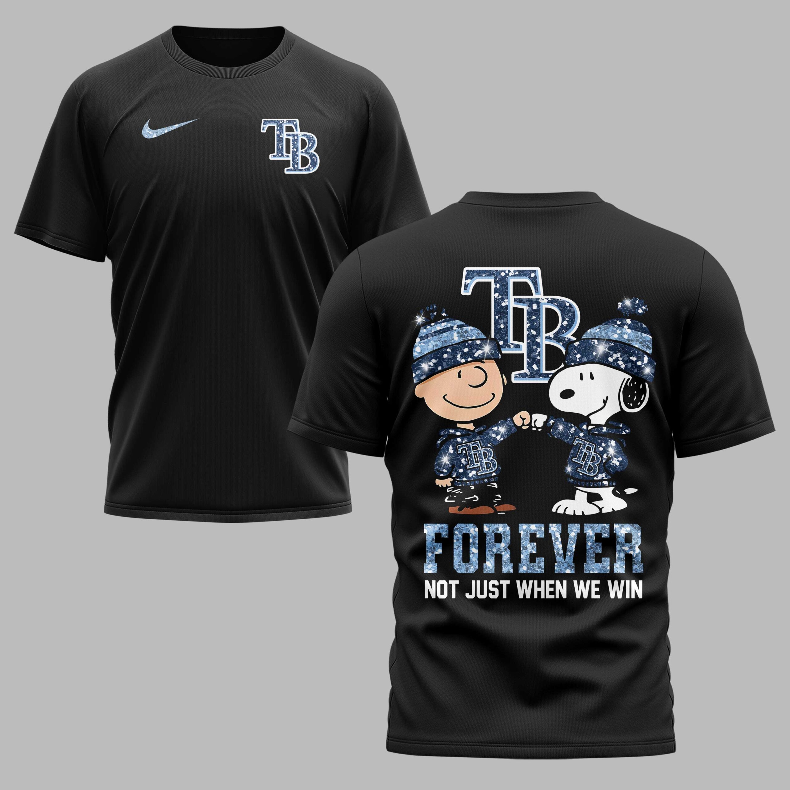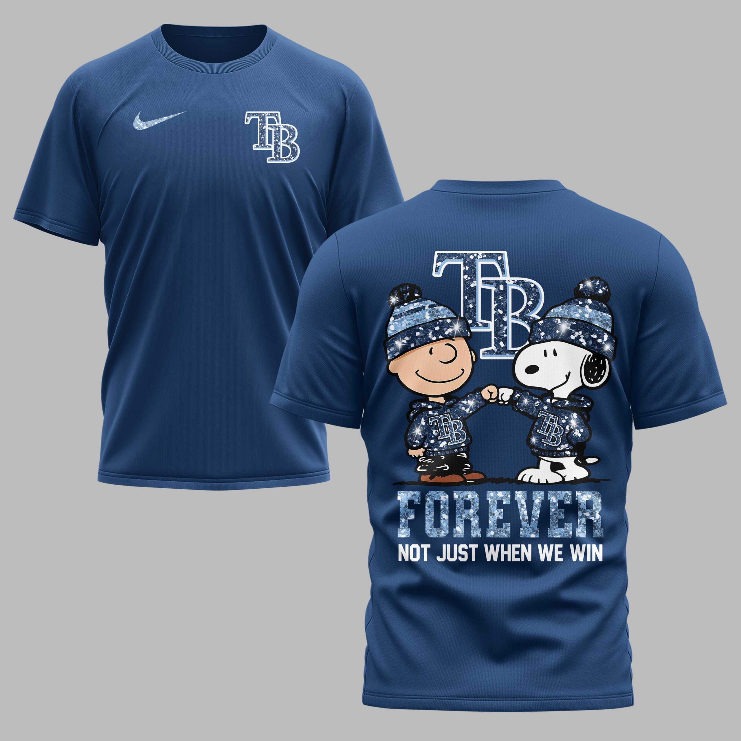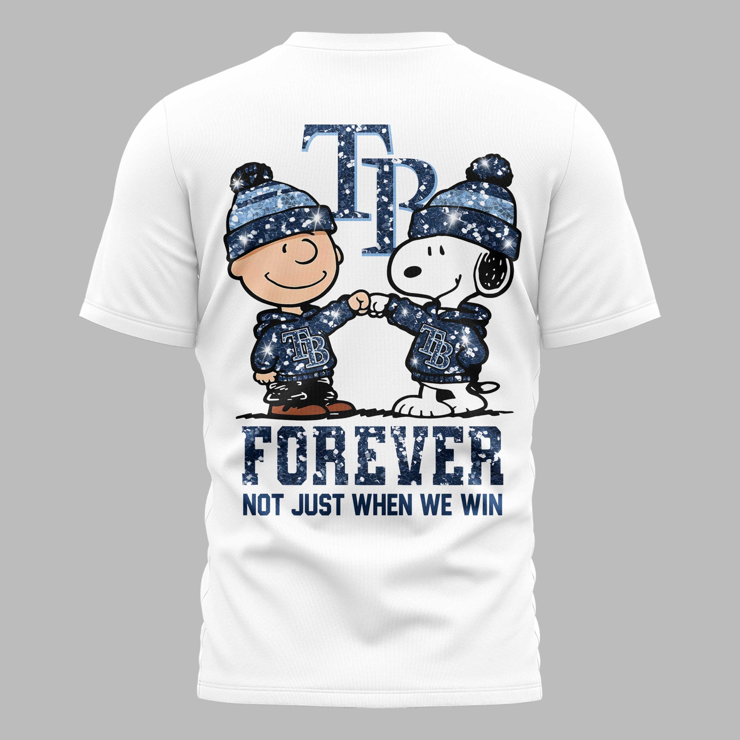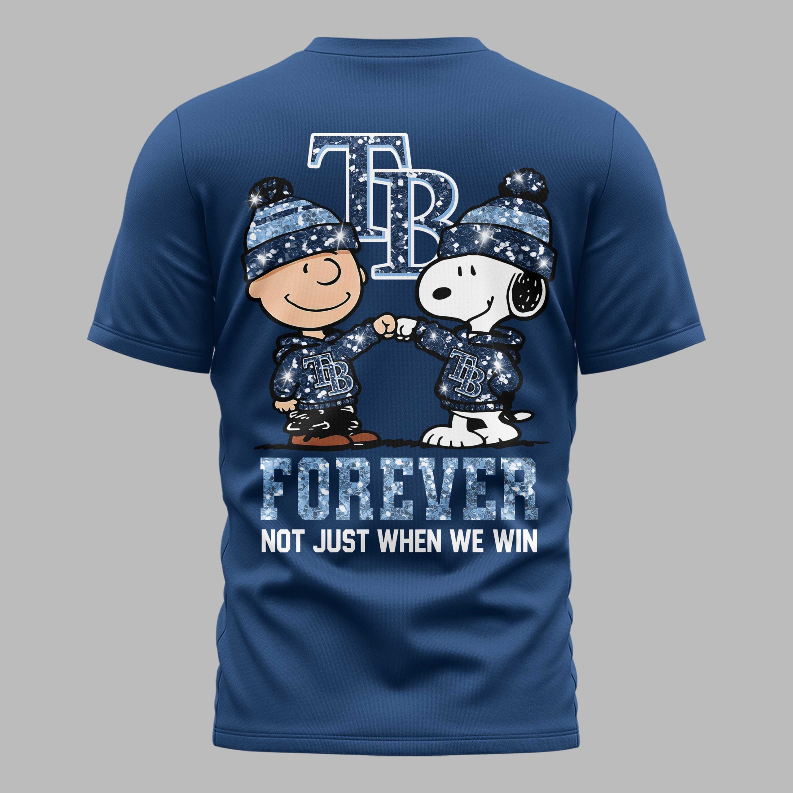 Show your unwavering Tampa Bay Rays spirit with this unique fan t-shirt, blending classic cartoon charm with undeniable team pride! This isn’t just a shirt; it’s a statement of loyalty for every game, every season. Perfect for dedicated fans who cheer on their team through thick and thin, celebrating the true heart of baseball fandom. The front features a stylish, glitter-effect TB logo, signaling your allegiance with a subtle sparkle. The back design brings the excitement, showcasing beloved Peanuts characters Charlie Brown and Snoopy, both sporting matching blue beanies and TB hoodies, engaged in a fist bump of solidarity. Below them, the powerful message FOREVER NOT JUST WHEN WE WIN is boldly displayed in a matching glitter-effect font. Whether you’re heading to Tropicana Field, hosting a game-day watch party, or simply out and about, this tee is the perfect way to flaunt your Tampa Bay Rays devotion. It’s an ideal gift for any Rays enthusiast or Peanuts collector looking to combine their passions with authentic team spirit.