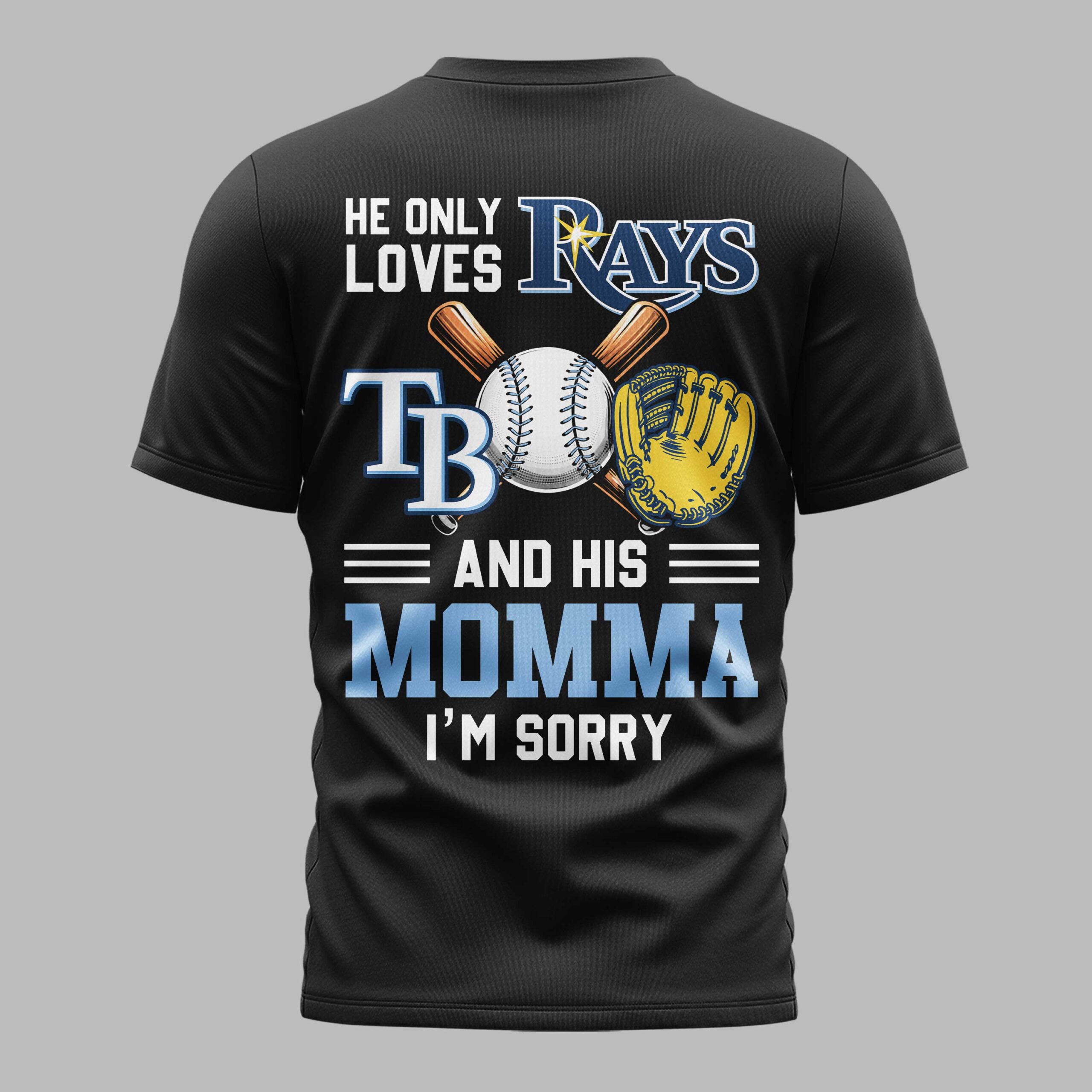 Show your unwavering loyalty to the Tampa Bay Rays while celebrating the American spirit with this bold fan favorite. This tee perfectly combines your passion for the diamond with a proud, celebratory vibe that captures the heart of baseball culture in Florida. It is a must-have for any dedicated fan looking to represent their team with energy and style. The front features a striking Tampa Bay Rays graphic centered around a classic baseball design and the iconic team logo. On the back, a high-impact graphic declares, He only loves Rays and his Momma, I’m sorry, flanked by crossed bats, a golden glove, and the official TB insignia. The light blue and yellow accents pop beautifully, ensuring you stand out in the stands. Whether you’re heading to the ballpark for a divisional matchup, celebrating Independence Day at a local BBQ, or simply representing your team around town, this shirt is the ultimate choice for everyday wear.