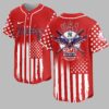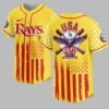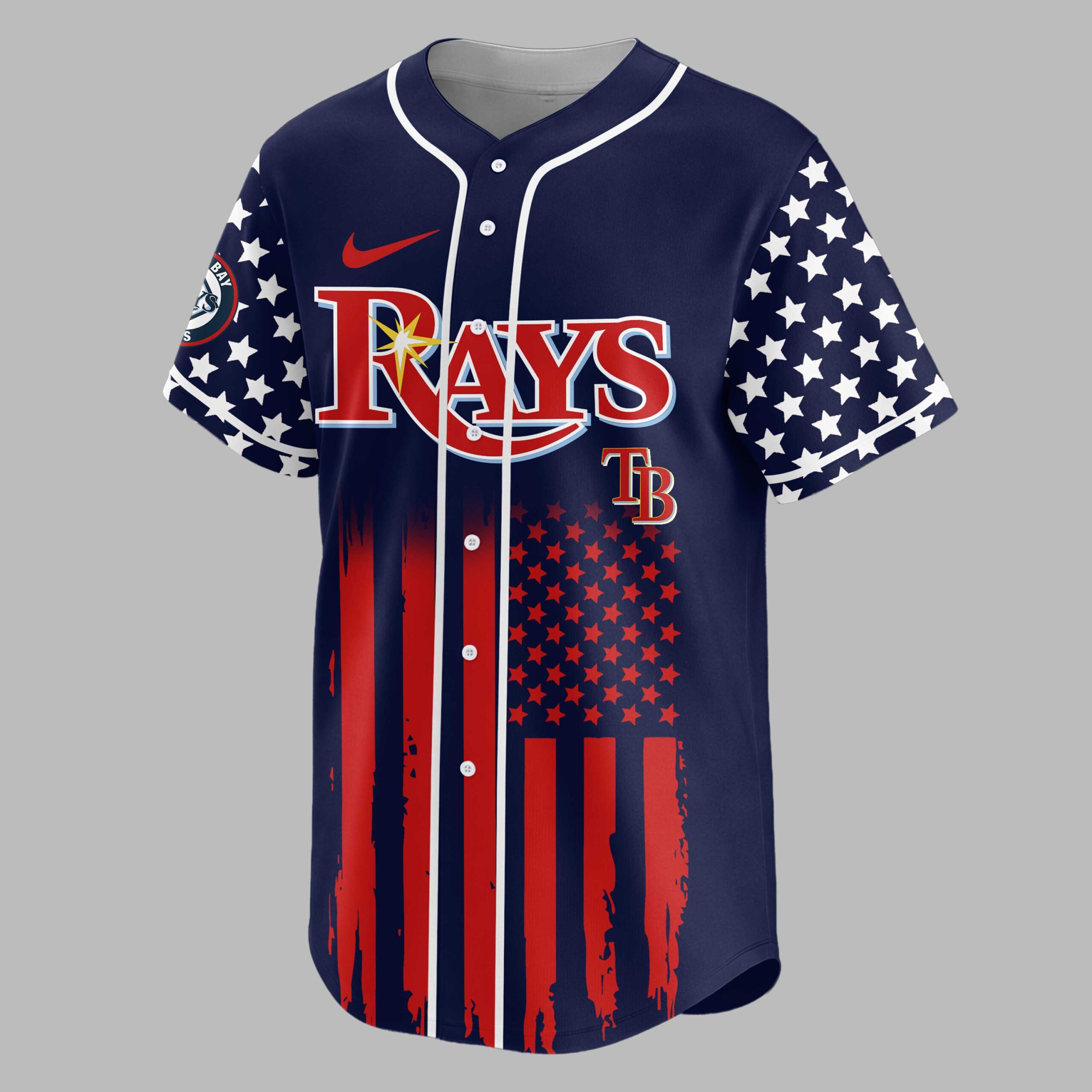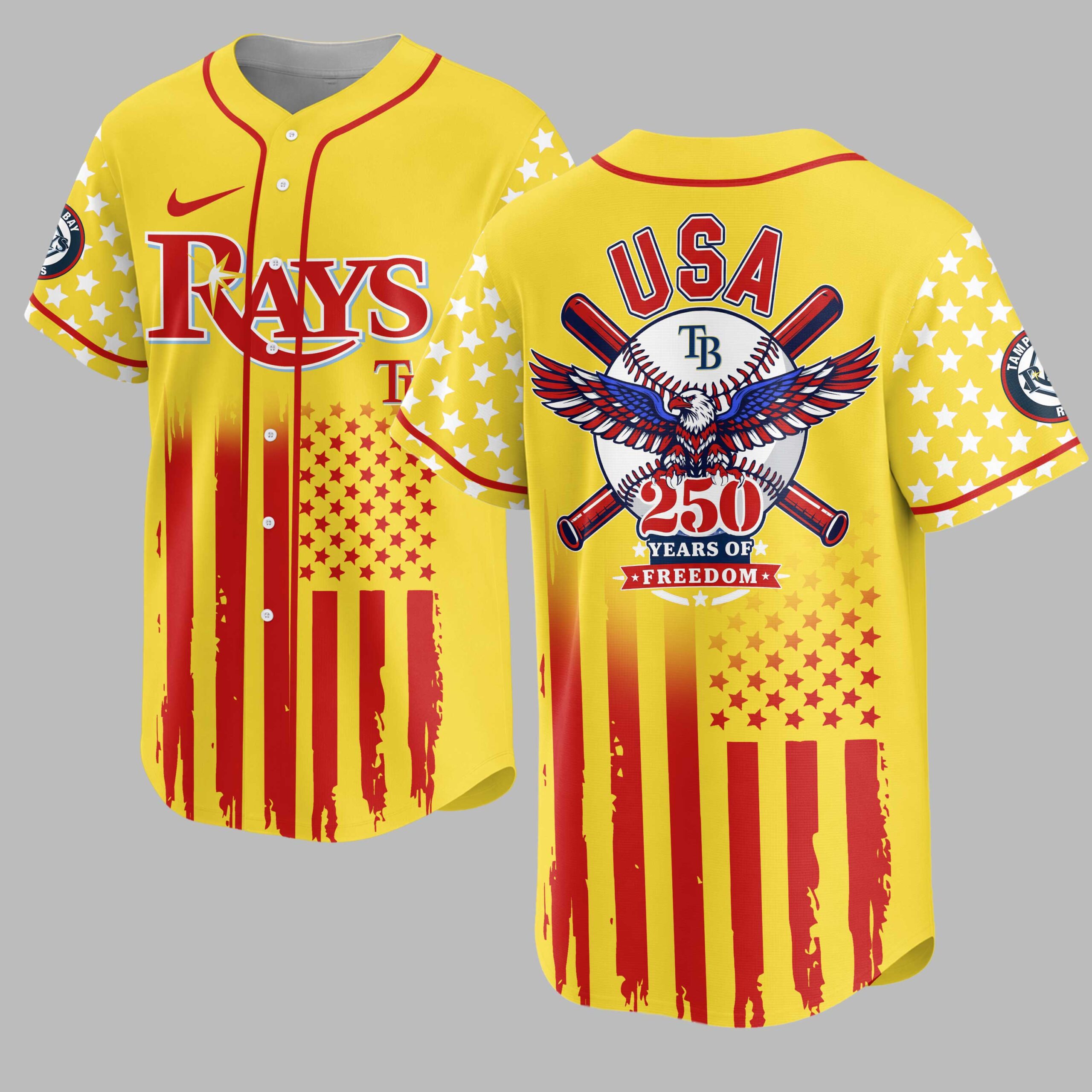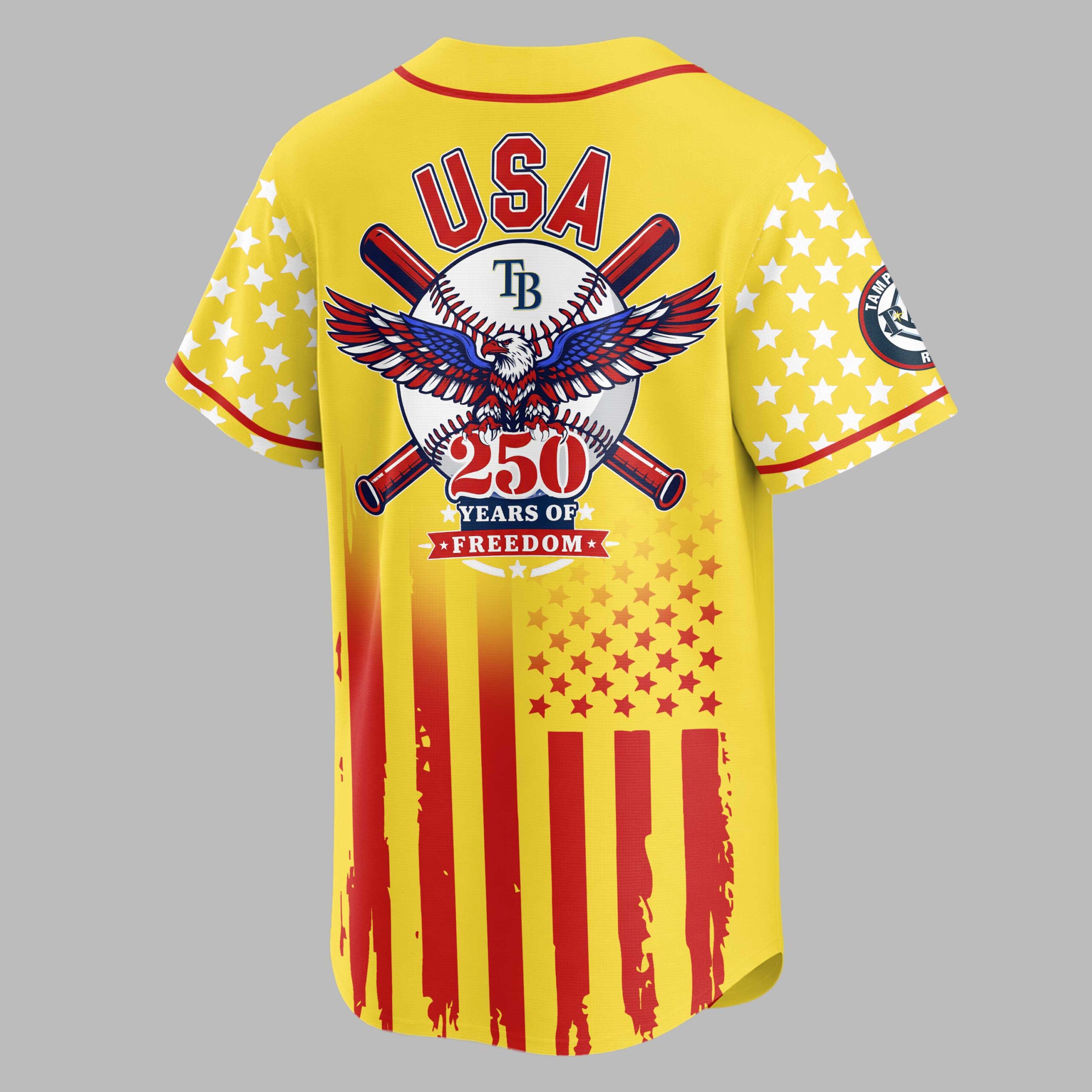 Celebrate your Tampa Bay Rays pride and American spirit with this patriotic baseball jersey. It perfectly blends sports excitement with national heritage, ideal for fans honoring their team and 250 years of freedom. The front features the RAYS logo with a lightning bolt, over distressed red/blue stripes and white stars. Sleeves display the Rays emblem. The back shows USA over a baseball with TB logo, crossed bats, a majestic eagle, and 250 YEARS OF FREEDOM. Perfect for game days, Fourth of July, or any event showcasing your enthusiasm. Wear it to summer barbecues, parades, or daily to represent your passion for the Rays and your country.