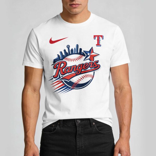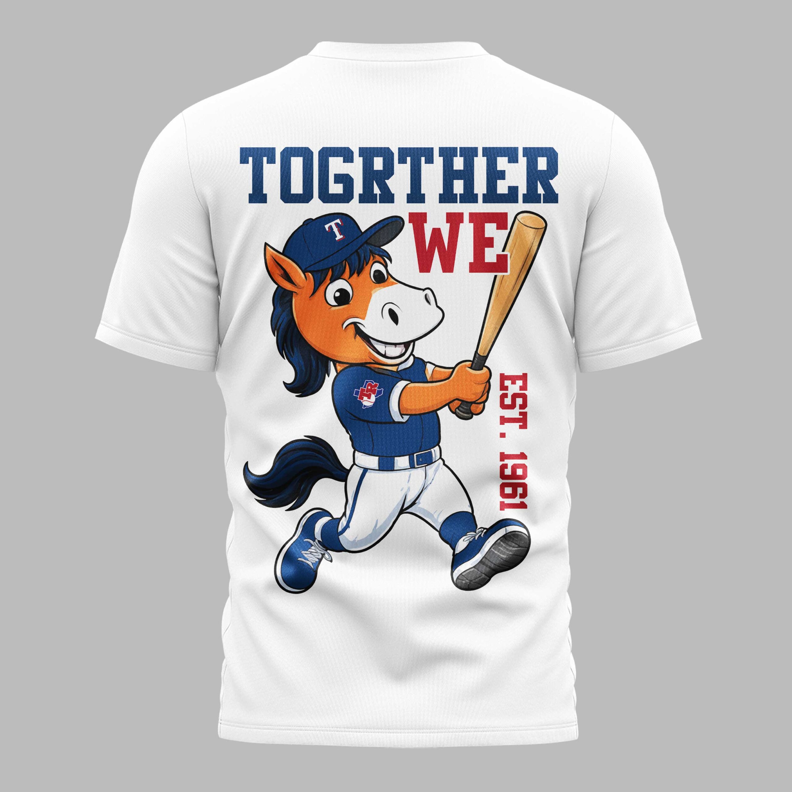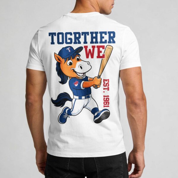 Hit a home run with your style and show off your unwavering Texas Rangers pride! This dynamic tee celebrates the spirit of your favorite baseball team with a bold, energetic design perfect for any fan. Embrace the excitement of game day and let everyone know where your loyalty lies. The front of the shirt showcases the iconic Rangers text, sweeping around a classic baseball, all set against a vibrant city skyline and a patriotic star motif. On the back, an enthusiastic horse mascot, dressed in a baseball uniform and cap, is ready to swing for the fences. Below this spirited character, the text TOGRTHER WE EST. 1961 declares a long-standing legacy of team dedication. Whether you’re cheering from the stands at the ballpark, catching the game with friends, or simply stepping out to run errands, this shirt is your ultimate fan gear. It’s ideal for game days, watch parties, or any casual occasion where you want to represent the Texas Rangers with pride and passion.