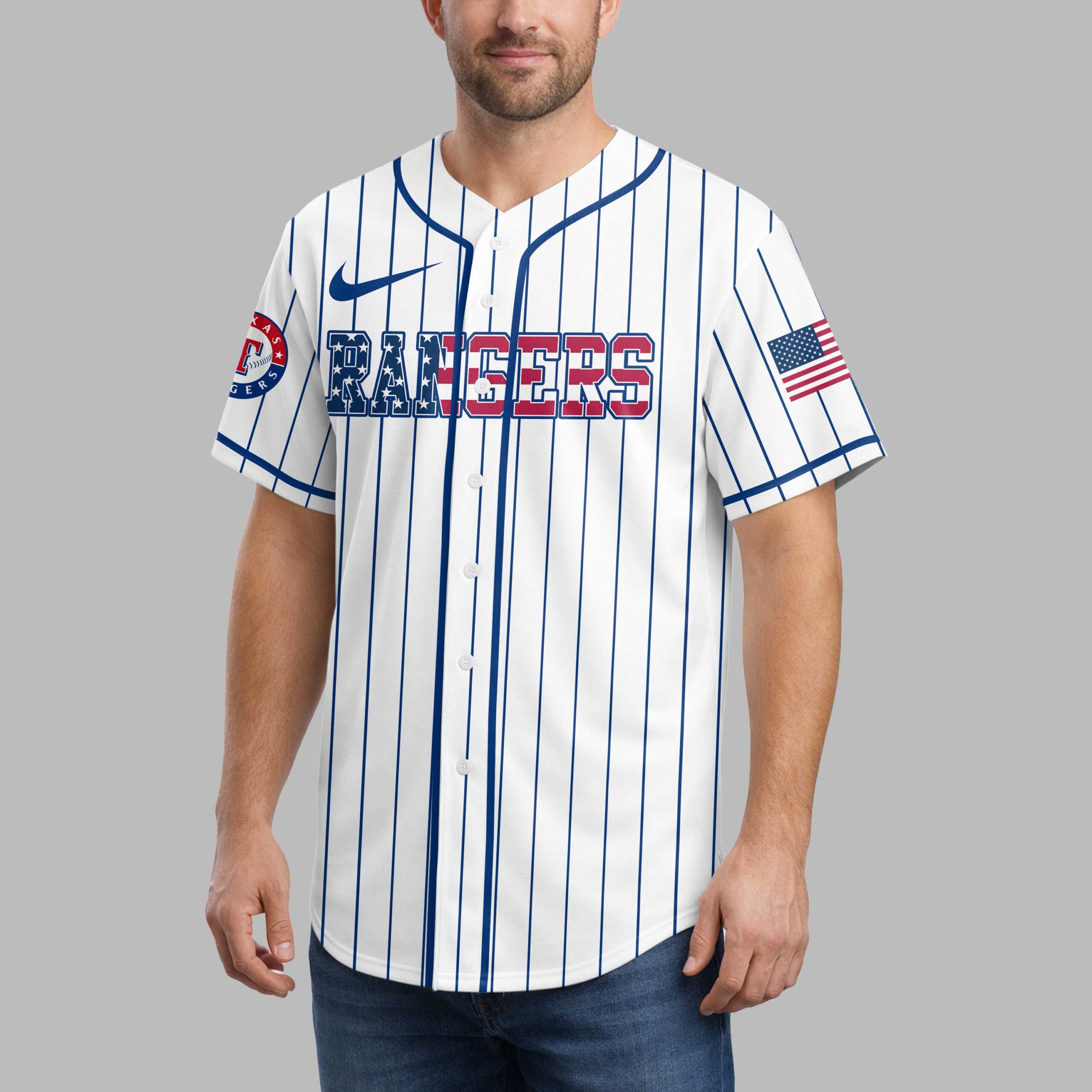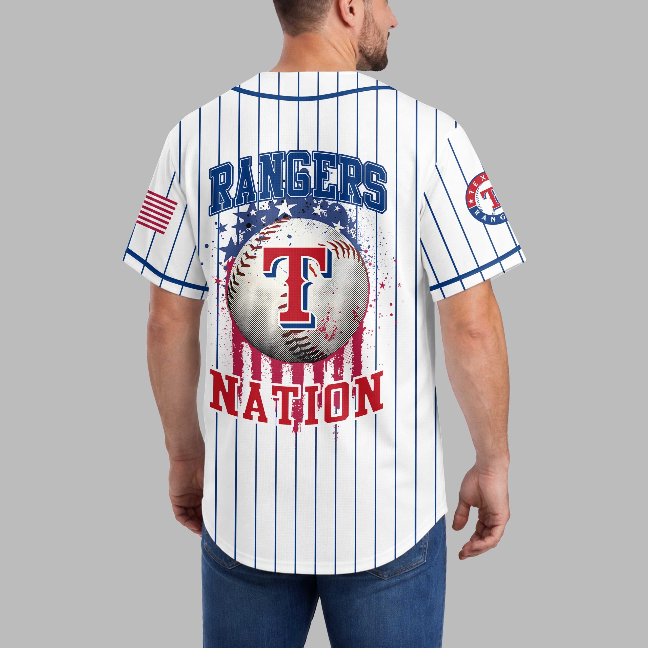 Unleash your ultimate Texas Rangers spirit with this patriotic jersey, designed for every devoted fan! Show your unwavering loyalty to the team and your country, blending baseball passion with American pride in one powerful statement. It’s the perfect way to stand out whether you’re at the ballpark or celebrating a national holiday. The front proudly displays ‘RANGERS’ in a bold, blue and starry design, outlined in red, complemented by the iconic Texas Rangers logo on the left sleeve and a classic American flag on the right. The back makes an even bigger statement, featuring a large baseball with a prominent ‘T’ against a vibrant backdrop of red and blue splatter and stars, with ‘RANGERS’ above and ‘NATION’ below, truly capturing the essence of team and country. This vibrant jersey is ideal for cheering on the Rangers at Globe Life Field, hosting a game day barbecue, or joining Fourth of July festivities. It’s a fantastic choice for anyone looking to express their dual pride in American baseball and the great state of Texas, making it a must-have for game days, national celebrations, or just everyday wear.