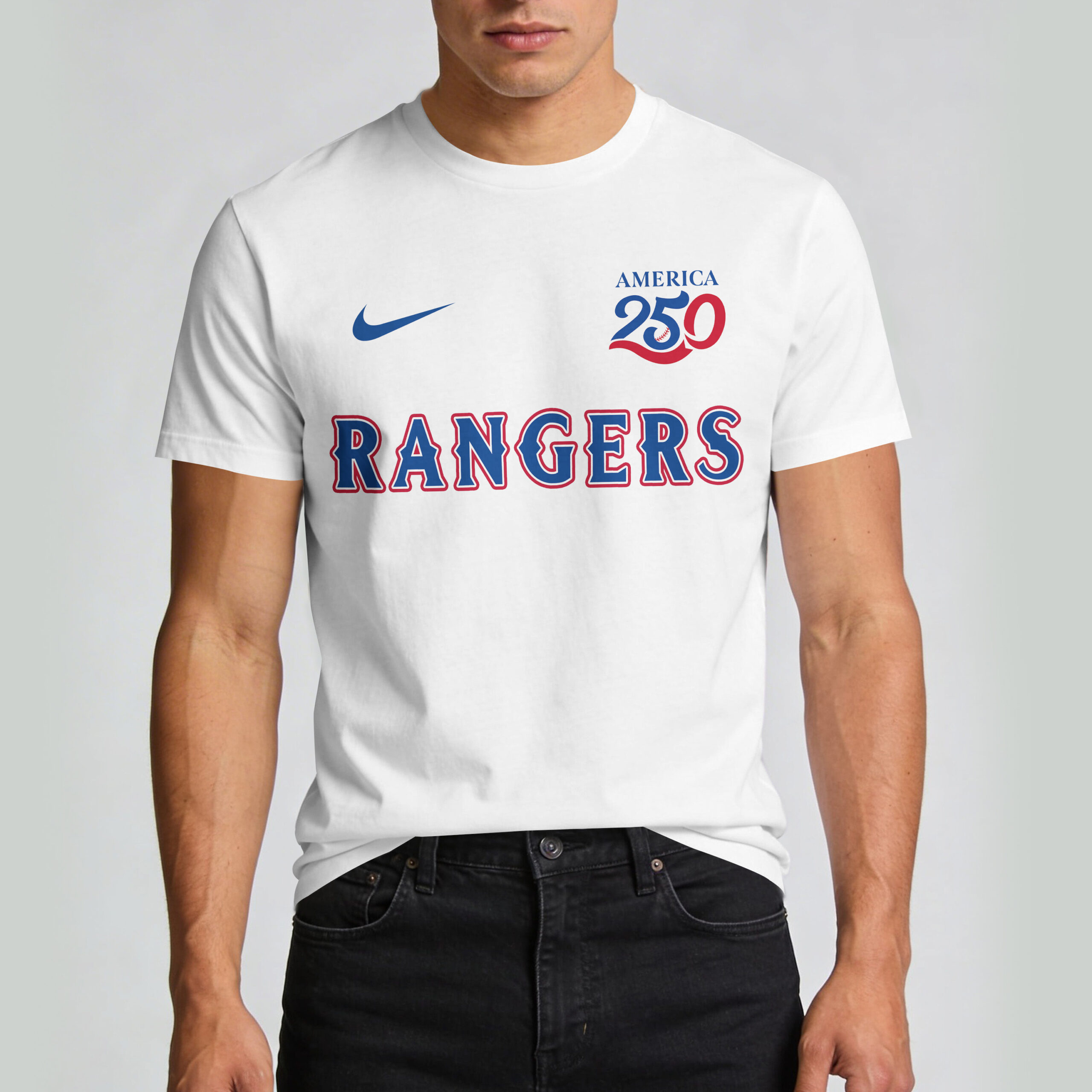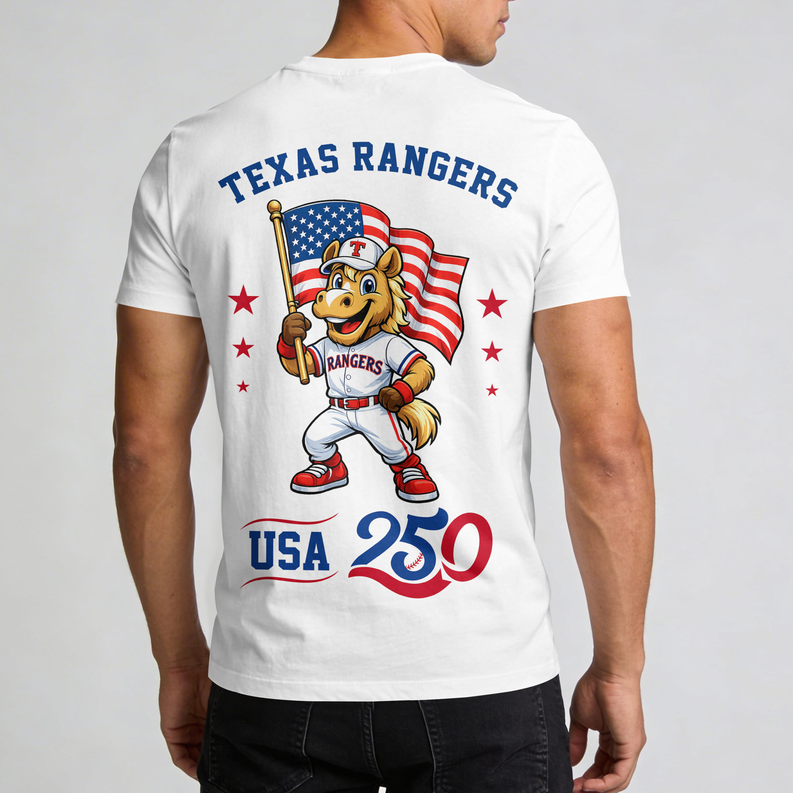 Show your unwavering loyalty to the Lone Star State’s finest while celebrating a historic milestone for the nation. This Texas Rangers t-shirt perfectly blends your passion for baseball with a deep sense of American pride, honoring the USA 250 anniversary in style. It’s a bold statement piece for any fan who wants to represent their team and country simultaneously. The front features the classic RANGERS wordmark in bold team colors alongside the official America 250 logo. Flip it around to find a dynamic graphic of the team’s beloved horse mascot proudly hoisting the Stars and Stripes. Surrounded by patriotic red stars and the Texas Rangers name, the back design is anchored by a large USA 250 graphic, ensuring you look great from every angle. Whether you’re heading to the ballpark for a summer doubleheader, hosting an Independence Day barbecue, or just showing off your team spirit around town, this shirt is the ultimate choice for everyday fan wear.